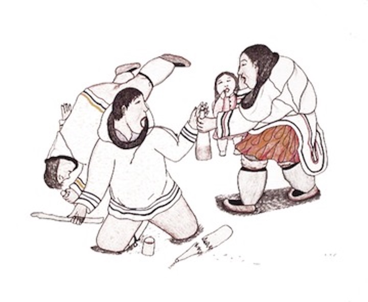 Alcohol abuse has affected cultures and families across the globe. It is not a problem indicative of one group of people alone. Although Indigenous peoples were introduced to alcohol by Europeans and those of European background, unlike them, they did not have a tolerance to it built up over generations and were more susceptible to its effects. Nonetheless, despite the fact that alcoholism is a cross-cultural issue that is not confined to one race, nationality, or religion, the Indigenous people of the Americas have often been unfairly stereotyped as drunkards. It is no wonder, then, that among the Inuit, as with other Native groups, exposing this delicate and painful issue to the outside world is problematic. Despite facing condemnation from their own community and the possibility of reinforcing a negative stereotype in the world beyond the Arctic, a number of Inuit artists have chosen to address the topic of alcoholism in their art. Having done so is nothing less than courageous.