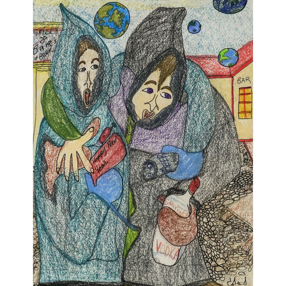 Composition (Smirnoff Vodka) by Shuvinai Ashoona is a more recent take on the problem of alcohol consumption among the Inuit. At the time I acquired this drawing in the spring of 2022, I already had five drawings and fourteen prints by the artist in my collection. However, this particular work struck me as something else again. Much of Shuvinai’s work is fantastical and often contains elements of the surreal and whimsical. At times, she seems downright obsessive about even the smallest details in her work. Composition (Smirnoff Vodka) makes the viewer aware of the ills of alcohol consumption with regard to the Inuit, but it does so subtly. Shuvinai indicates what the two figures in the drawing are celebrating by the red paper the person on the left is holding, which reads “Happy New Year.” Behind this person is a sign stating “Grill’s & Bar’s And Beer.” (The apostrophe used in the words Grill’s and Bar’s is grammatically incorrect, for plural words in English, but it doesn’t really matter. English is not Shuvinai’s first language and such errors simply add to the charm of her work. In addition, with the word Grill’s Shuvinai may actually have meant Girls.) The Inuk on the right side of the drawing is holding a bottle with the words Smirnoff Vodka, and behind him on a building is the word Bar. The two figures hang on one another, clearly drunk, but what makes this work strangely compelling is the look on each face, which gives this work an expressionistic quality. Shuvinai, being the artist she is, packs a great deal into her art. Hovering above the scene are four spheres that resemble Earth. These enigmatic planets make an appearance in a number of Shuvinai’s works. What they represent is anybody’s guess and their meaning may change depending on the print or drawing in which they appear.