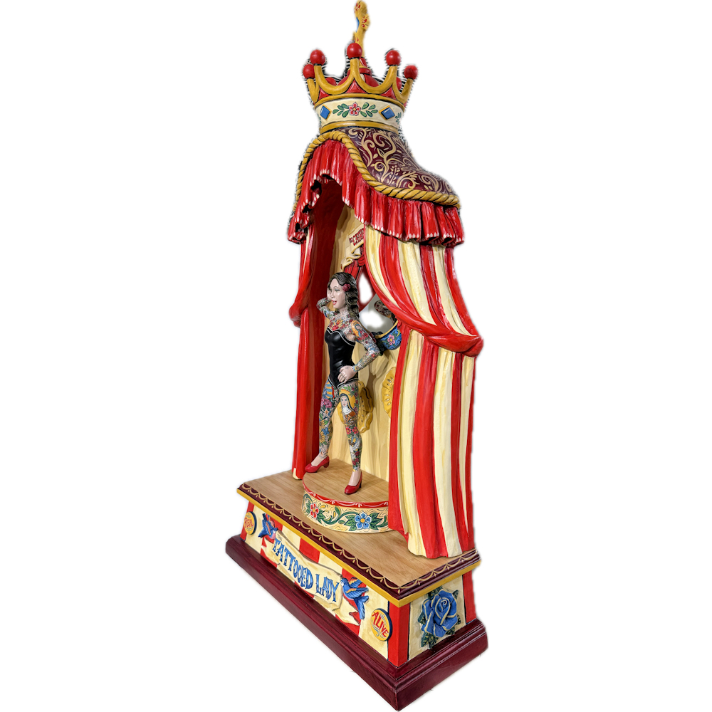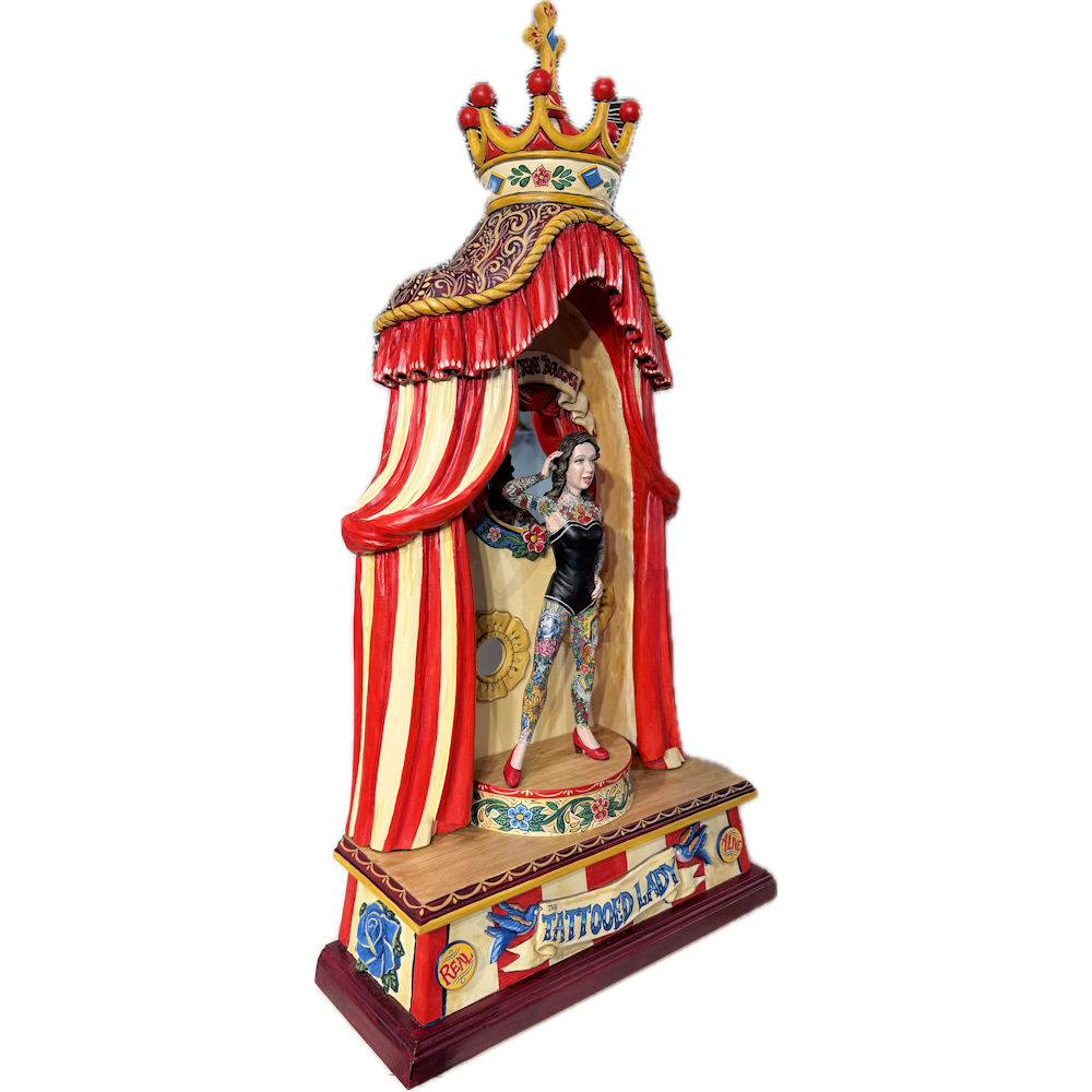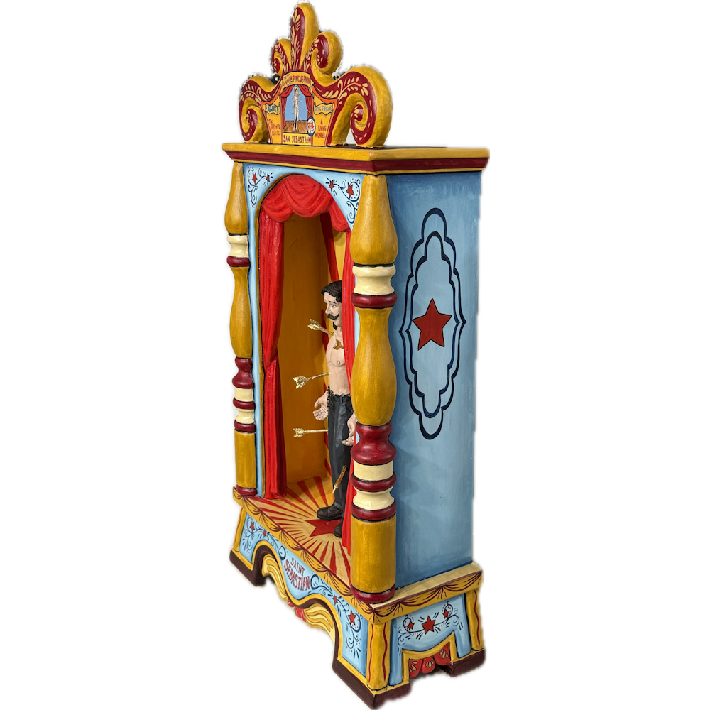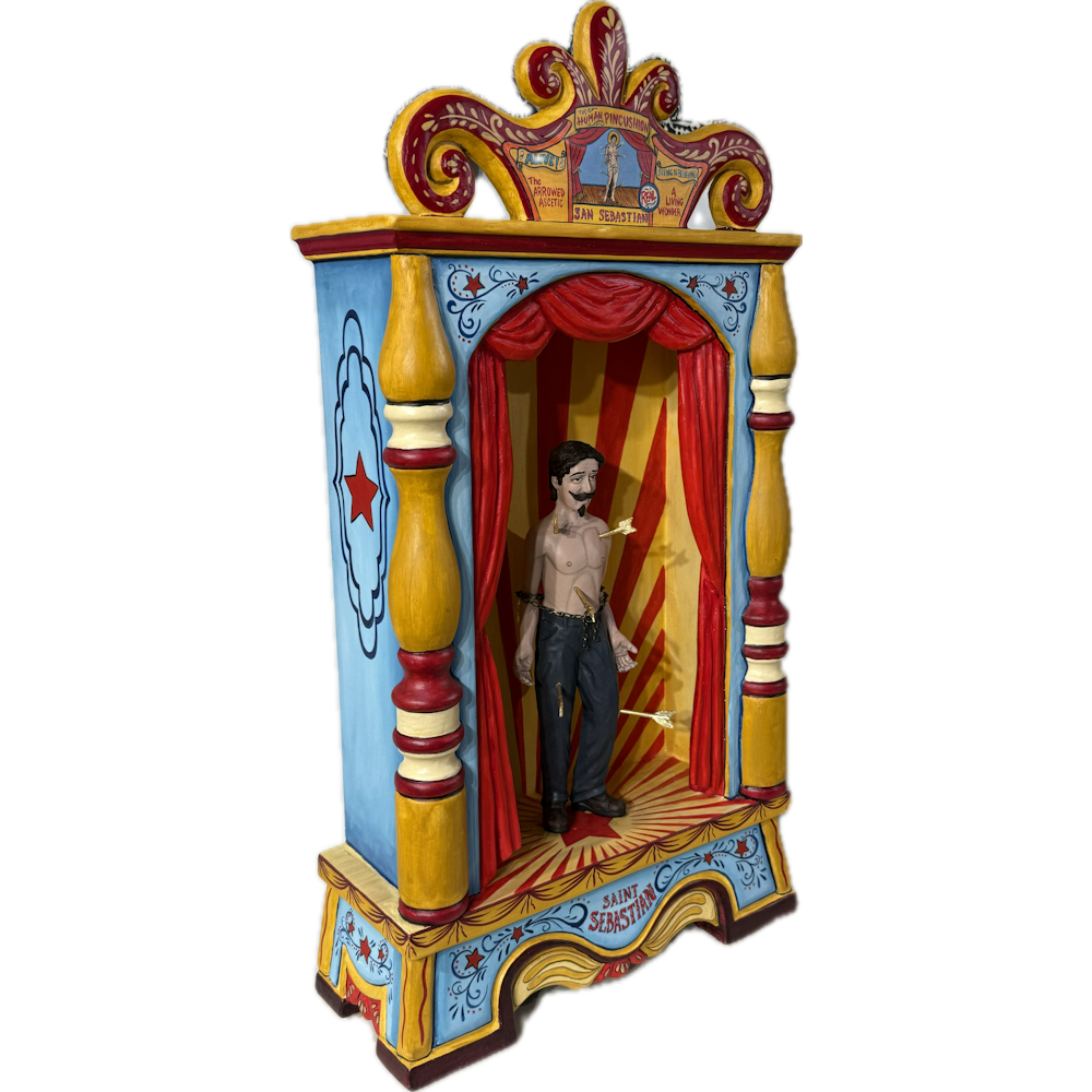 Lopez pulls back the circus curtain by inviting viewers into the world of circus sideshows, or (Freak-show) as it is sometimes referred to Circus sideshows are known for their bizarre and unusual acts that include people with unusual physical characteristics or conditions that were often considered “Freaks of Nature” or “Beyond Natural”. This concept sparked the theme for “Sideshow Saints.” Just as the sideshow spotlighted individuals with extraordinary characteristics, the lives of the saints are filled with equally extraordinary tales of martyrdom, miracles, and divine intervention. This parallel forms the foundation of the exhibition, where each figure is masterfully carved and painted with careful attention to their traditional attributes, reinterpreted within a sideshow setting.