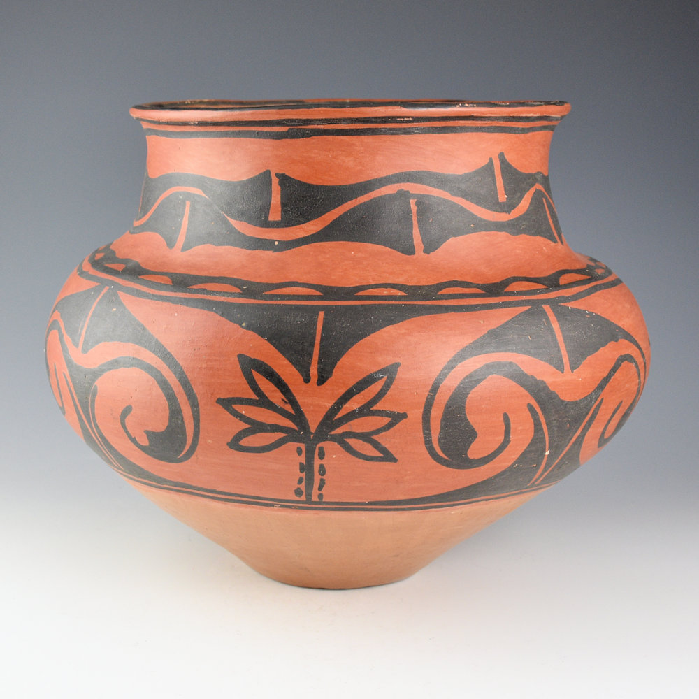 Black-on-red vessels, with a polished red surface and black painted designs, were less common. The paucity of colors created a greater reliance on form and design to capture the eye of the viewer. Only the most adept of the San Ildefonso potters made pieces in this style. San Ildefonso pottery made before 1920 was not signed by the potters. This raises the question of how to identify individual potters. Each had distinctive shapes for which they were known, including a unique style of elongated neck, shoulder, polishing (or not) on the inside of the neck, or a specific color on the rim. Equally, designs were a “signature,” with the painter often using specific imagery, such as thin lines or bolder strokes, or distinctive spacing of designs on the vessel.