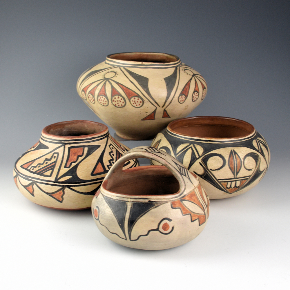Florentino and Martina’s niece, Dolorita Vigil (1883–1918), was not a prolific potter but followed in their distinctive style of fully designed pottery. Her career as a dressmaker seems to have influenced her painted designs, which often appear to have the quality of “embroidery” in the placement and flow of designs and the painted inner rims of her vessels.