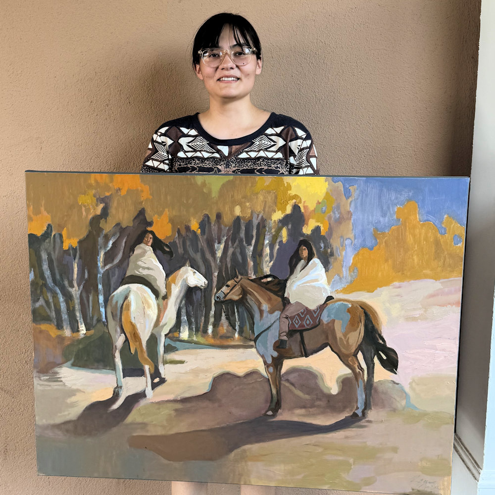 Her Artistic influences are Native Americans in natural environments based off of her home, Rocky Boy Montana. Some of her favorite artists are Jerry Jordan, James Meade, and Eric Bowman. She first became interested in art when she wanted to capture the feeling of the landscape. She wants viewers to sense a story of reconnecting with yourself, no matter how long it takes. “Sometimes we lose ourselves through grief and hardship, but we must always find our way back to our homes. ”