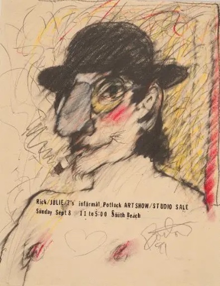 In this work, Bartow presents himself in a bowler hat, smoking a cigarette, his large nose and iconic eyeglasses prominent. He is bare chested, his nipples a bright pink and between them he has drawn a heart. He appears to be looking slyly out at the viewer. Around his image he as made a variety of lines and squiggles, which he referred to as mark making. He also signed and dated the piece on the lower part of the page near one of the figure’s nipples. In addition to writing, “Rick/JUILIE/?’s informal Potluck ART SHOW/STUDIO SALE” across the chest of this self-portrait, Bartow also wrote the day of the week, the date, the time and the place of the sale: “Sunday September 8 11 to 5:00 South Beach.”
