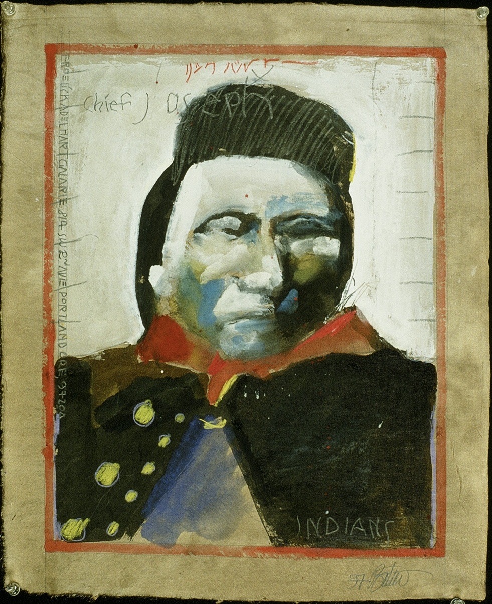 Indians: Chief Joseph (Poster) by Rick Bartow, Wiyot, mixed media on nao paper, 19” x 16” (1997). Image courtesy of the Froelick Gallery, Portland, OR.