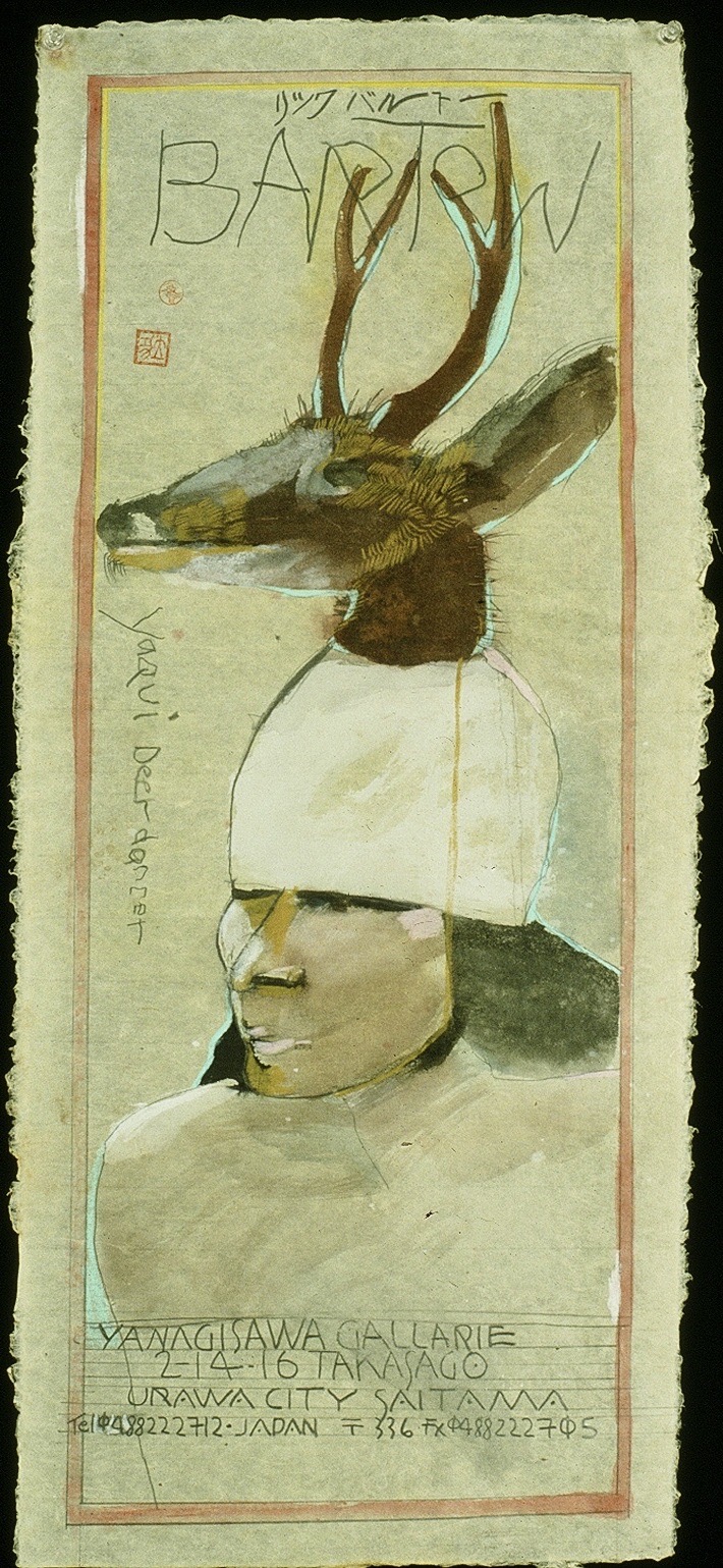 Yaqui Deer Dancer was the basis for a poster for an exhibit at the Yanagisawa Gallery in Urawa City, Saitama Prefecture, Japan. Bartow wrote the galleries contact information on the lower part of the page under the image. Along the left side of the page he wrote the work’s title and also placed his two personal chops. At the very top of the page there are Japanese characters and the name Bartow written in capital letters. Once again, Bartow used a “framing device” to contain the image and the information he wanted to publicize.