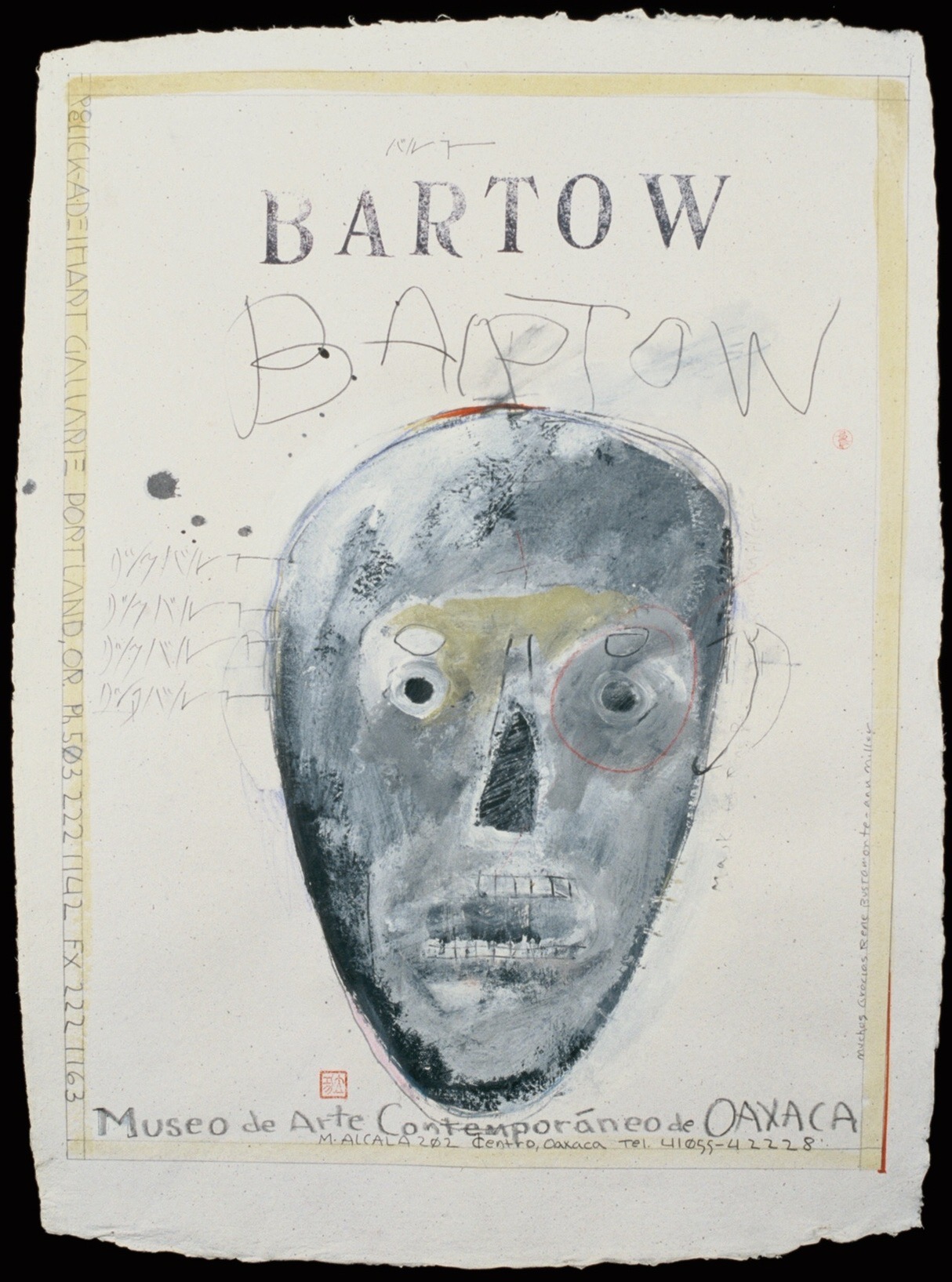 In addition to the name and address of the Froelick-Adelhart Gallery, written within the work’s “frame,” Bartow also wrote “Museo de Arte Contemporaneo de Oaxaca” and the museum’s address below the mask and this time only used one of his personal chops – the square one. On the left side of the mask there are four lines of Japanese characters and on the right side Bartow has drawn what appears to be the outline of an ear, making the image of the skull darkly humorous. Above the mask is the name Bartow done three ways: first is Bartow’s signature; under it is a stenciled version done in capital letters; and below that the name is also printed in capital letters. The work also includes ink splotches and what appear to be stray marks on the paper, but anyone who is familiar with Rick Bartow’s work would be well aware that they are all part of his “mark making,” an integral part of his art. In a poem, Bartow wrote the following: “I pull the marks up and use them like fish to feed my imagination. The marks are sometimes pieces to a puzzle, solutions to little mysteries that signal the completion of an image.”