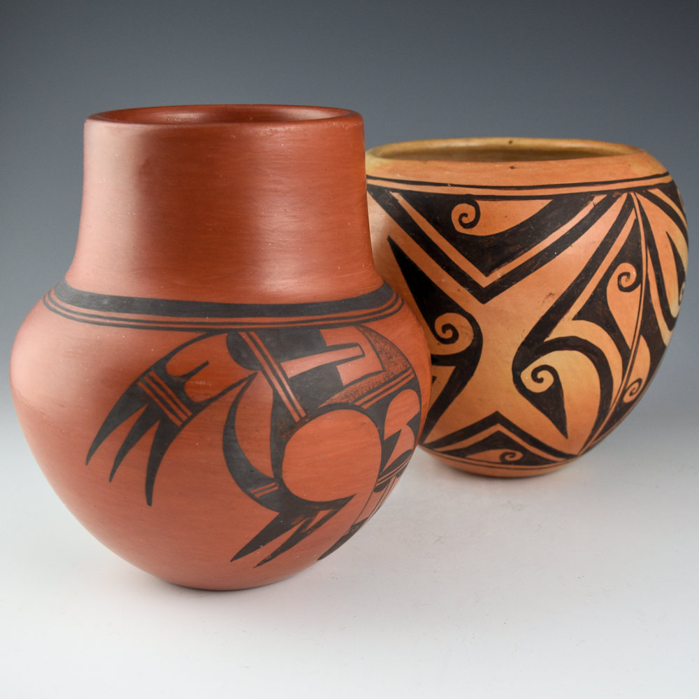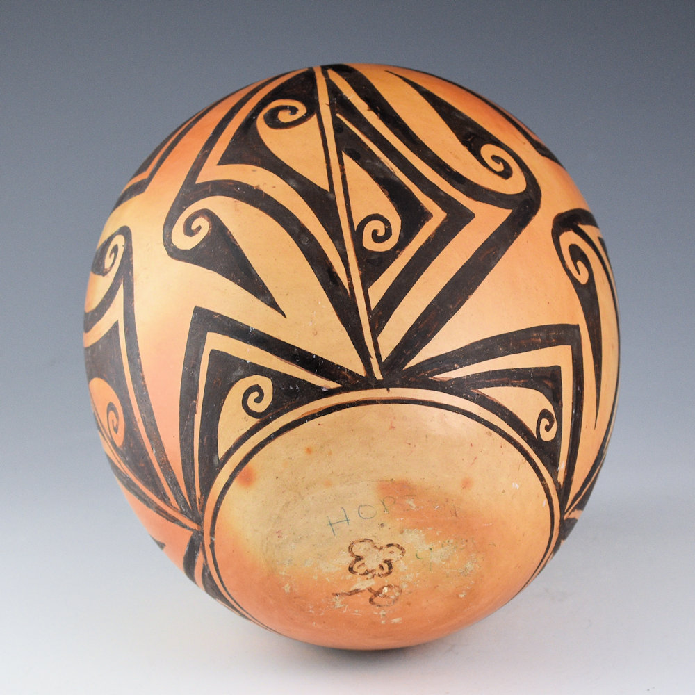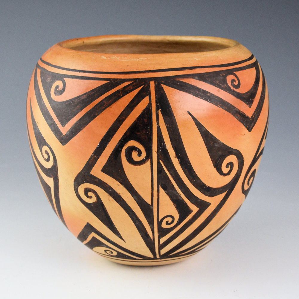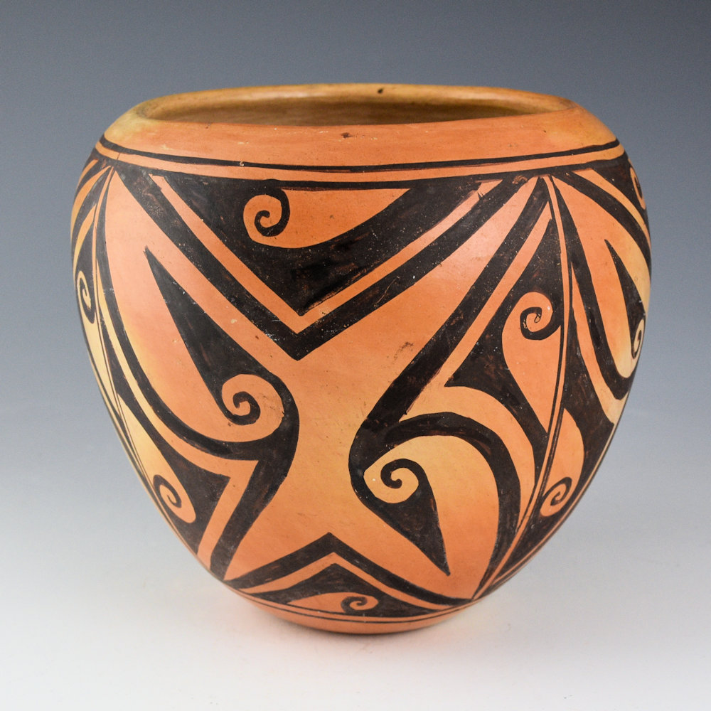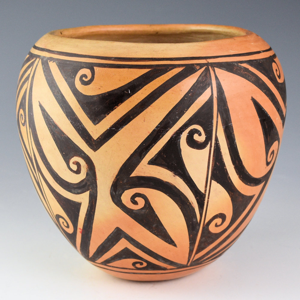 This is an early jar by Sadie Adams. The piece a high shoulder and turned in rim. It is painted with bee-weed (black). The jar has four panels of interlocking birds and clouds. It is creative use of a traditional designs. It was traditionally fired to create the blushes on the surface. The jar is signed on the bottom with her hallmark flower. It is in very good condition with no chips, cracks, restoration, or repair.