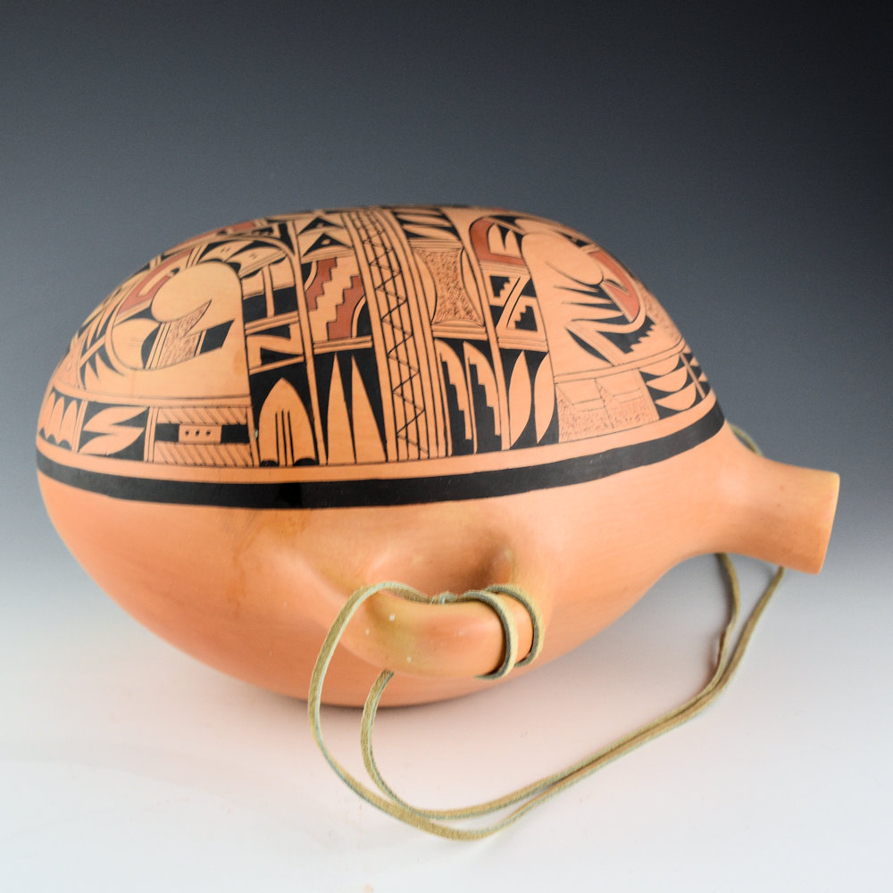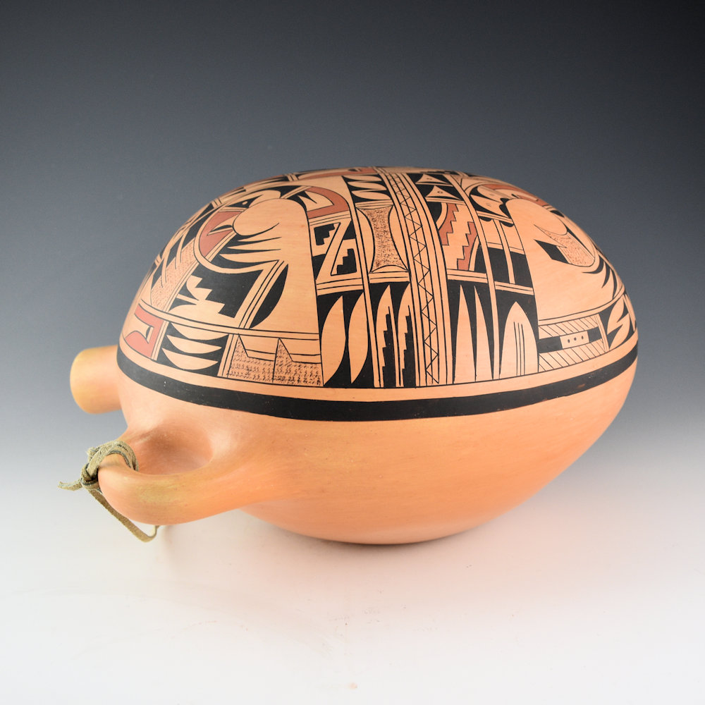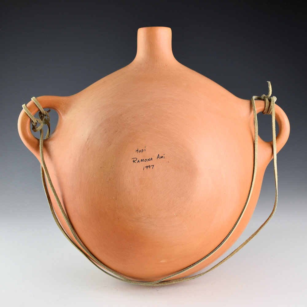 Ramona Ami (b. 1929) was a daughter of Emma and Hale Adams. She learned to make pottery from her sister, Marcella Kahe. She was known for her use of traditional techniques, designs, and outdoor firing. This large canteen is coil-built and painted with bee-weed (black) and a red clay slip. The front has four panels of design, each of which have a swirling bird. They are separated by bands of geometric Hopi-Tewa designs. It is not just a large vessel, but very intricately painted! The canteen was traditionally fired so there are slight blushes on the surface. It is signed on the bottom, “Ramona Ami”. It is in excellent with no chips, cracks, restoration or repair.