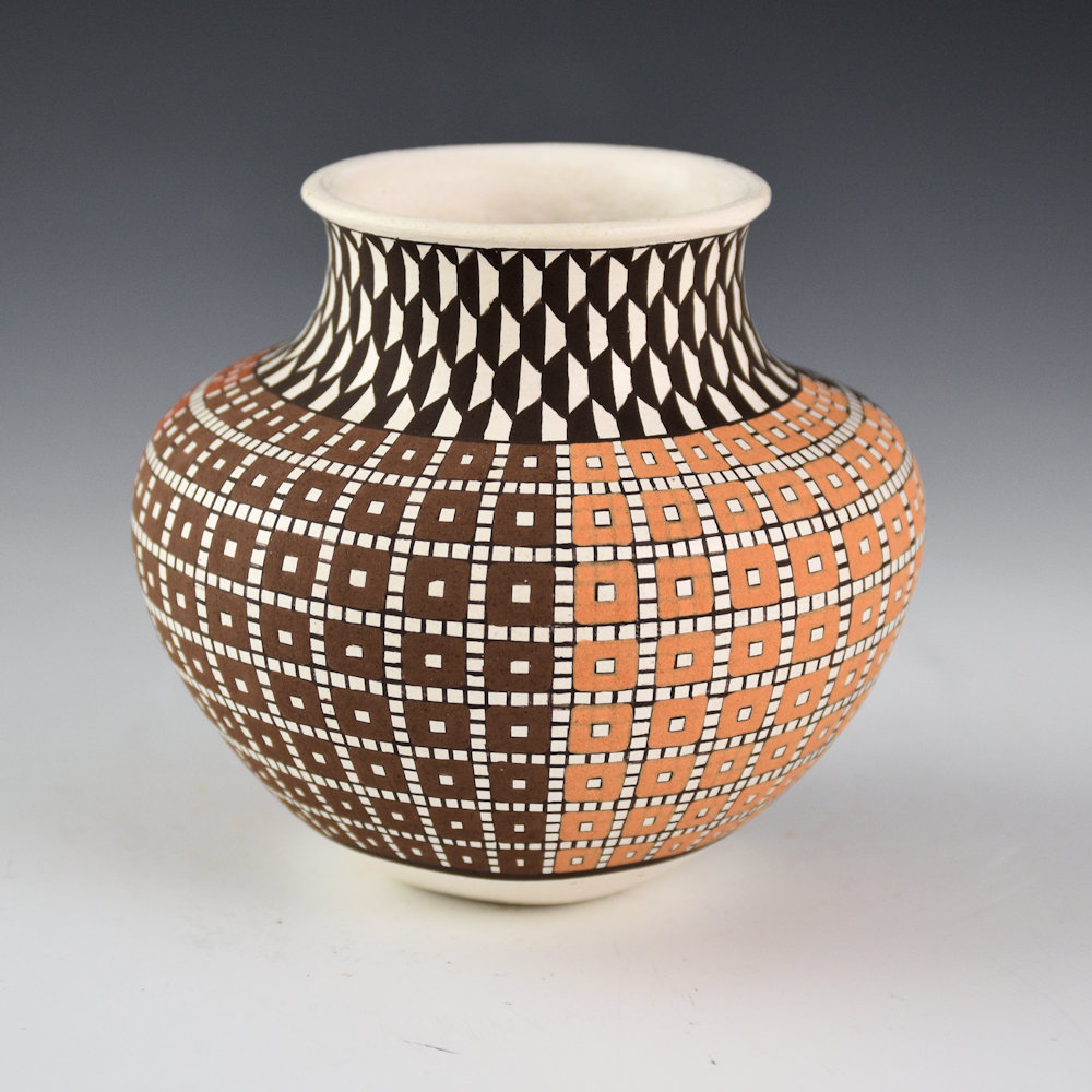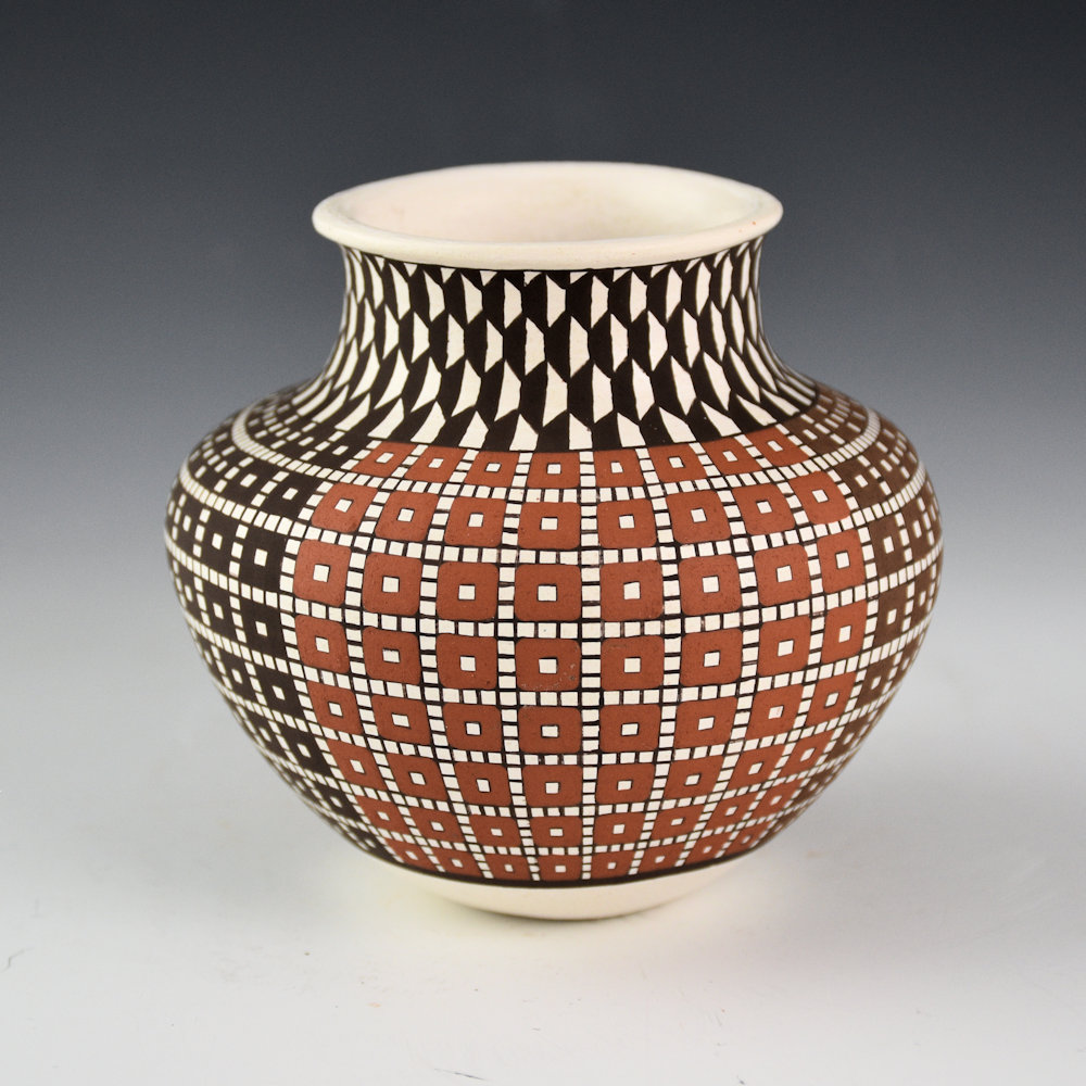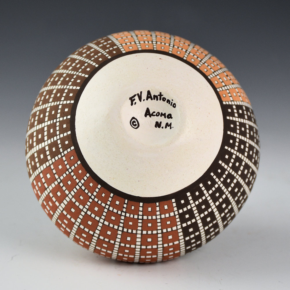 Frederica Antonio is renowned for her intricately painted pottery. Each piece is coil-built and then finely painted. Her designs are a series of fine vertical and horizontal lines which are then filled in to create larger images in the squares. This water jar has the squares painted to represent corn. Each of the colorful sections is a different color of corn, representing a different direction. There are four sections of corn design, each a different color representing the four directions. The neck has the corn husk painted in an interlocking manner. It is a creative use of a classic design. The base of the jar is concave, reminiscent of historic Acoma jars that were carried on the head. The jar is signed on the bottom, “F. V. Antonio”.