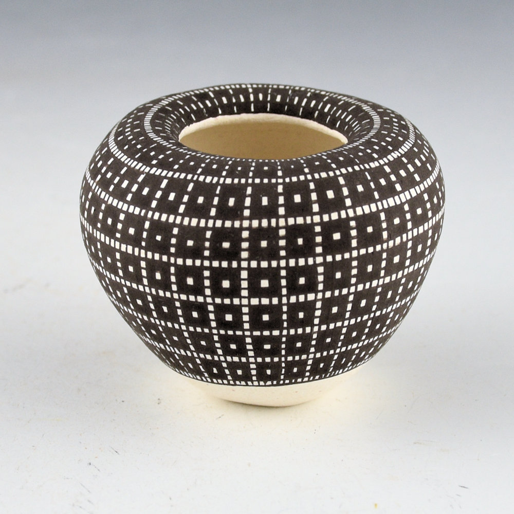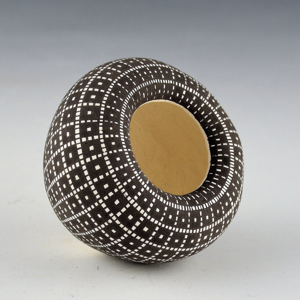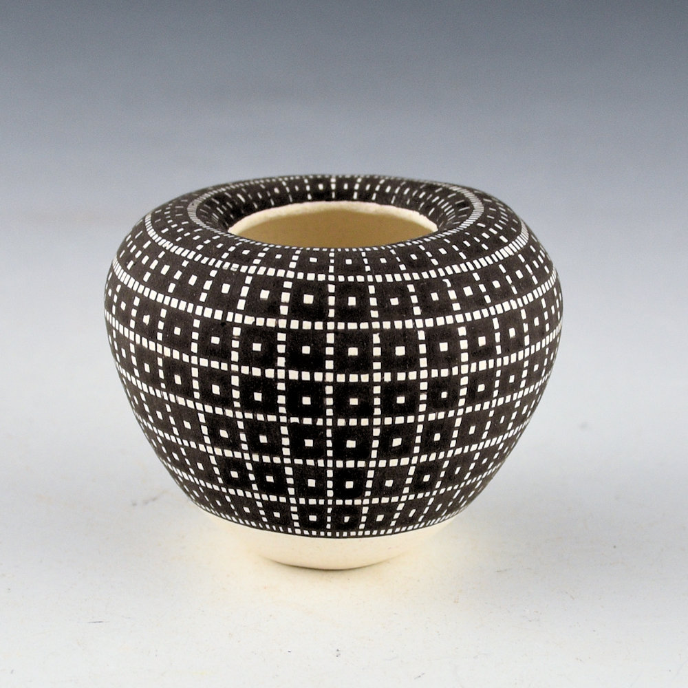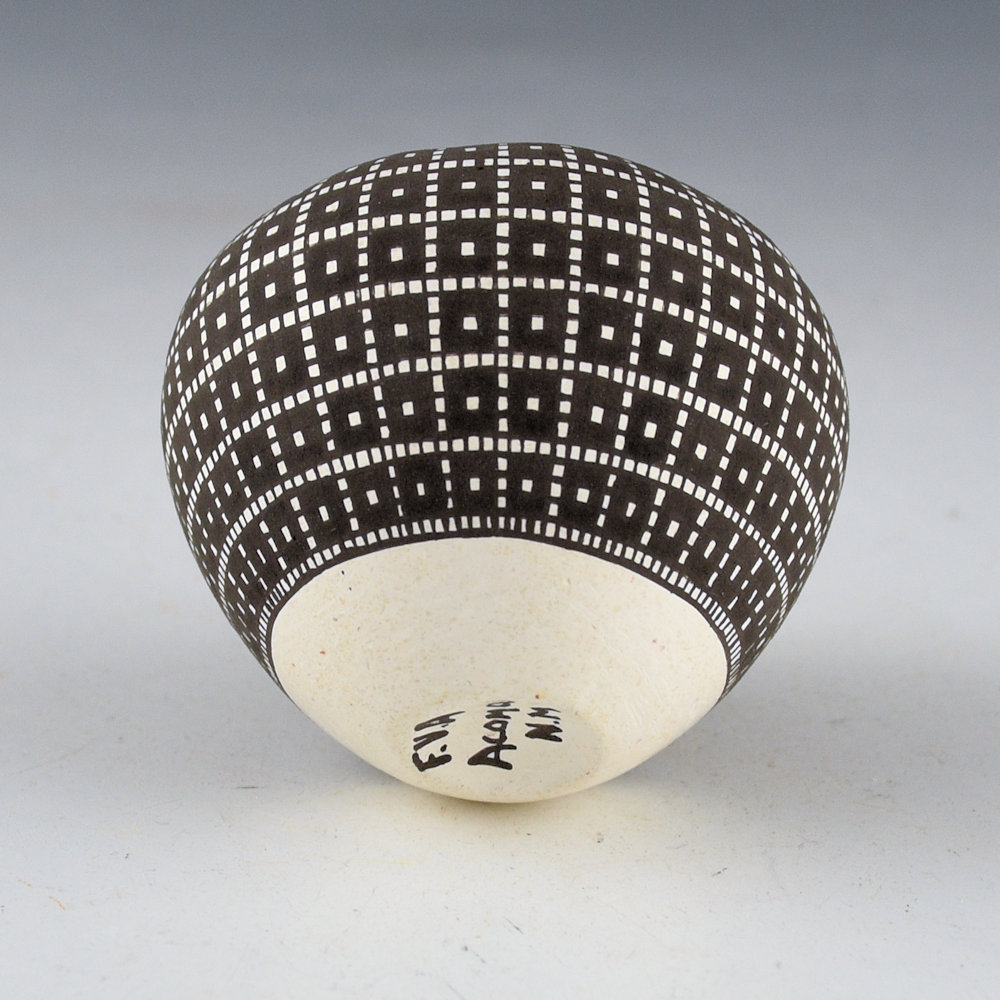 Frederica Antonio calls this shape of a bowl with the inturned rim, an “Infinity Rim”. This bowl is coil built and as she is building it she turns the rim down into the bowl. The result is a striking appearance with the feel of the designs flowing into the piece. She uses a series of fine vertical and horizontal lines which are then filled in to create larger images in the squares. This piece is one of her smallest infinity rim pieces. The bowl is fully designed with a checkerboard corn pattern. Interestingly, Frederica said that she has to use a different yucca brush for the inturned part of the rim because of the angle of the painting! The base of the jar is concave, reminiscent of historic Acoma jars that were carried on the head. This combination of thin walls, classic shape, and tightly painted design creates a piece that is visually stunning! The jar is signed on the bottom, “F. V. Antonio”.