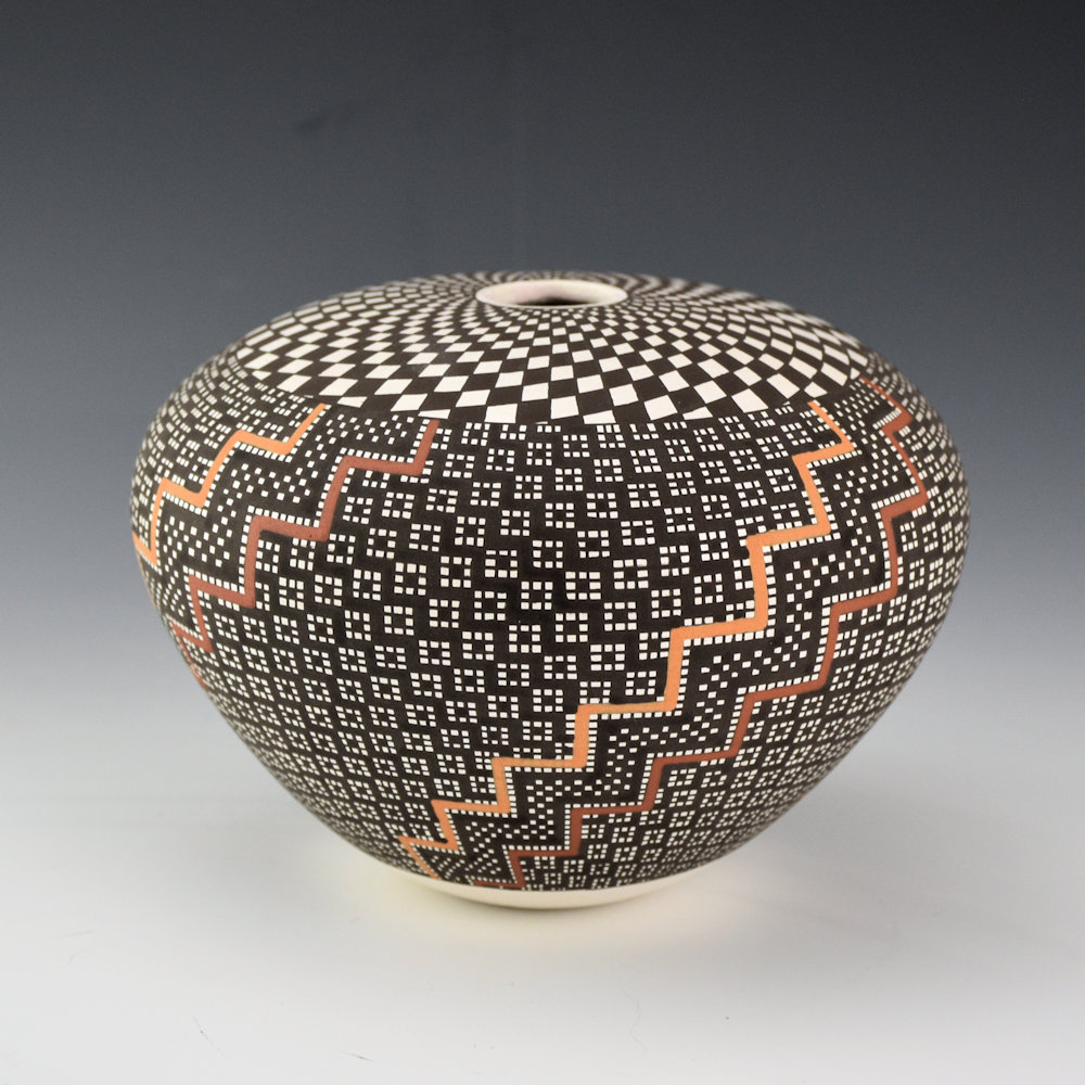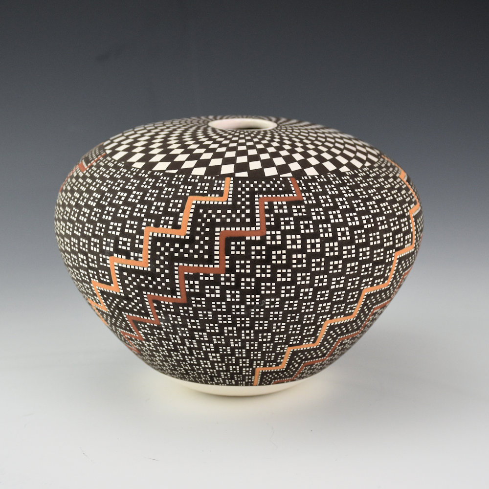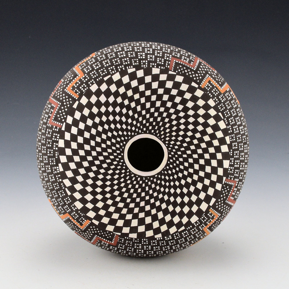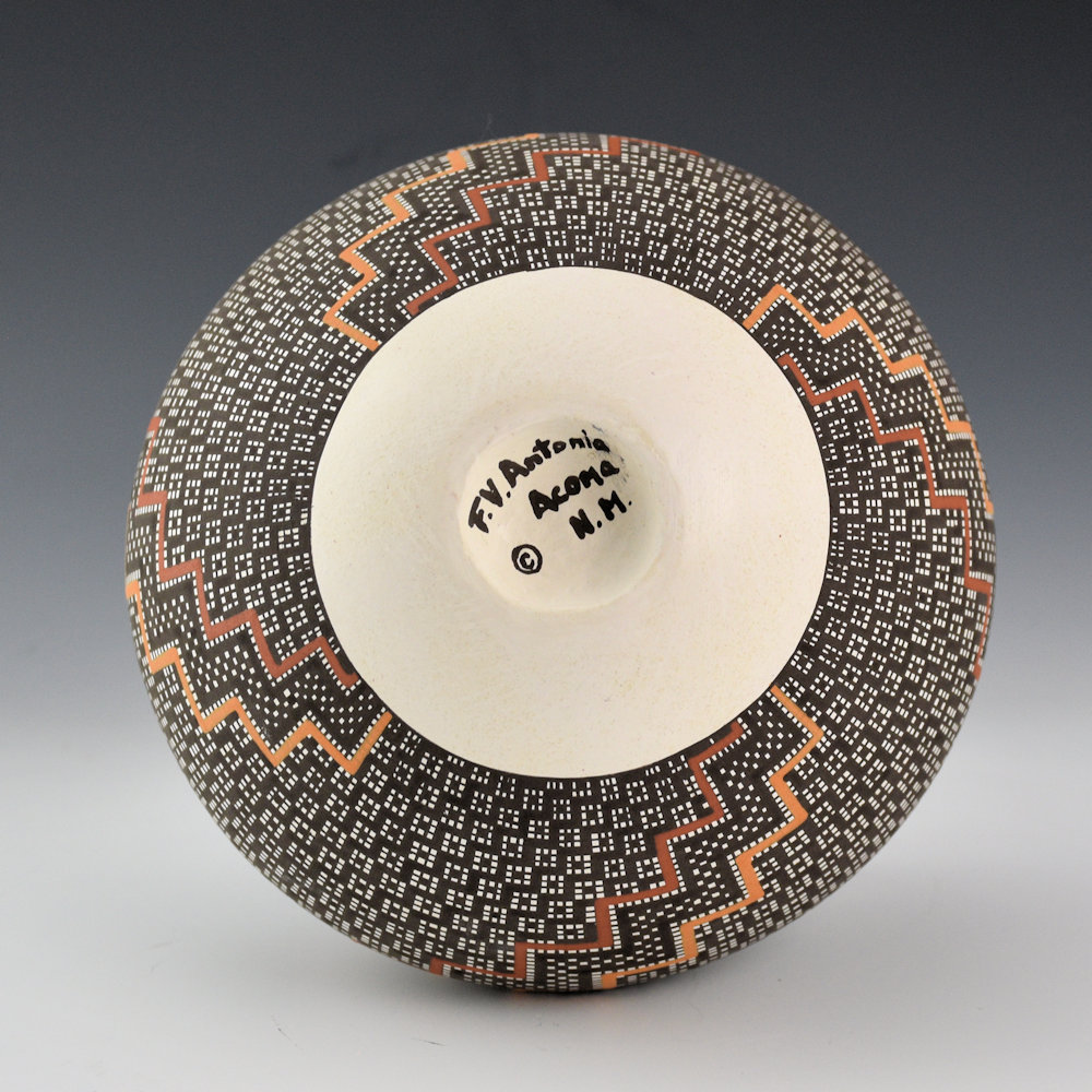 Frederica Antonio is renowned for her intricately painted pottery. Each piece is coil built and then finely painted. Her designs are a series of fine vertical and horizontal lines which are then filled in to create larger images in the squares.  This seedpot is fully designed. The top has a swirling checkerboard top. The sides have a corn design with very intricately painted squares.  There are terraced designs painted with clay slips. The base of the seedpot is concave, reminiscent of historic Acoma jars which were carried on the head.  This combination of thin walls, classic shape, and tightly painted design creates a piece that is visually stunning!  The jar is signed on the bottom, “F. A. Antonio”.