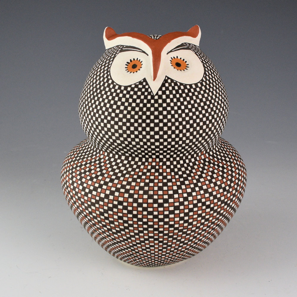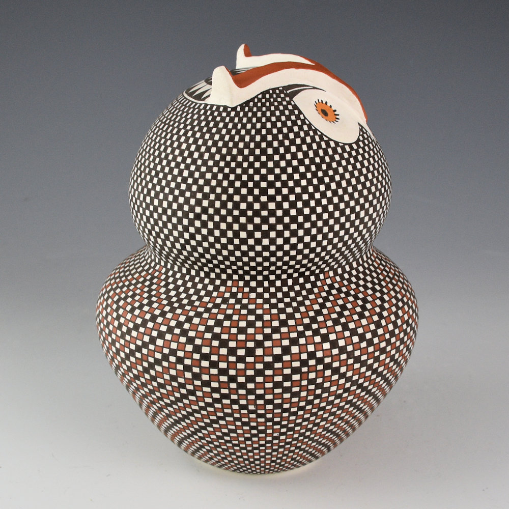 This is the first clay owl made by Frederica Antonio. She is renowned for her intricately painted pottery. Each piece is coil-built and then finely painted. Her designs are a series of fine vertical and horizontal lines, which are then filled in to create larger images in the squares. In Acoma pottery, the owl is a symbol of protection and intuition and are usually depicted with large, insightful eyes. Over the years, numerous potters have created their own style of “owl” at Acoma. Hers is quite striking with a double lobe jar. The bottom has a checkerboard cloud design and the top a checkerboard pattern. The eyes are large and she has sculpted feathers on the top of the head. It is an exceptional combination of forms, design, and history. It is a colorful and complex piece! The base of the owl is flat and is signed on the bottom, “F. V. Antonio”.