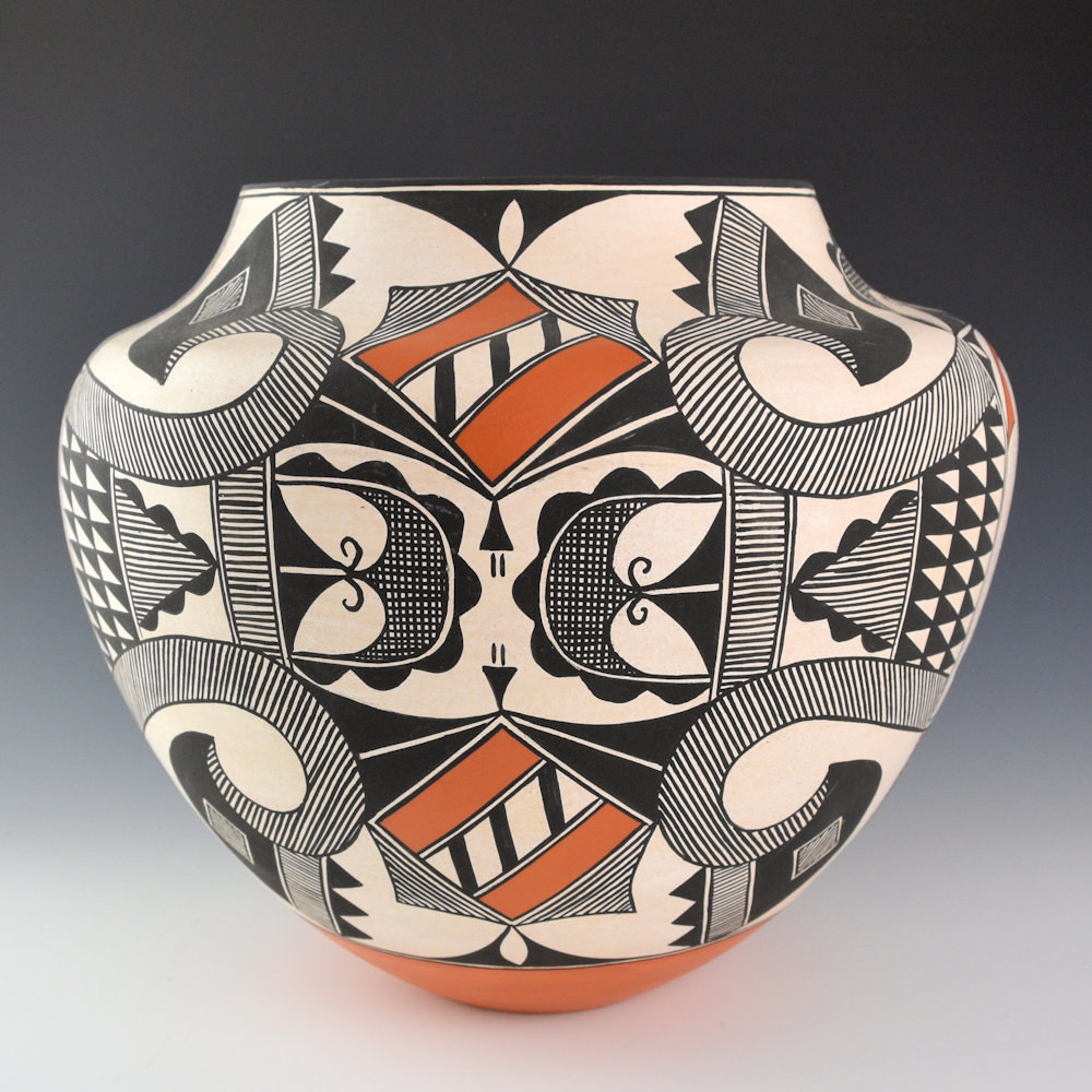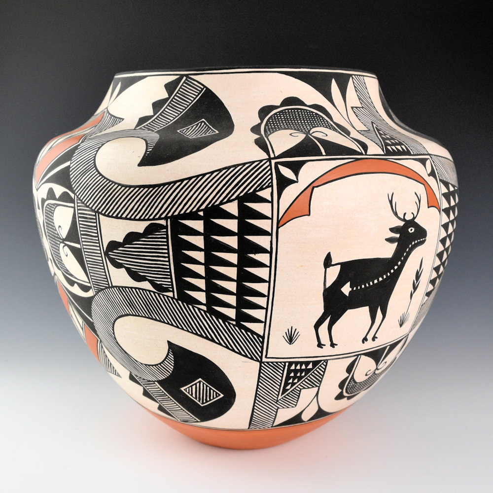 Florence Aragon was one of the great traditional Acoma potters.  This water jar is indicative of the influence of her pottery and the continuation of traditional designs and forms. The jar is the traditional water jar or “olla”. The high shoulder and sloping short neck are part of this form. The jar has a heart line deer on each side.  There are rainclouds above and plants below.  As the jar is turned, there are swirling birds at the top and bottom.  They are filled in with thin lines.  The center has plant and fine-line designs.  This is one of the most complicated pieces we have had come back of her work.  The deer is painted with the symbolic heartline representing the center of the animal and its spirit.  The bottom of the jar is indented in the traditional manner when the pots were made to be worn on the head to carry water!  The jar is signed on the bottom, “F. Aragon”.  It is in excellent condition with no chips, cracks, restoration, or repair.