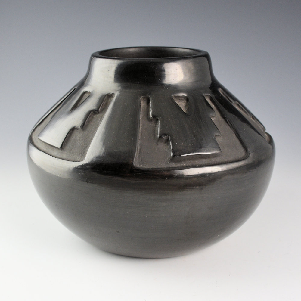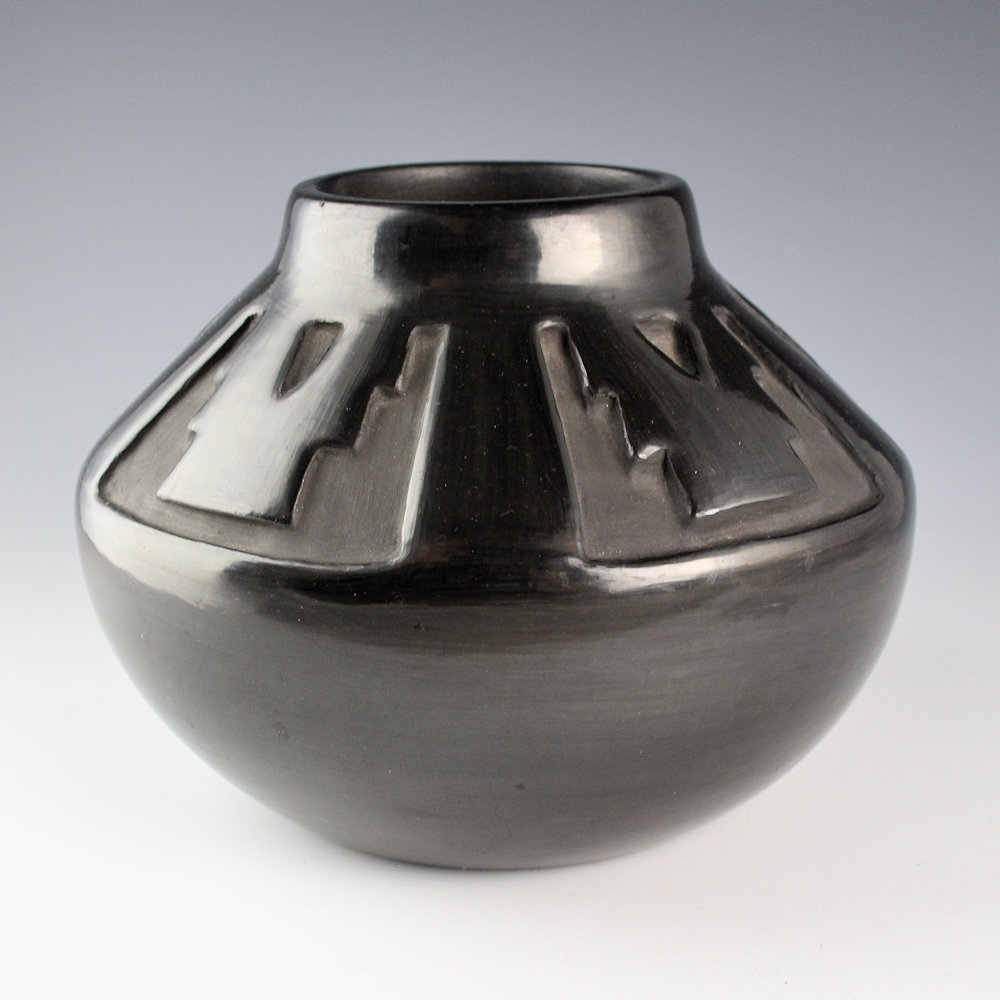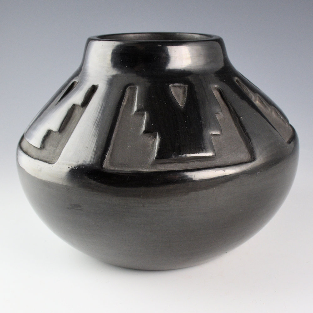 Mary Ester Archuleta is the second youngest daughter of Margaret Tafoya. While she no longer makes pottery she was active in the 1970’s and 1980’s. Much of her pottery was inspired by the incised San Juan style of pottery as she married into San Juan and lived there. This is one of her few black pieces. The jar has a wide shoulder and a short neck. The jar is deeply carved with step cloud designs which also create kiva step patterns. It is striking use of design and form. The jar was fired a glassy black. It is signed on the bottom in the clay, “Mary Archuleta. It is in very good condition with no chips, cracks, restoration or repair.