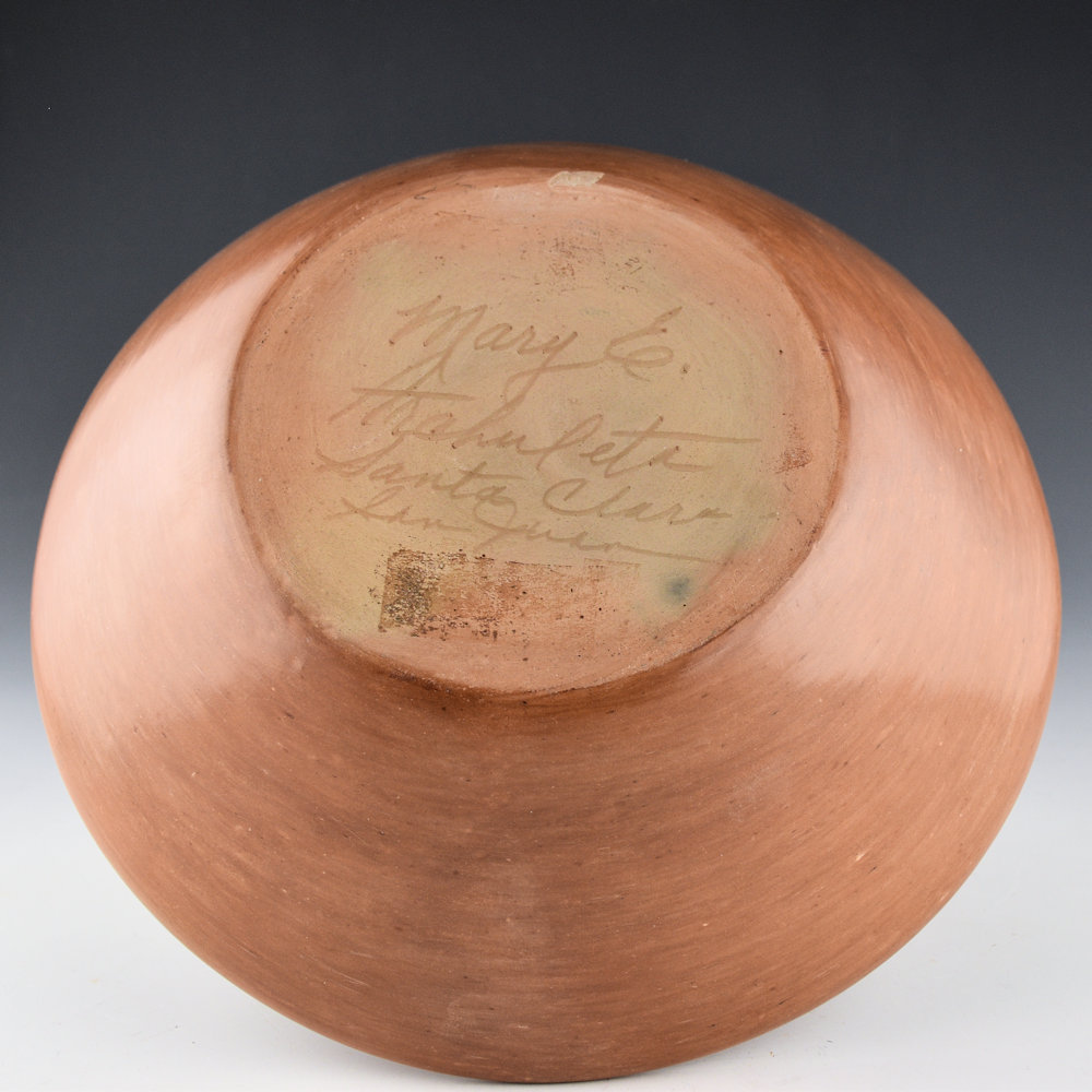 Mary Ester Archuleta is the second youngest daughter of noted potter Margaret Tafoya. This open bowl is carved and polished. The exterior and rim are polished tan, the clay’s natural color. The interior has a carved rain cloud. The rain clouds is polished tan, while the surrounding area is polished a deep red. Mary helped revive the red and tan coloration, through the help of her mother, when she married and moved to Ohkay Owingh in the 1960s. It is signed on the bottom in the clay, “Mary E. Archuleta. It is in excellent condition with no cracks, restoration or repair. There is one small chip near the base, which can be seen in the photos. While she no longer makes much pottery, her work is creative and distinctive in style and coloration.