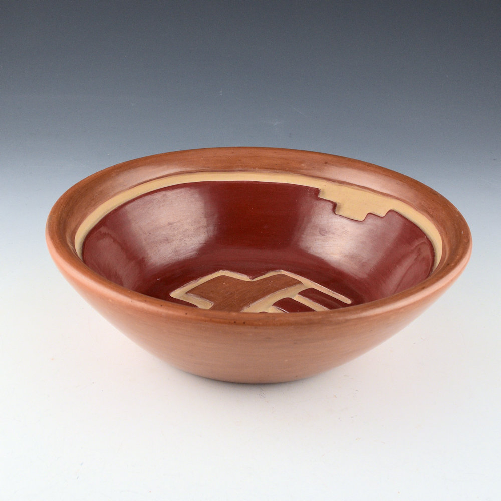 Archuleta, Mary Ester – Red and Tan Open Bowl with Carved Rain Cloud (1970s)