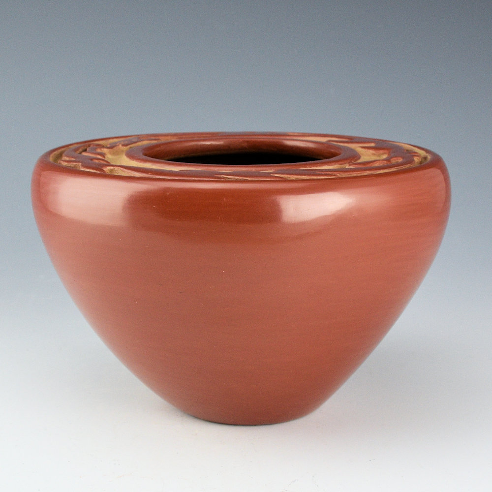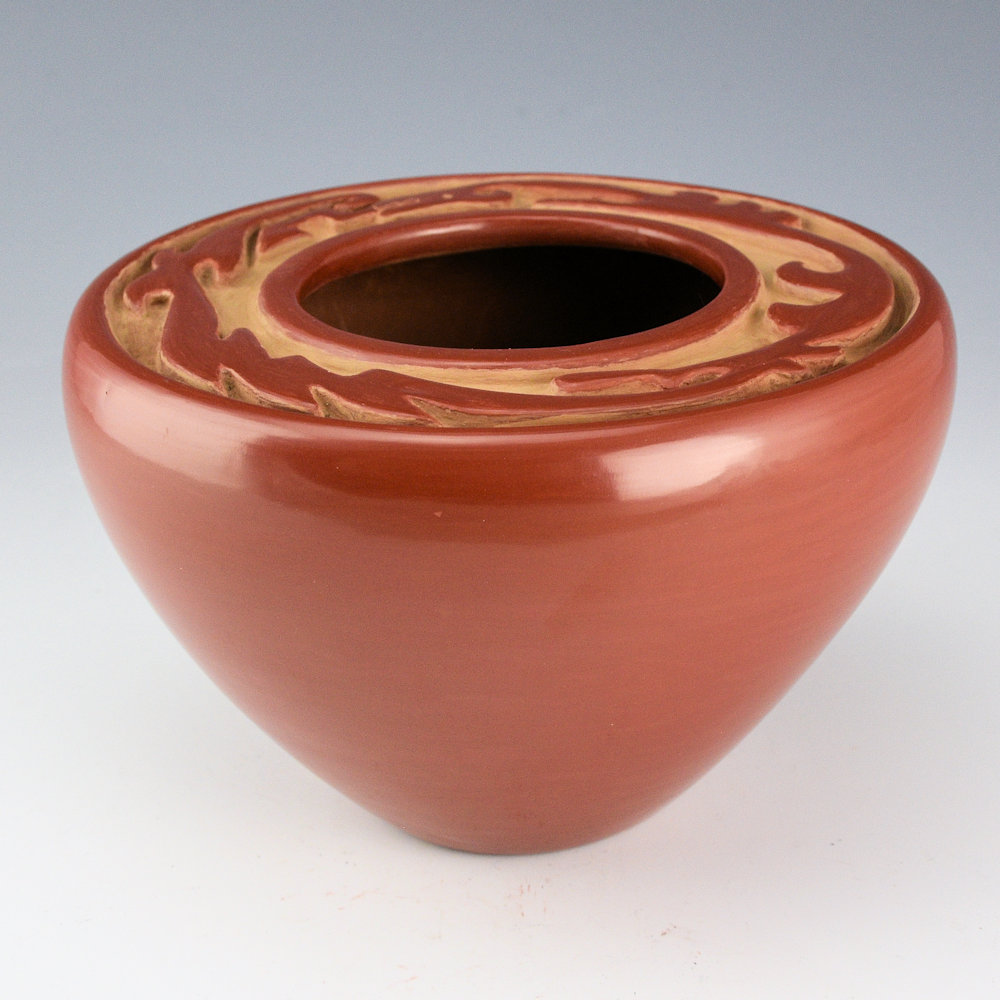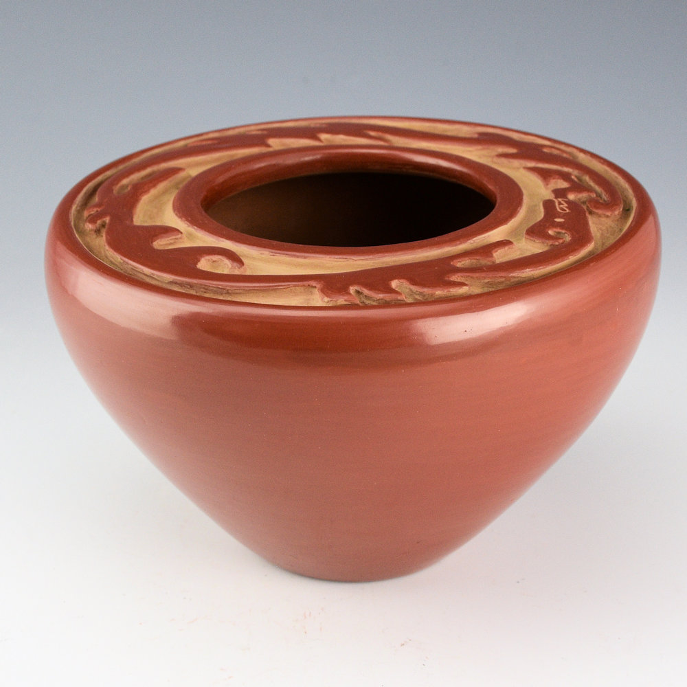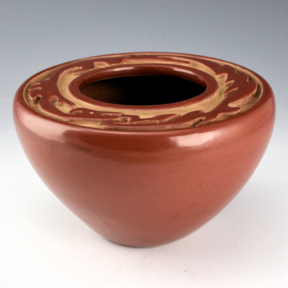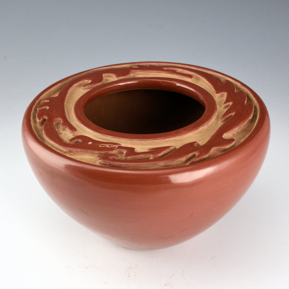 Archuleta, Mary Ester – Red Flat Top Bowl with Carved Avanyu (1960s)