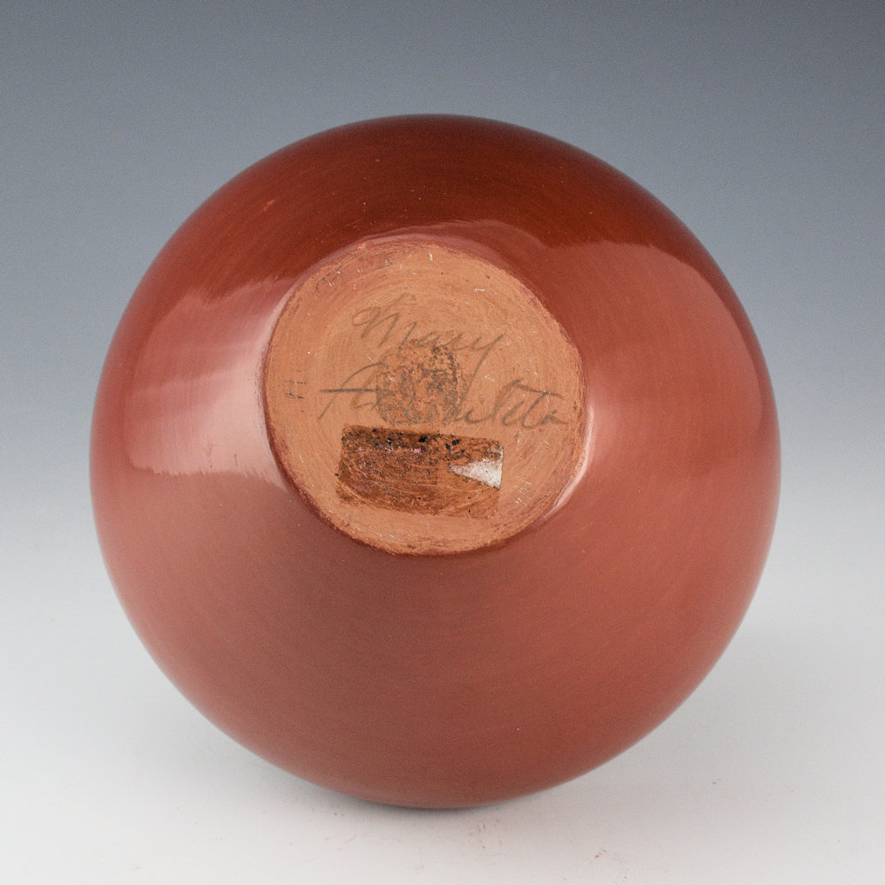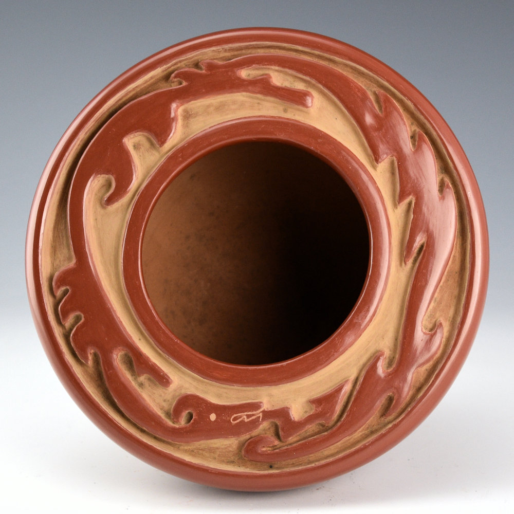 Mary Ester Archuleta is the second youngest daughter of Margaret Tafoya.  She has never made a lot of pottery, and most of it was created in the 1970s and 1980s. This is an exceptional piece that is from the 1960s. The jar has a narrow base and a nearly perfectly flat top!  The top is deeply carved with an avanyu encircling the piece.  The carved avanyu is delicate in design and flows across the surface.  How she was able make the top so flat, AND carve it, is what is so exceptional.  The entire piece is fully polished and it was traditionally fired a deep red coloration.  It is signed on the bottom in the clay, “Mary Archuleta.  It is in excellent condition with no chips, cracks, restoration, or repair.