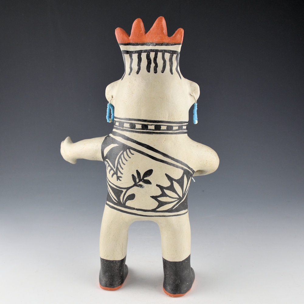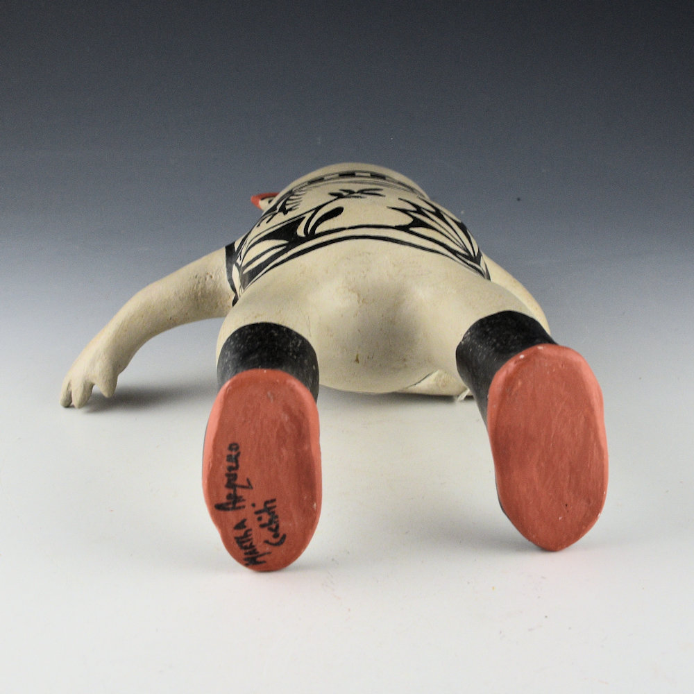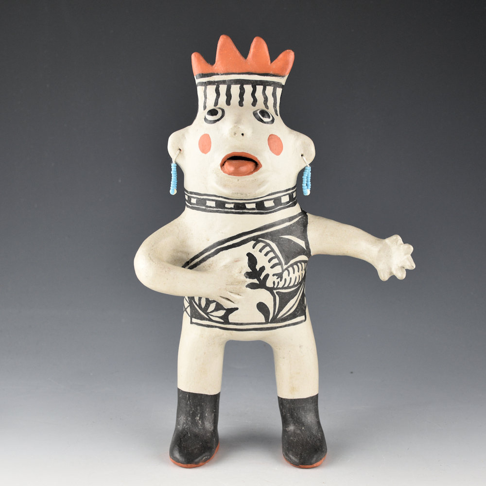 Martha Arquero (b. 1944) learned to make pottery from her mother, Damacia Cordero. Her sisters, Josephine Arquero, and Maria Laweka, are also well known for their traditional pottery. This is one of her classic Monos figures. The figure is wearing a tablita and traditional-style clothing. It is signed on the bottom, “Martha Arquero”. It was traditionally fired and in excellent condition with no chips, cracks, restoration or repair. Martha was selected as the 2024 Living Treasure for the Museum of Indian Art and Culture.