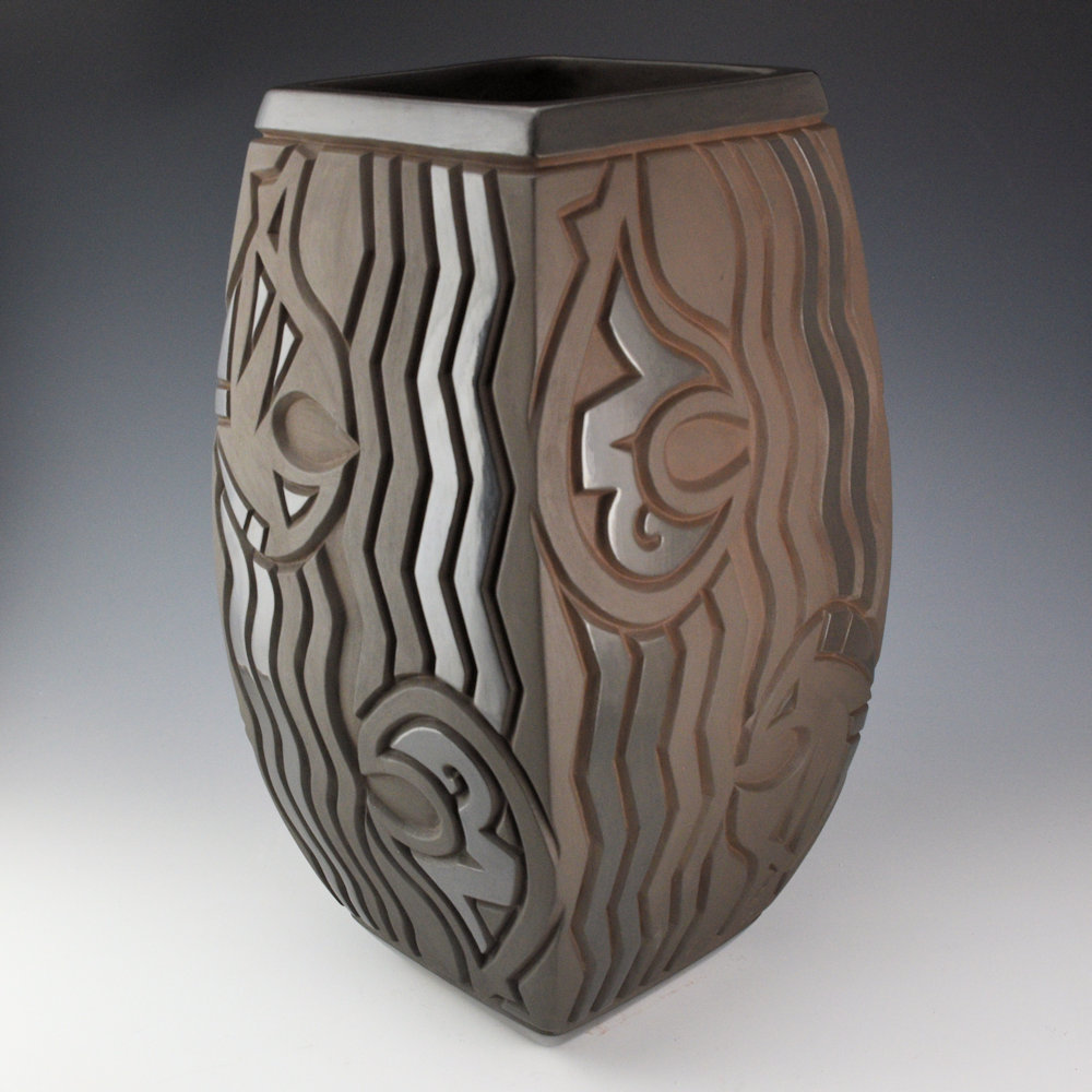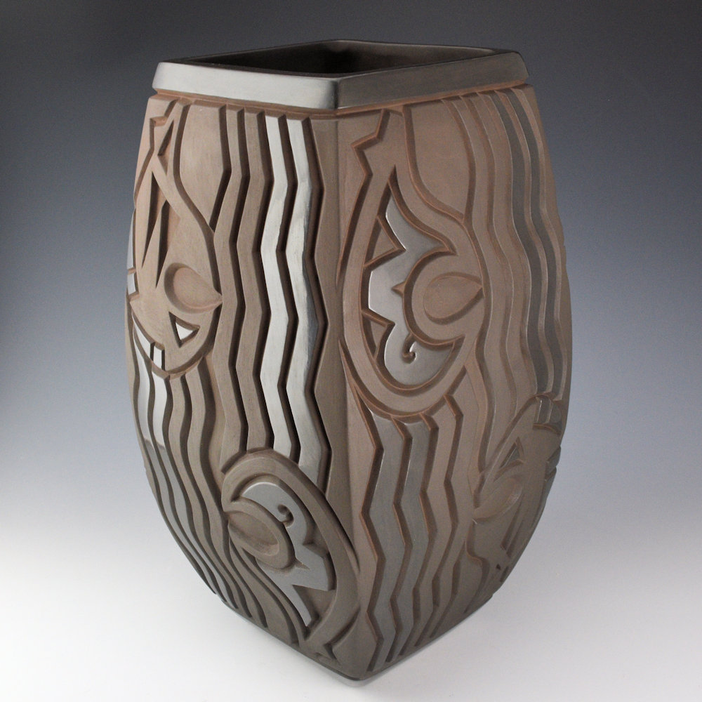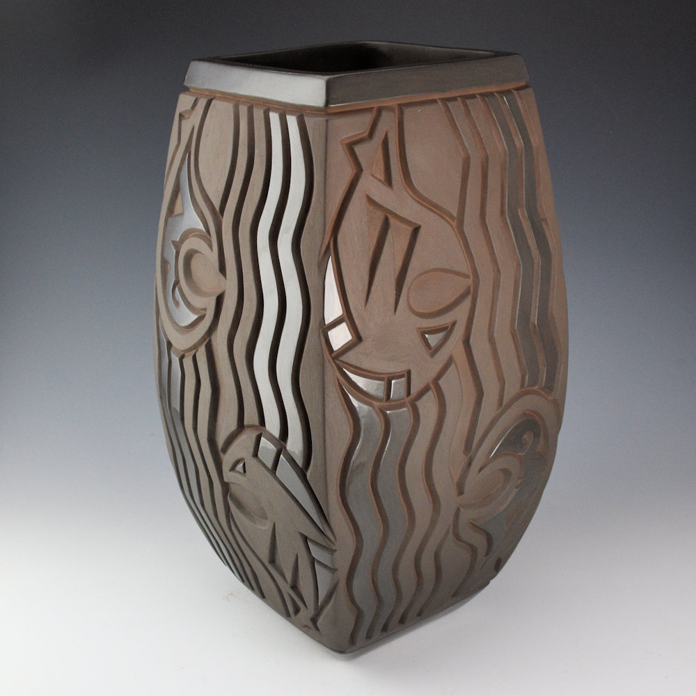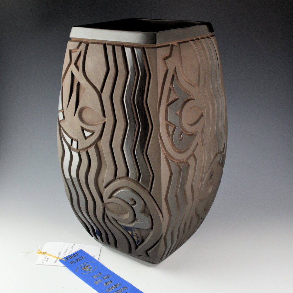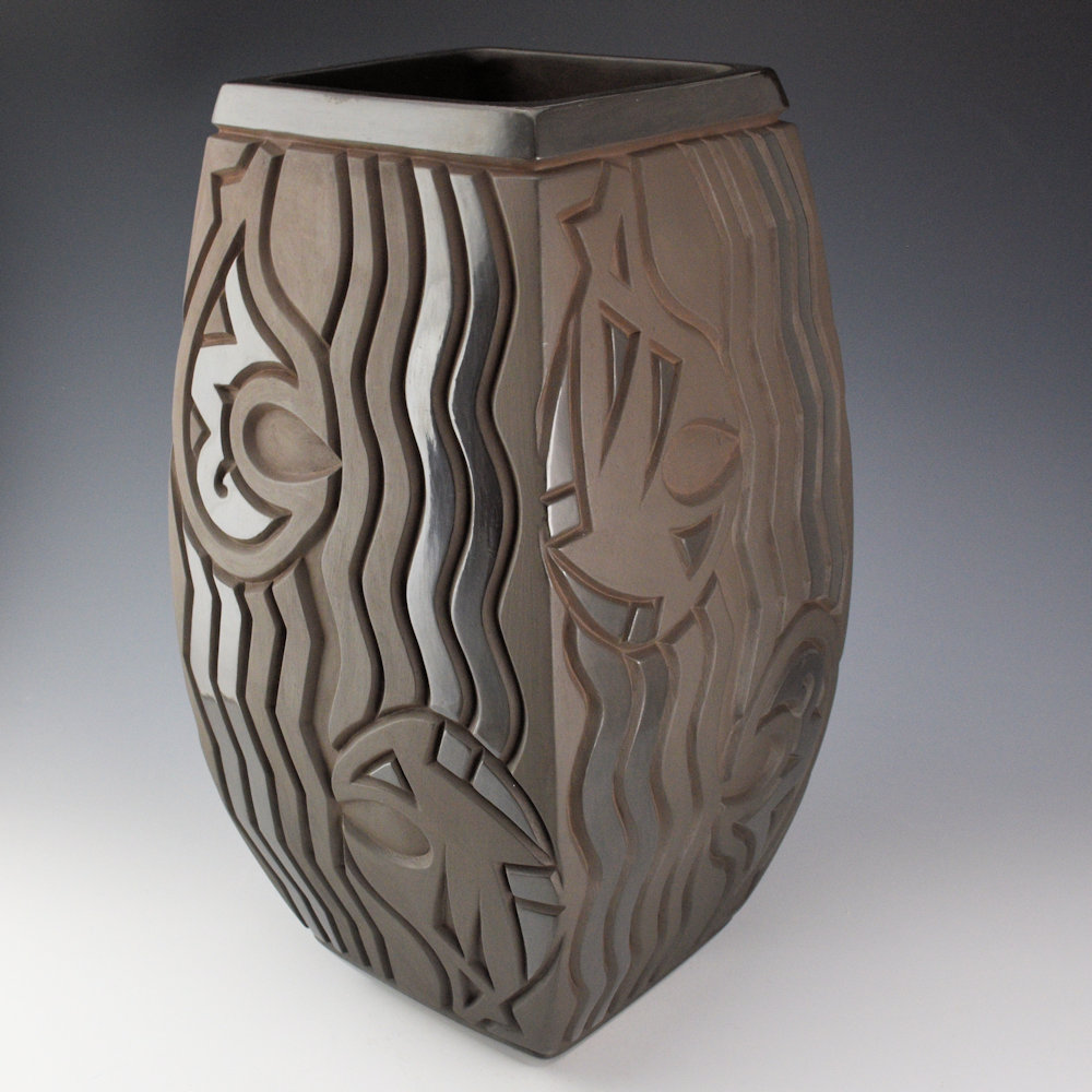 This is the largest jar Daniel Begay has made to date. The piece is coil-built, carved, stone-polished, and traditionally fired. The piece has a square shape and each side has a heartline bear and water designs. It is creative use of classic designs. Each section is deeply carved and areas are stone polished to a high shine and create a striking contrast of matte and polished surfaces on this jar. The style of carving has a beveled appearance to the angle of the cuts into the clay. The jar is signed on the bottom in the clay, “Daniel Begay”.