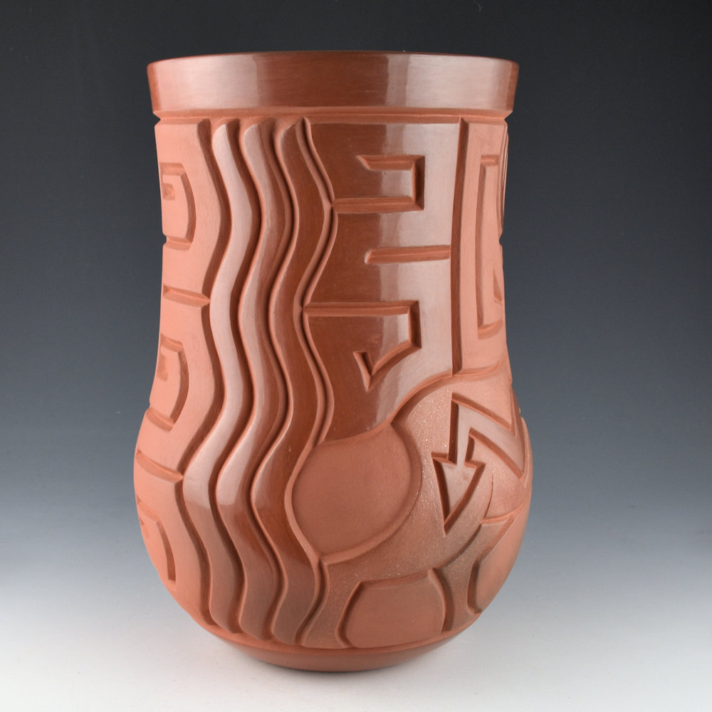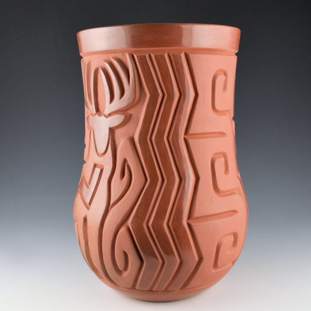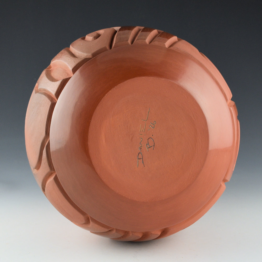 This is a creative jar by Daniel Begay.  The piece is coil-built, carved, stone-polished, and traditionally fired.  The jar is entitled, “A Moment in the Forrest”.  It is an elegant shape with a low, round shoulder . The jar has a large heartline deer carved into the clay.  It is surrounded by a waterfall and wind designs.  The areas are both polished and matte and create a striking visual flow across the surface of the piece.  It was traditionally fired a glassy black coloration.  The style of carving has a beveled appearance to the angle of the cuts into the clay.  The jar is signed on the bottom in the clay, “Daniel Begay”.