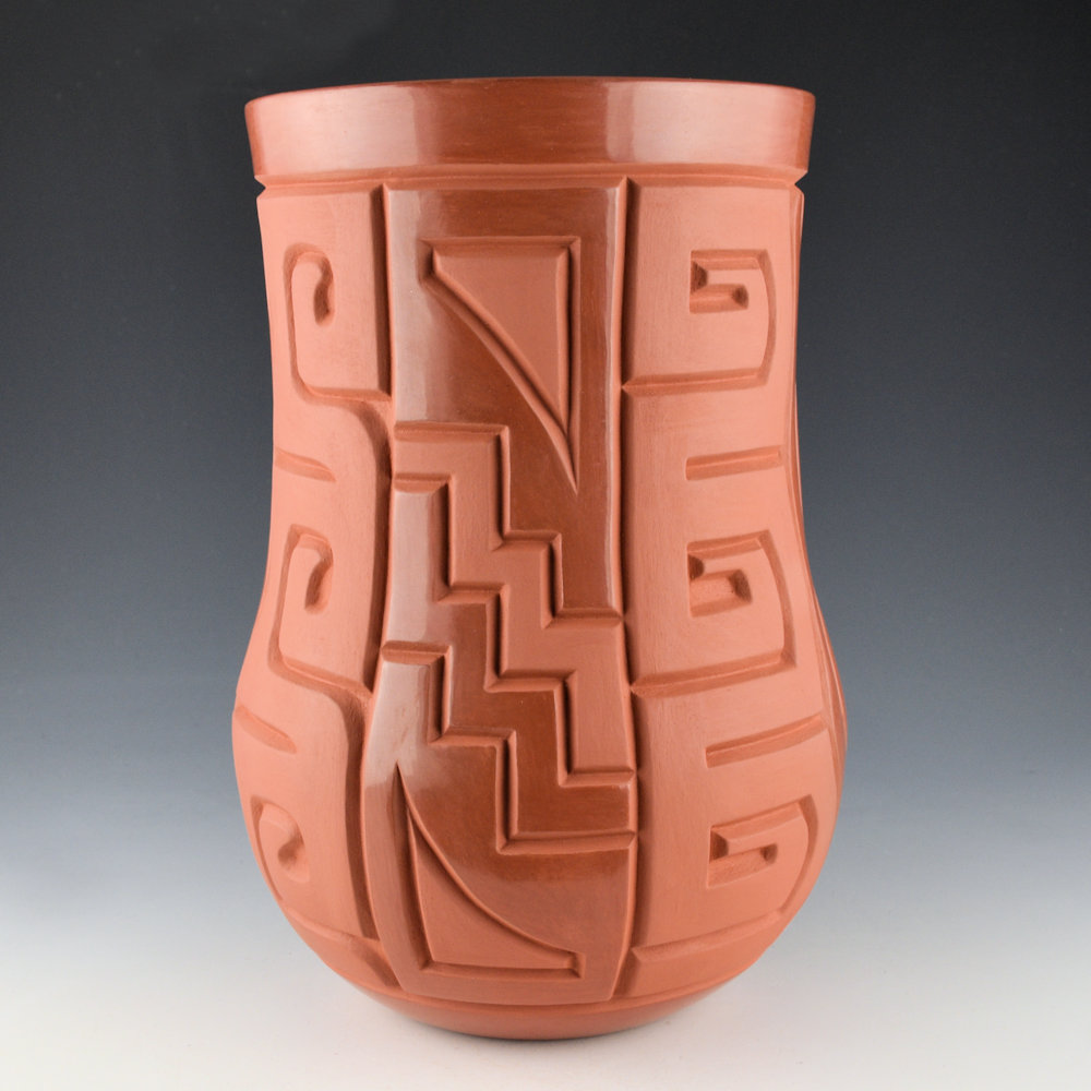 This is a creative jar by Daniel Begay. The piece is coil-built, carved, stone-polished, and traditionally fired. The jar is entitled, “A Moment in the Forrest”. It is an elegant shape with a low, round shoulder . The jar has a large heartline deer carved into the clay. It is surrounded by a waterfall and wind designs. The areas are both polished and matte and create a striking visual flow across the surface of the piece. It was traditionally fired a glassy black coloration. The style of carving has a beveled appearance to the angle of the cuts into the clay. The jar is signed on the bottom in the clay, “Daniel Begay”.