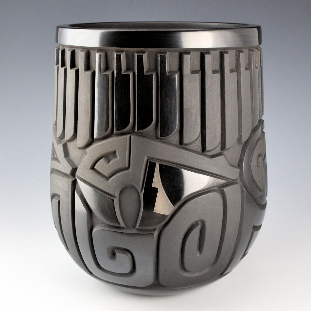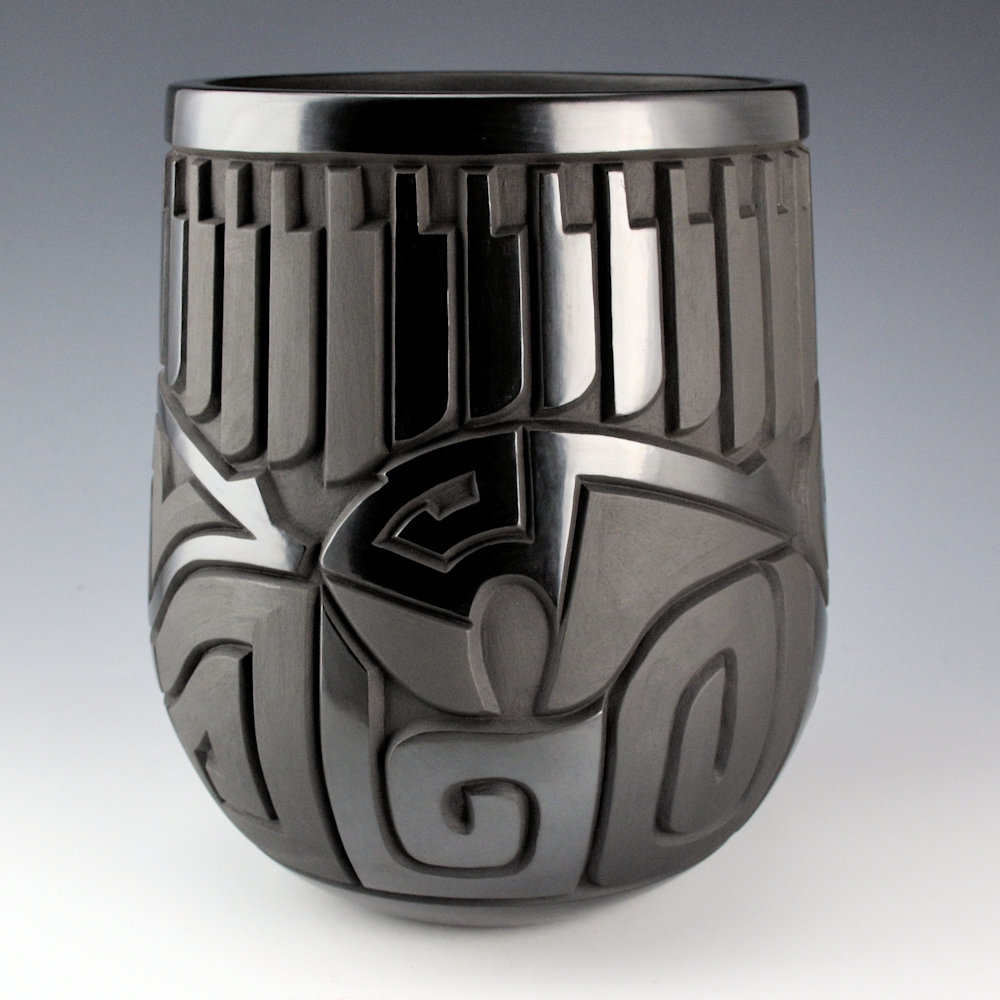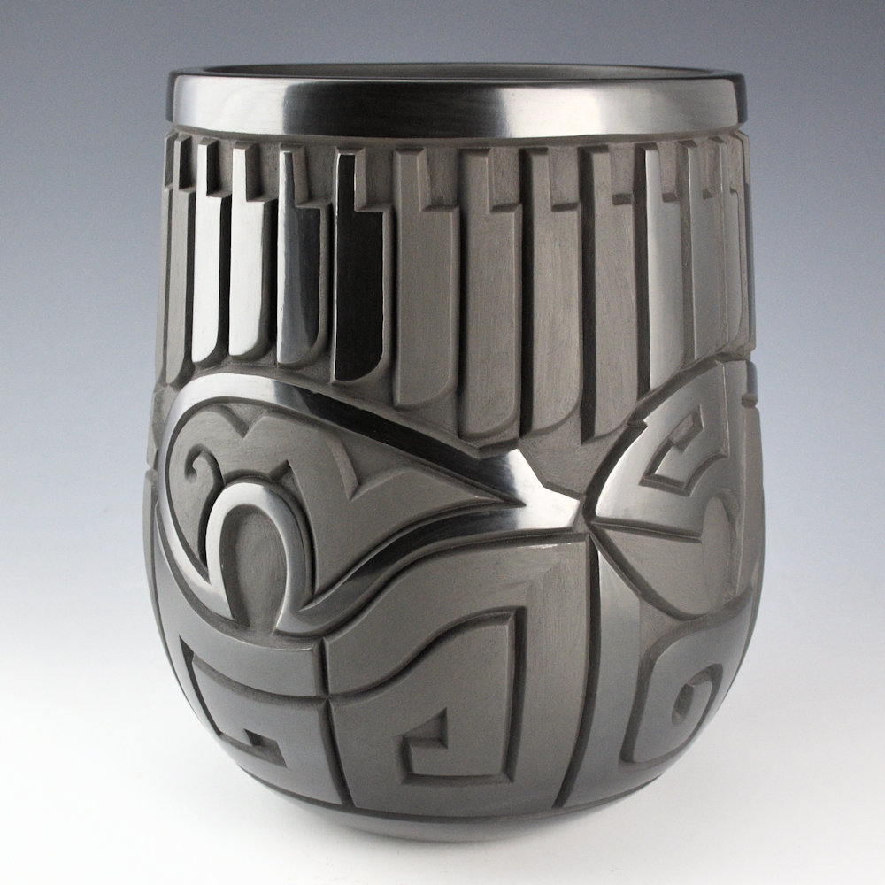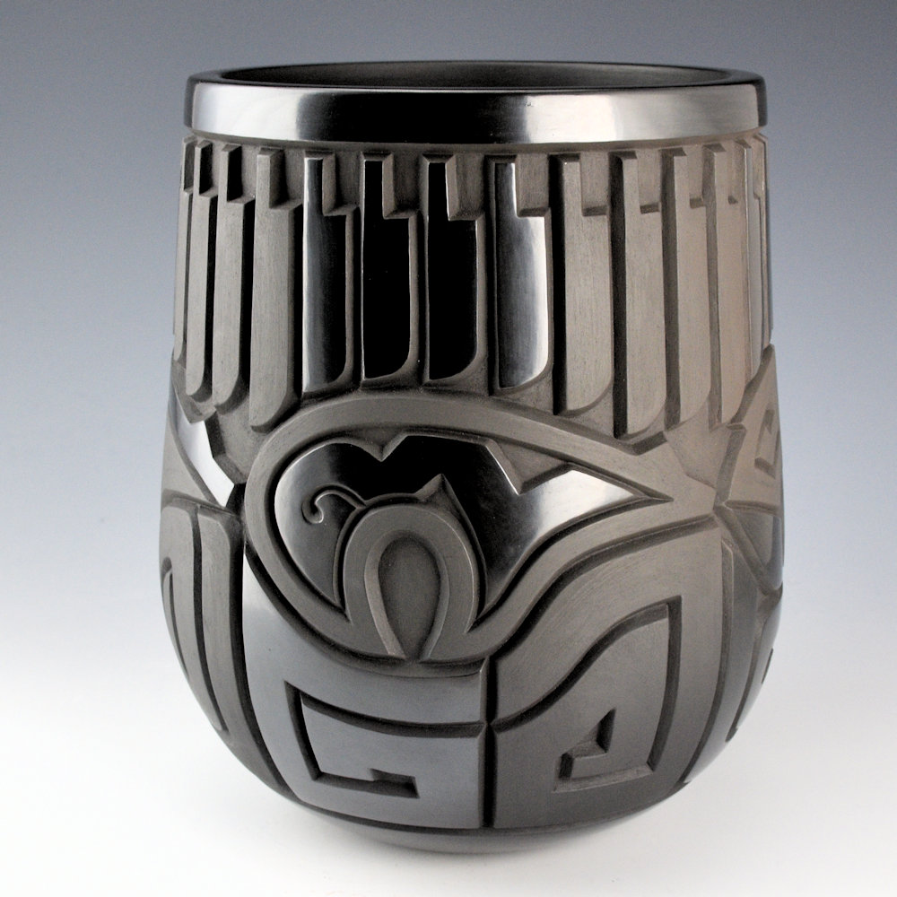 This is a straight shoulder jar by Daniel Begay. The piece is coil-built, carved, stone-polished, and traditionally fired. The jar has 32 carved feather around the neck. They alternate between sections of polished and matte areas. Below are four bears with heartlines. Each one is different. The jar is very deeply carved and Daniel has a beveled appearance to the angle of the cuts into the clay. It is a complex and striking piece! Areas are stone polished to a high shine and create a striking contrast of matte and polished surfaces on this jar. The jar is signed on the bottom in the clay, “Daniel Begay ’25”.