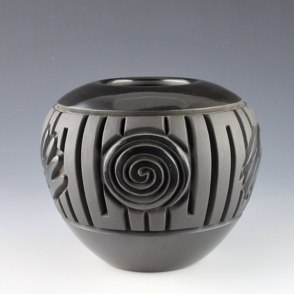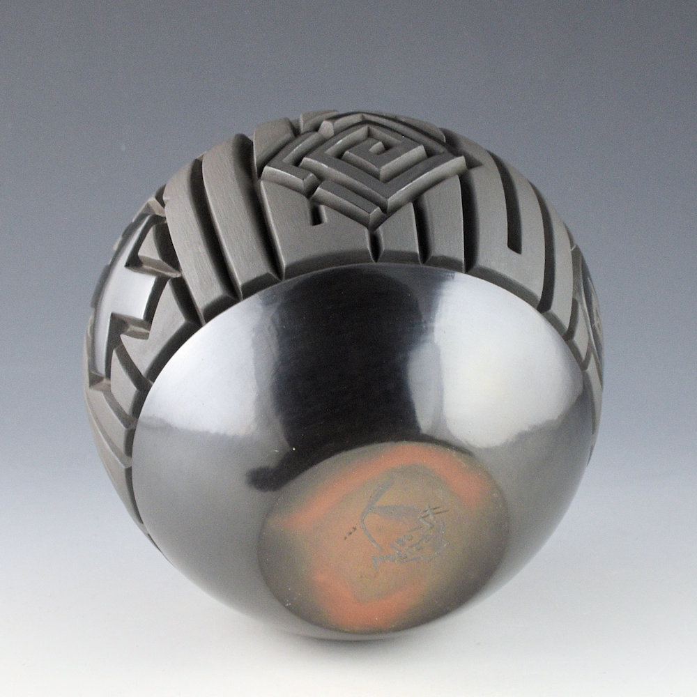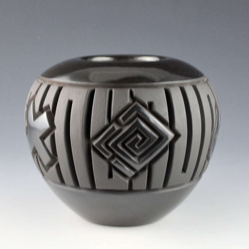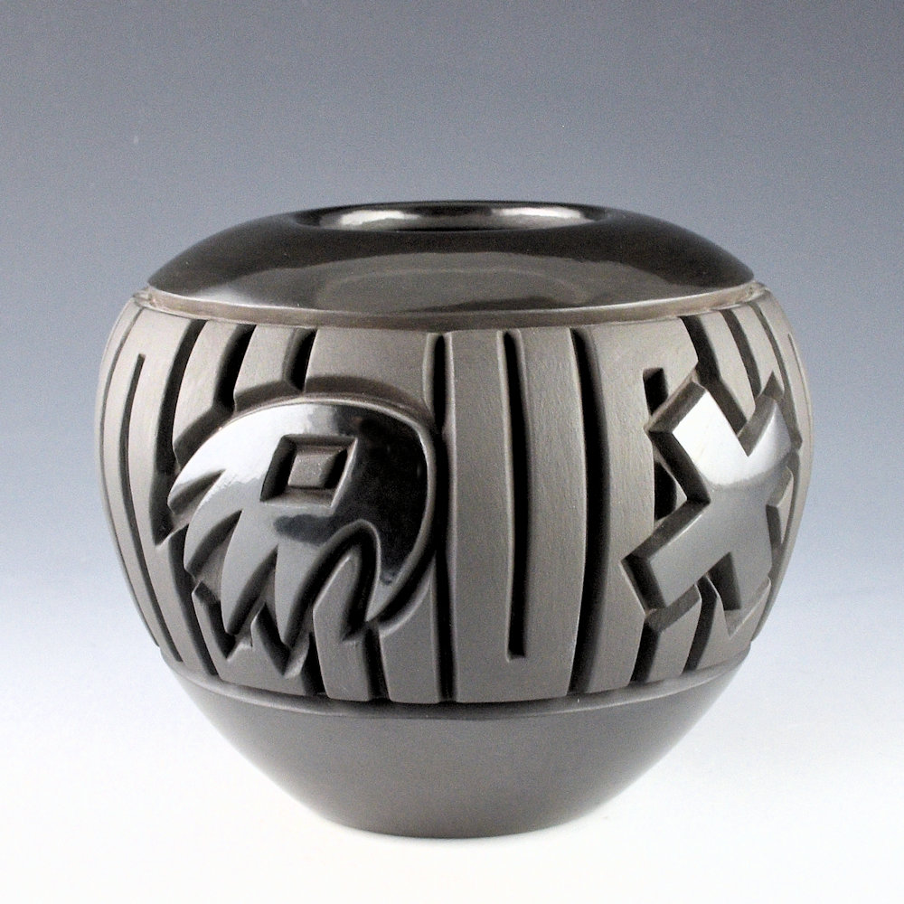 Harrison Begay, Jr. has won numerous awards over the years for his deep-carved pottery. This bowl is round in shape. There are four carved sections of design with a star, swirling cloud, bear paw, and hand. They are separated by linear bands of design. The bowl is a contrast of polished and matte surfaces. The highly stone-polished surface creates a strong visual distinction between the matte and polished surfaces. Note as well the style of carving, which has a beveled appearance to the angle of the cuts into the clay. This is a very distinctive style of carving for his pottery. The bowl is signed on the bottom in the clay, “Harrison ’98”.