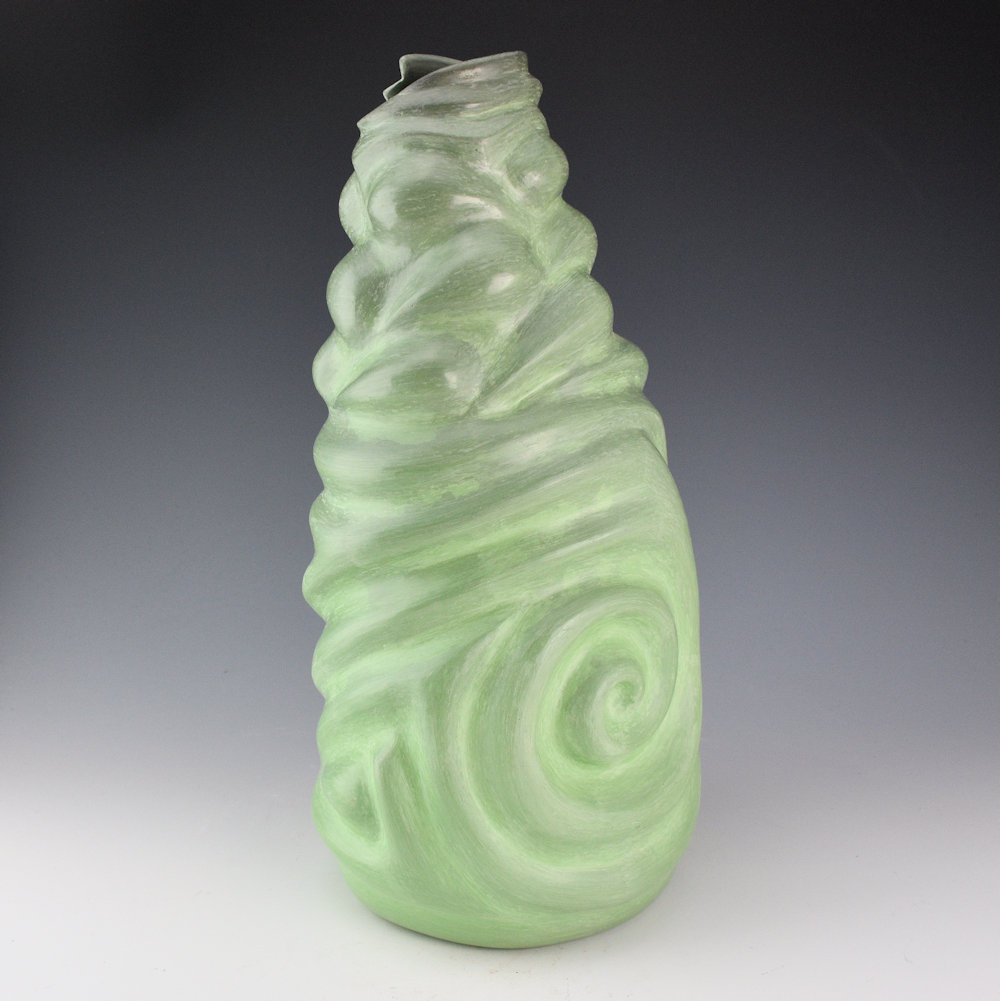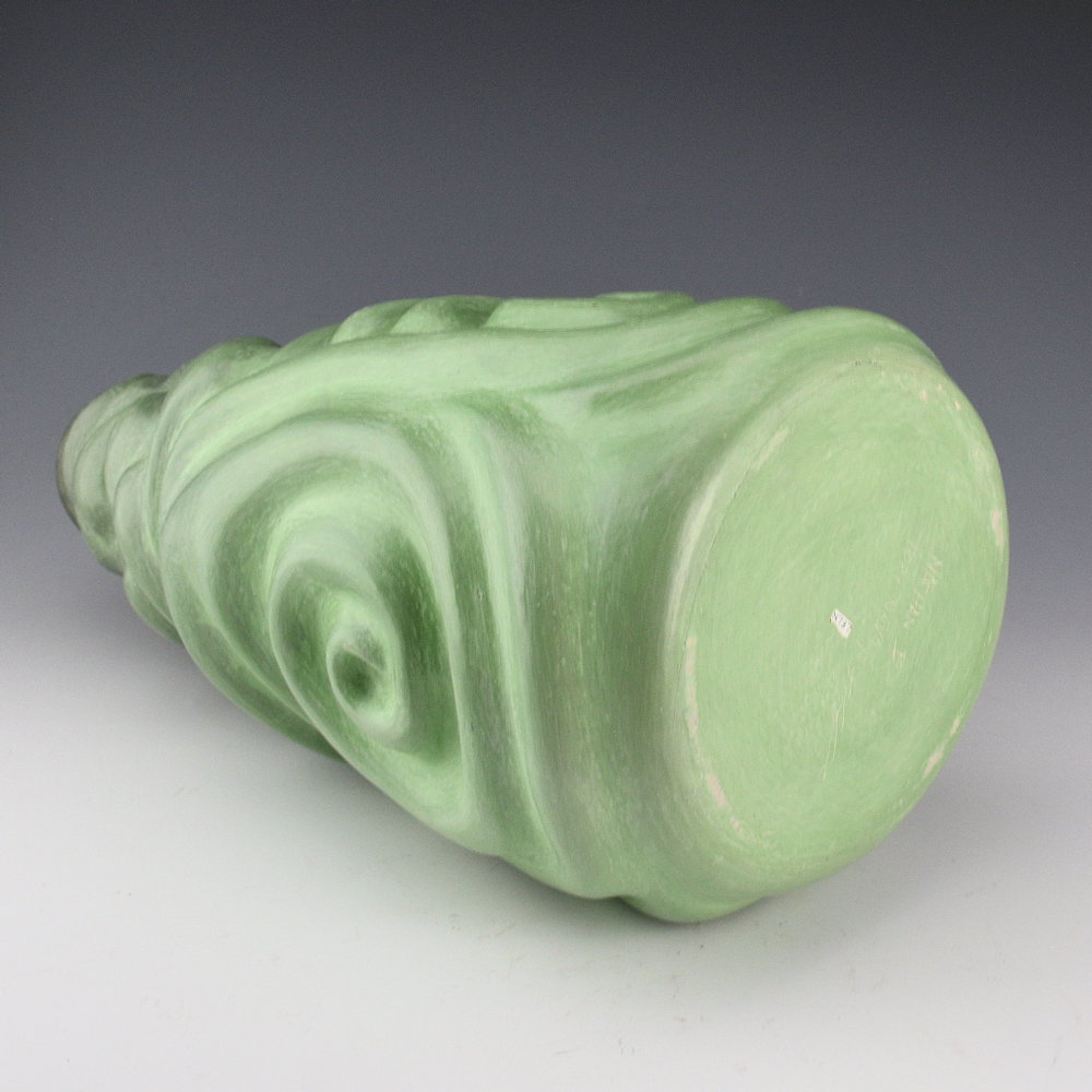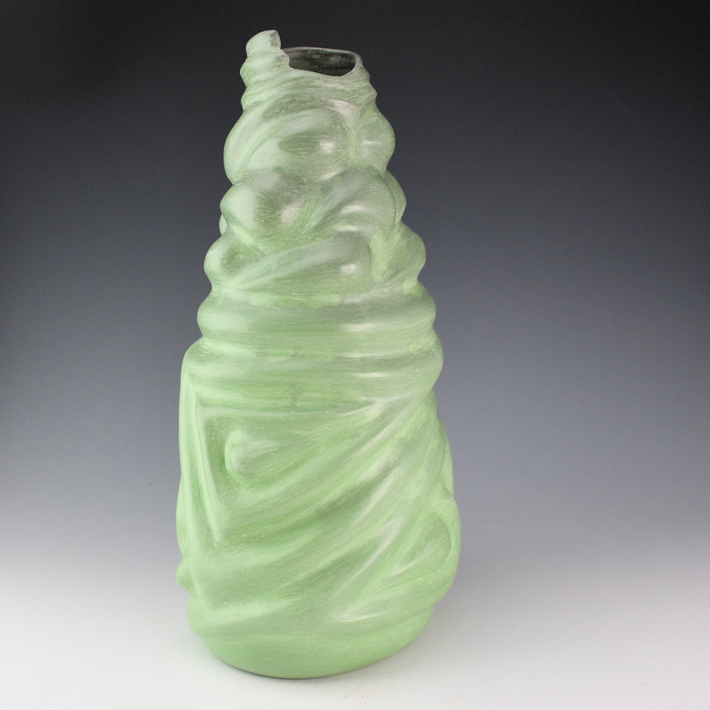 WOW! This is a spectacular jar by Nathan Begaye. He was a unique innovator among Pueblo and Navajo potters. His ancestry of both Hopi and Navajo let his work flow between the two distinctive styles and yet find their own unique space. His work used traditional designs, forms, and techniques, yet somehow appeared very modern. For many of his pieces, he would talk about them being “layered”, much like his own cultural and personal experiences. That is often the best way to look at these pieces and extract something from each of the varied layers. This is one of his famous “cloud jars”. All the ‘designs” are pushed out in the clay making it a very technical jar! There are angles and rounded areas, each creating its own design section. The jar is fully polished with green clay (it is a clay that is high in copper) and then traditionally fired. The smoke from the firing gives the piece added depth of color. The jar was made in 1997 and the tiny white tag on the bottom is the original inventory number from Robert Nichols Gallery, who represented Nathan throughout most of his career. Looking through all the layers of “clouds”, the jar becomes a fascinating balance of color, form, design, and contrasting shapes. The jar is signed on the bottom, “Nathan Begay ’97”. It is in excellent condition with no chips, cracks, restoration or repair.