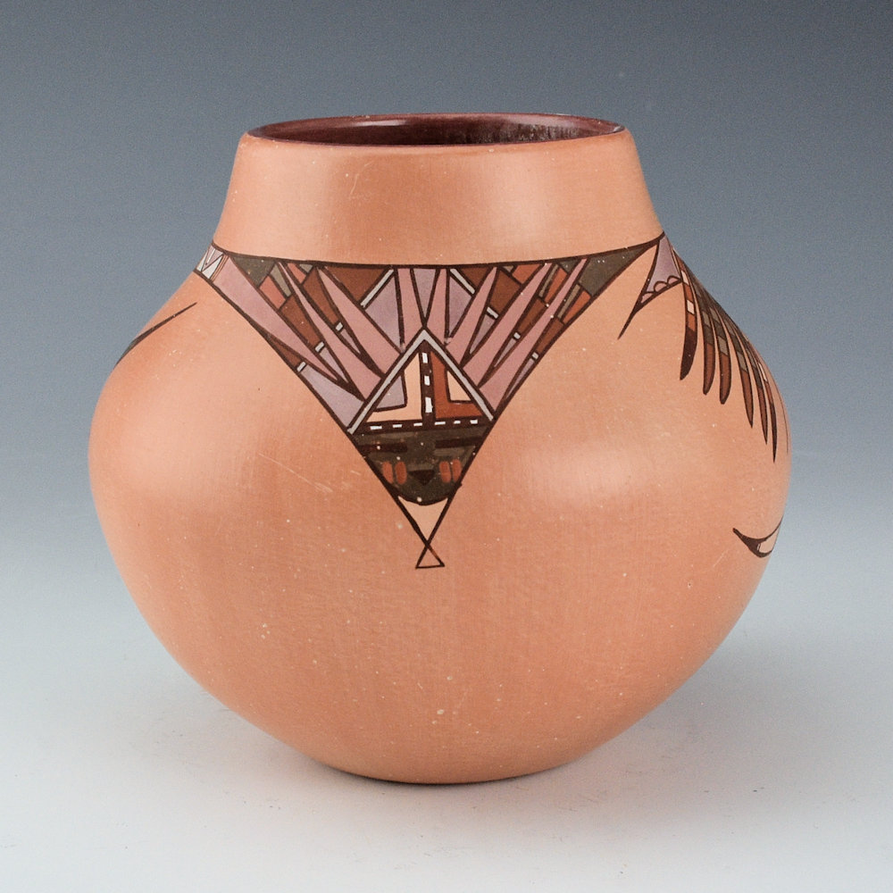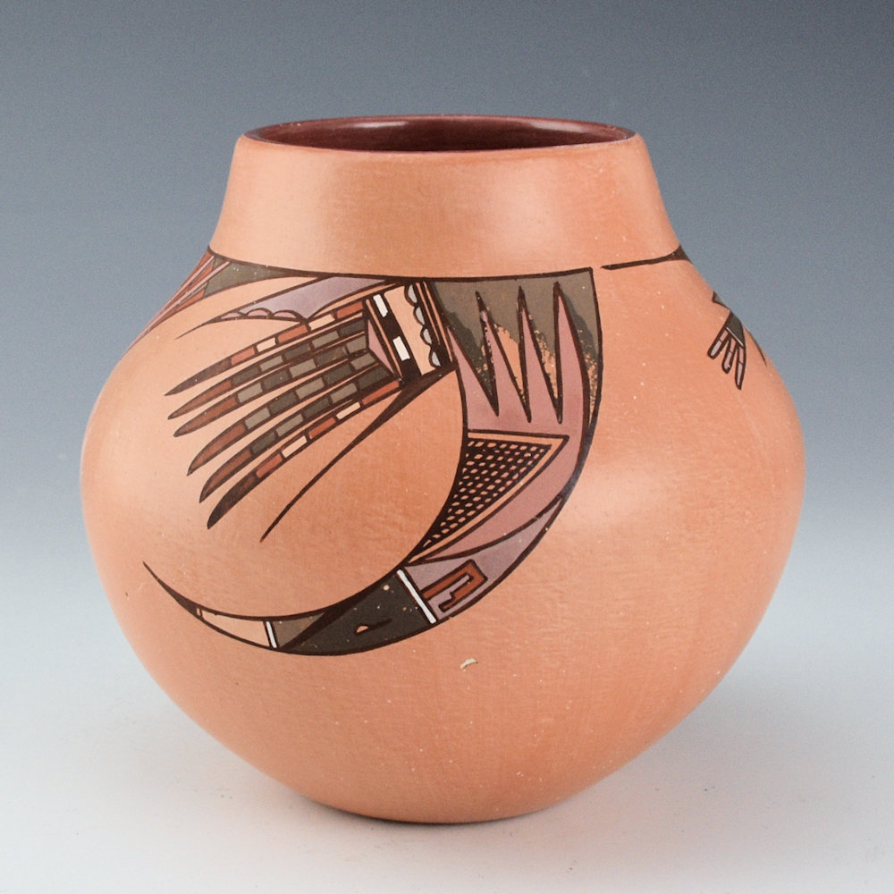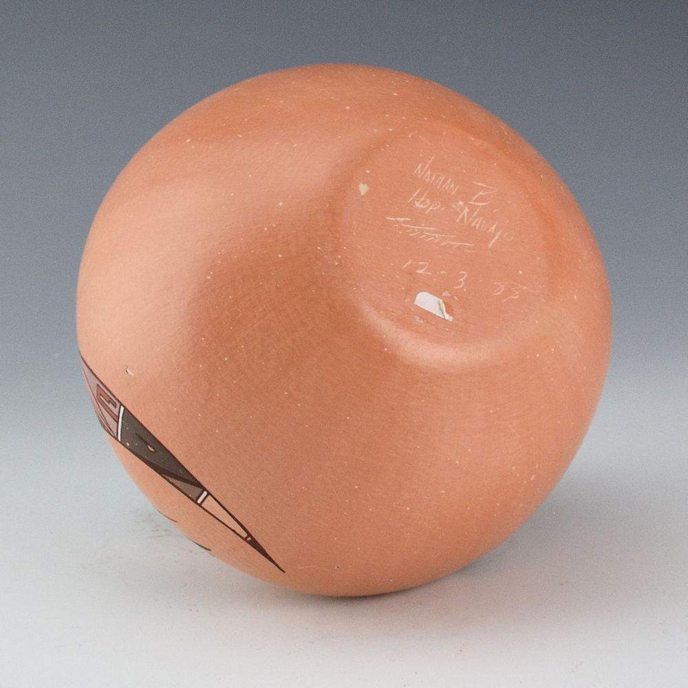 This is a creative polychrome jar by Nathan Begaye. He was a unique innovator among Pueblo and Navajo potters. His ethnic connection to both Hopi and Navajo let his clay art flow between the two distinctive styles and yet find its own unique space. His work used traditional designs, forms, and techniques, yet somehow appeared very modern. This jar has a round shoulder and short neck. The inside of the neck is polished red. The jar is painted with Sikyatki bird and a Hopi sun on one side. There is a black painted area with stars. Check out the large birds wings and he painted them so there was a gradation in color across each of the four triangular sections. This is an early piece (1988) and reflects the variety of imagery, textures, and designs for which he would later become famous. There are purple, white, peach, red, teal, orange, blue, and brown clay colors used on this piece. The black is bee-weed (a plant). It is an extraordinary number of colors on this piece and the result is quite spectacular. I remember going to Nathan’s apartment when he lived in Phoenix. I would watch him work on painting his pottery. He would talk about each of the colors, and some were more difficult to source than others. The purple and blues, I remember, were the most difficult to find. The jar was traditionally fired to create the blushes on the surface. It is in very good condition with no chips, cracks, restoration, or repair. It is signed on the bottom, “Nathan Begaye”. It is from 1988. The last photo is a picture I took of Nathan when he was living in Phoenix. He moved there for several years, and I would go to his apartment and see what he was working on and hear the stories about his pottery, the clays, and his firings.