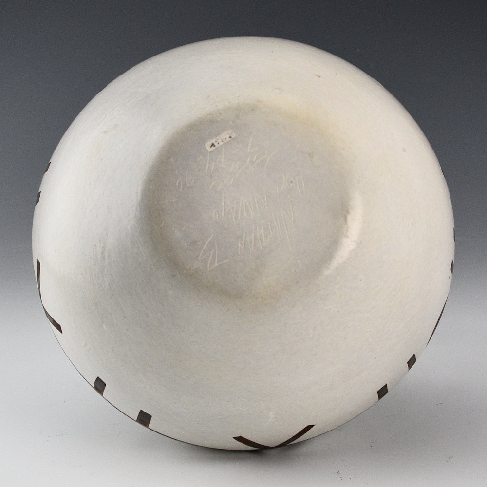 This is a creative polychrome seedpot by Nathan Begaye.  He was a unique innovator among Pueblo and Navajo potters.  His ethnic connection to both Hopi and Navajo let his clay art flow between the two distinctive styles and yet find its own unique space.  His work used traditional designs, forms, and techniques, yet somehow appeared very modern.  This piece is round in shape and cut through on the front.  When holding it, it rattles.  I realized when I was looking at the shape and design, that he had made it in the shape of a Hopi rattle (that would normally be a gourd).  The designs on the side are like the designs on the sides of the rattles!  The piece is fully polished white.  The side have geometric designs, almost like stitching.  But look closely, as they are painted with bee-weed (black) with blue rectangular highlights!  The top has a sun design with a colorful checkerboard design in the center.  Extending outward are the rays of the sun.  Each area of color was stone polished before the piece was fired.  There is green, blue, brown, red, white, and orange.  The black is bee-weed (a plant).  It is an extraordinary number of colors on this piece and the result is quite spectacular. I remember going to Nathan’s apartment when he lived in Phoenix. I would watch him work on painting his pottery.  He would talk about each of the colors, and some were more difficult to source than others. The purple and blues, I remember, were the most difficult to find.  The seedpot was traditionally fired to create the blushes on the surface and the white has a very pearlescent appearance.  It is in excellent condition with no chips, cracks, restoration, or repair.  It is signed on the bottom, “Nathan Begaye”.  It is from 1990.   The last photo is a picture I took of Nathan when he was living in Phoenix.  He moved there for several years, and I would go to his apartment and see what he was working on and hear the stories about his pottery, the clays, and his firings.
