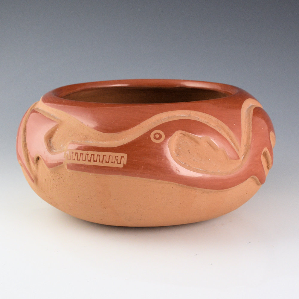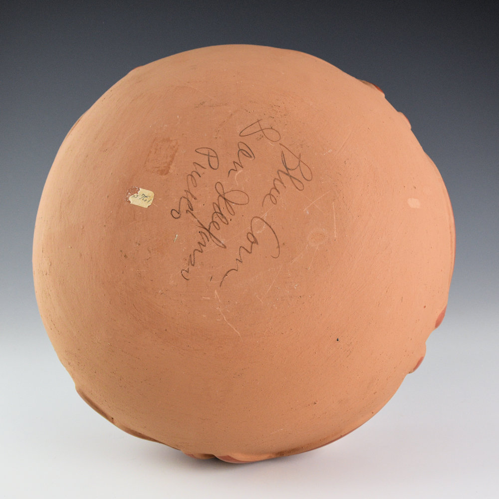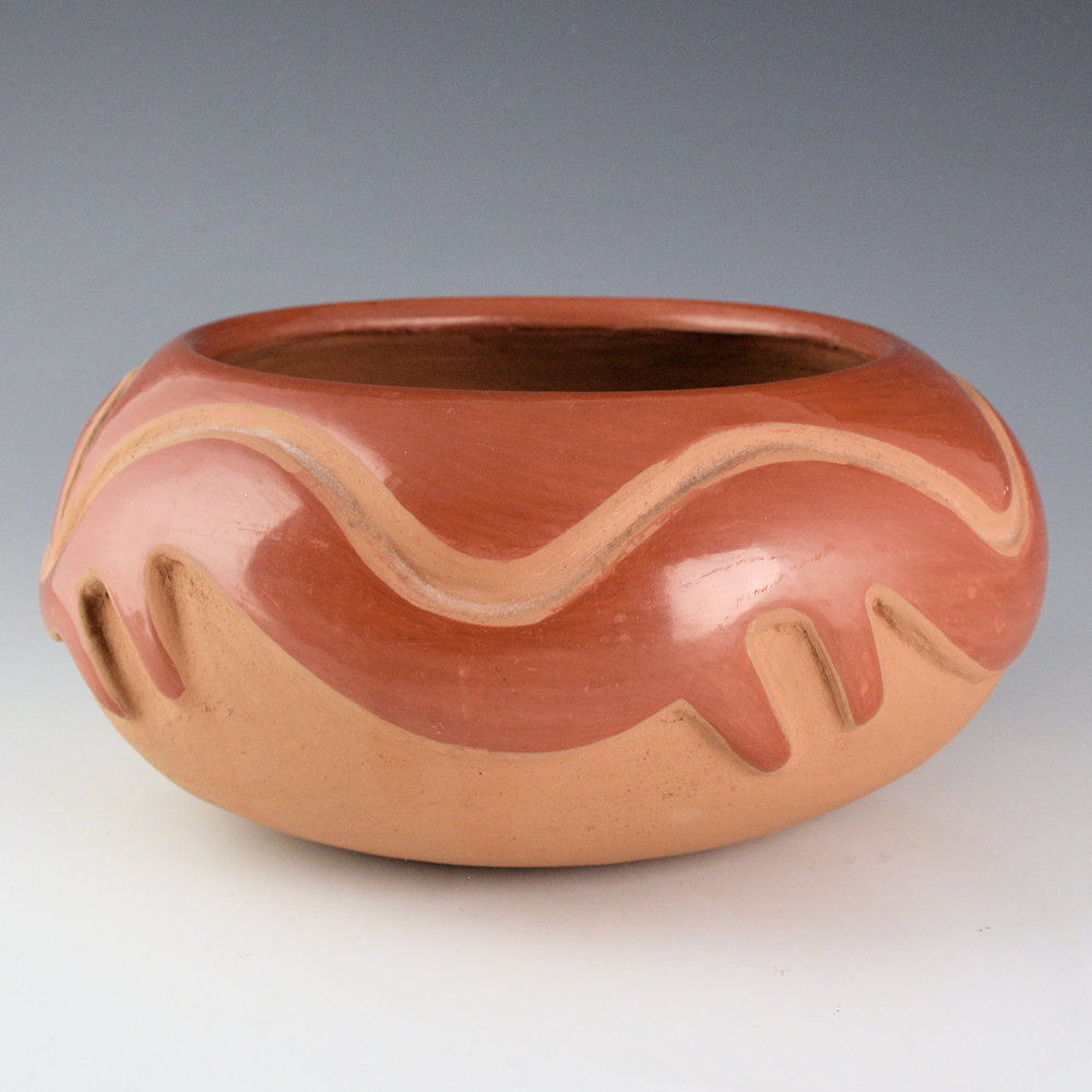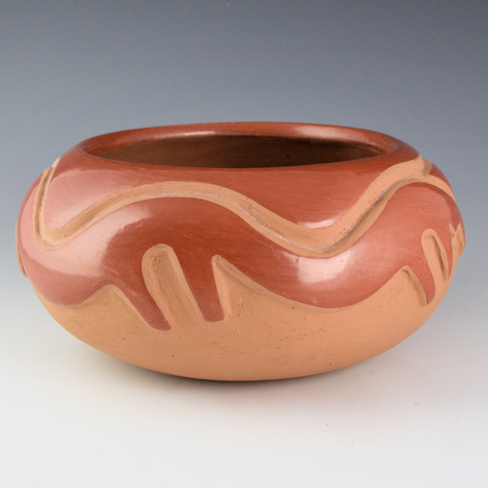 This bowl is one of the few deep-carved pieces by Blue Corn. Blue Corn began by making black-on-black pottery but it is her polychrome potter for which she is the most famous. This bowl is coil-built, carved, polished, painted, and traditionally fired. There is an avanyu carved into the clay encircling the piece. The background area that is carved away is slipped with a buff colored clay. The bowl was traditionally fired red. It is signed on the bottom in the clay, “Blue Corn” and is from the early 1970s. The bowl is in very good condition with no chips, cracks, restoration or repair. “.