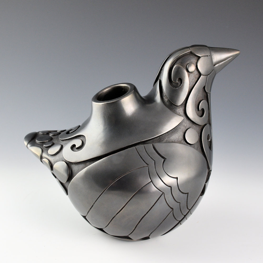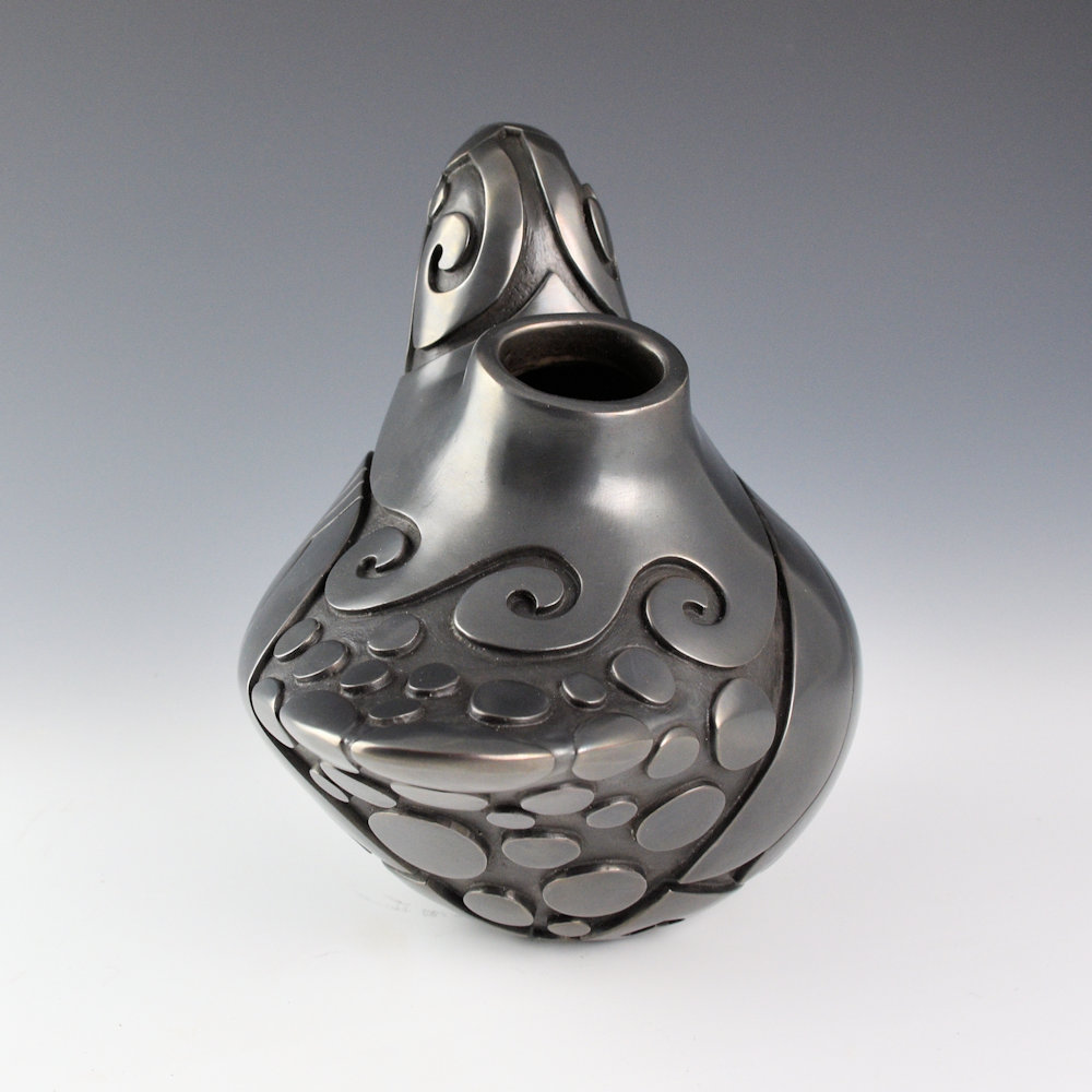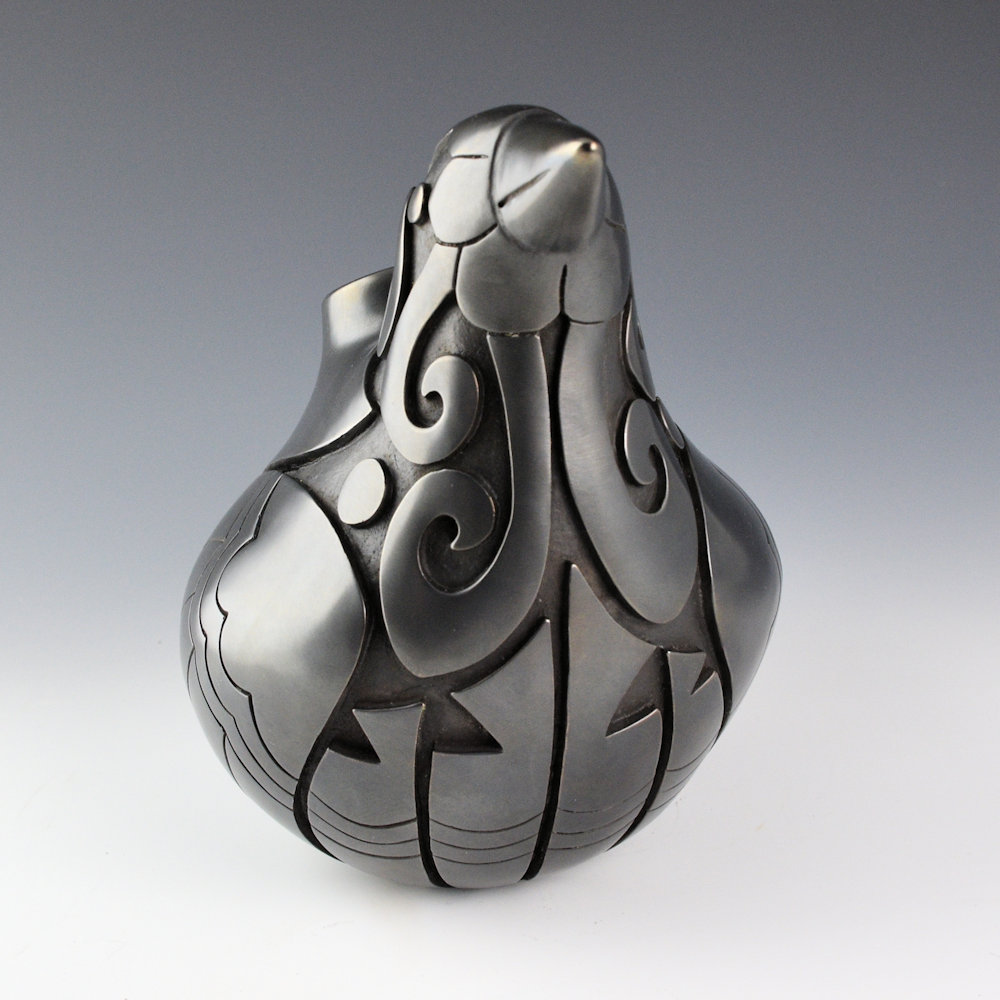 Autumn Borts-Medlock is known for her creative carved pottery. As well, she has created some dynamic pieces in bronze over the past few years. This bronze is entitled “Crow Vessel”. This piece is number 5 of 9. The gunmetal patina gives the piece a striking appearance. It is signed and numbered on the bottom.