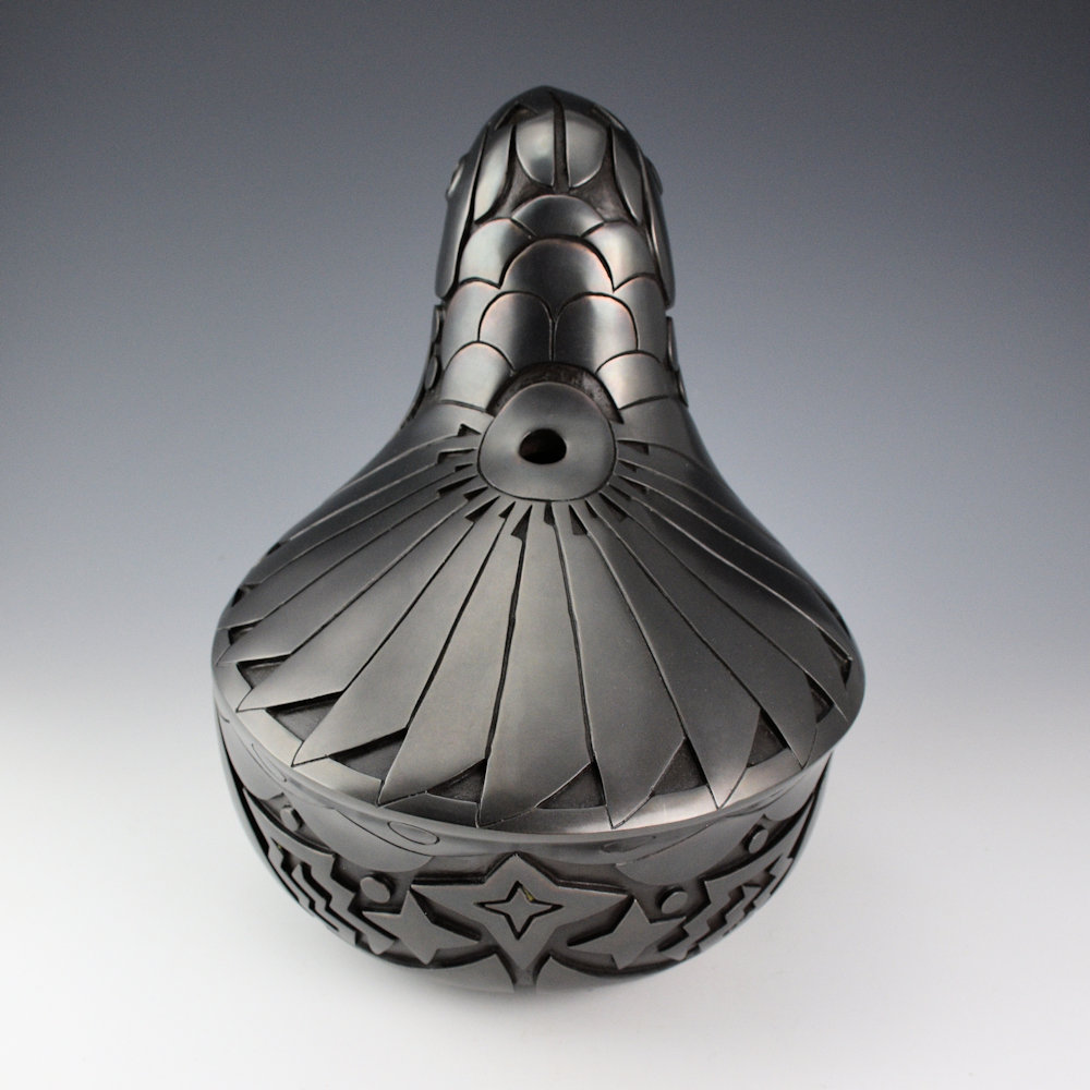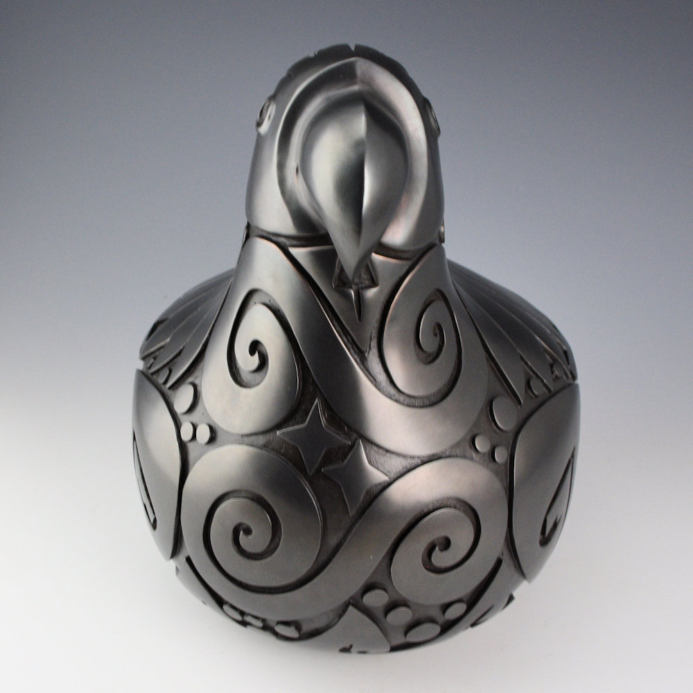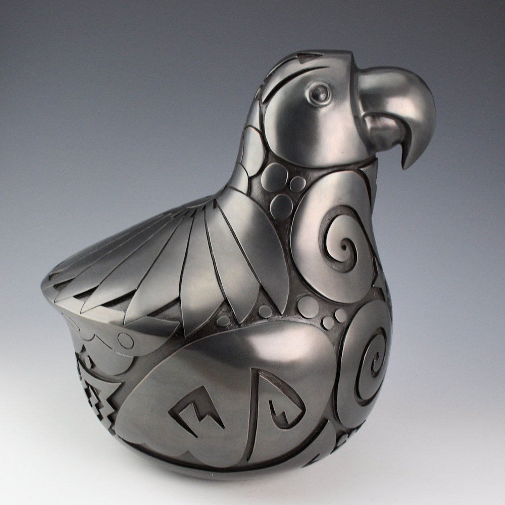 Autumn Borts-Medlock is known for her creative carved pottery. As well, she has created some dynamic pieces in bronze over the past few years. This bronze is entitled, “Chaco Parrot”. It is stylized much like the thick-billed parrot, which was actually native to the New Mexico area in the past. It also has a connection to the Ancestral Puebloan bird figures created at places such as Chaco Canyon. The bird is carved with a feather pattern on its back and stars wind and rain patterns on its sides. Autumn says she was inspired to create her parrots after a two-day excursion to Chaco Canyon. This piece is number 17 of 35. The patina is a metallic gunmetal coloration. It is signed and numbered on the bottom.