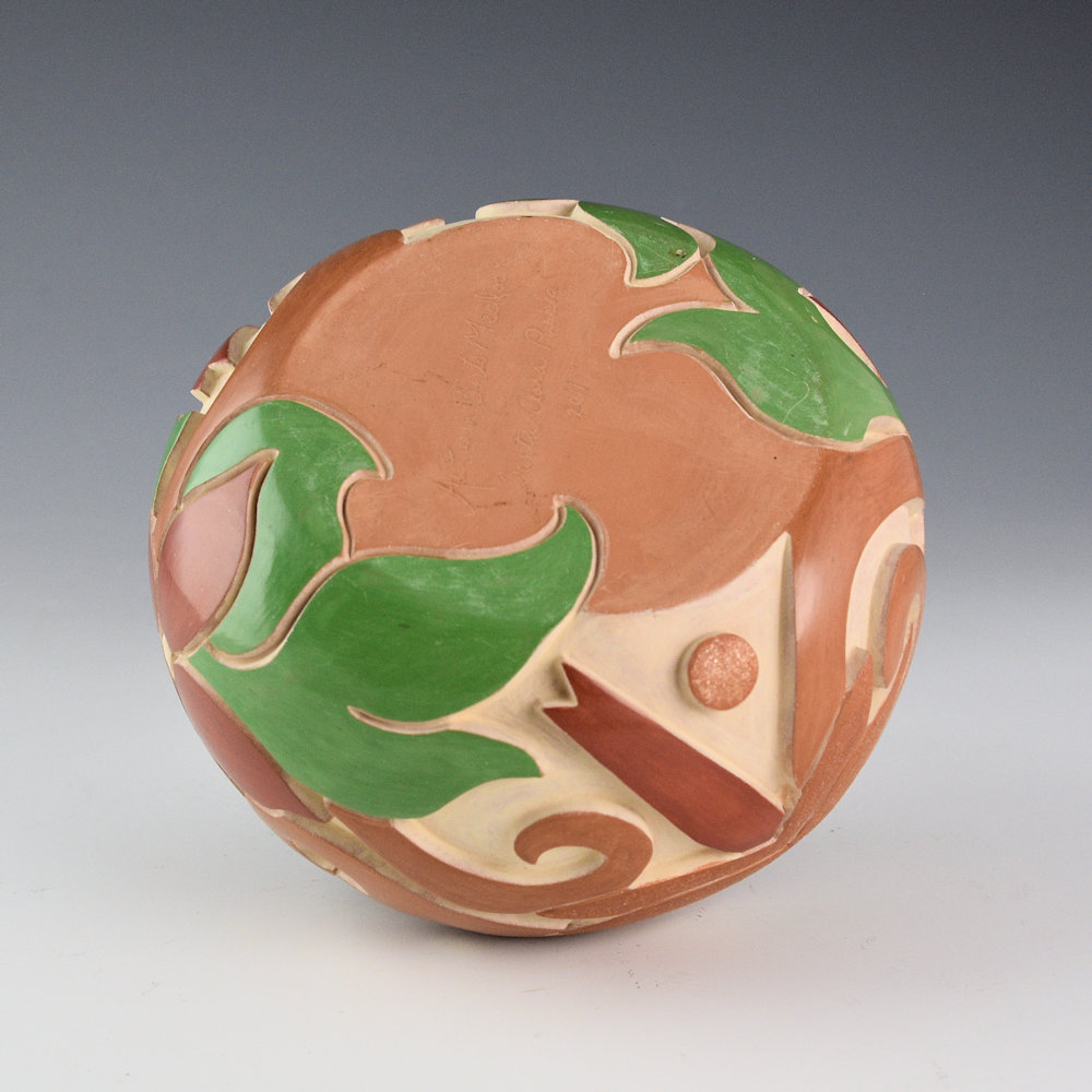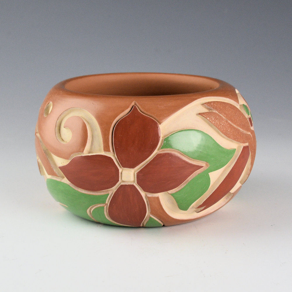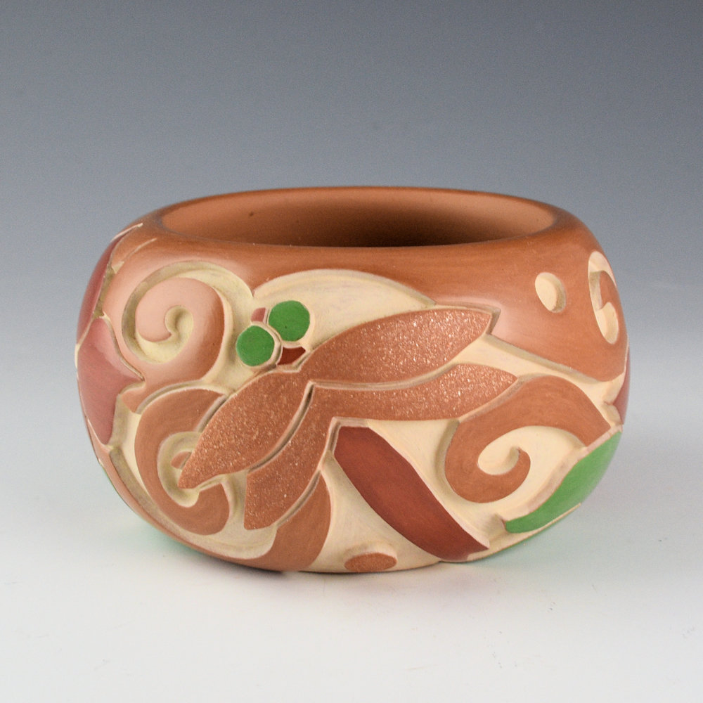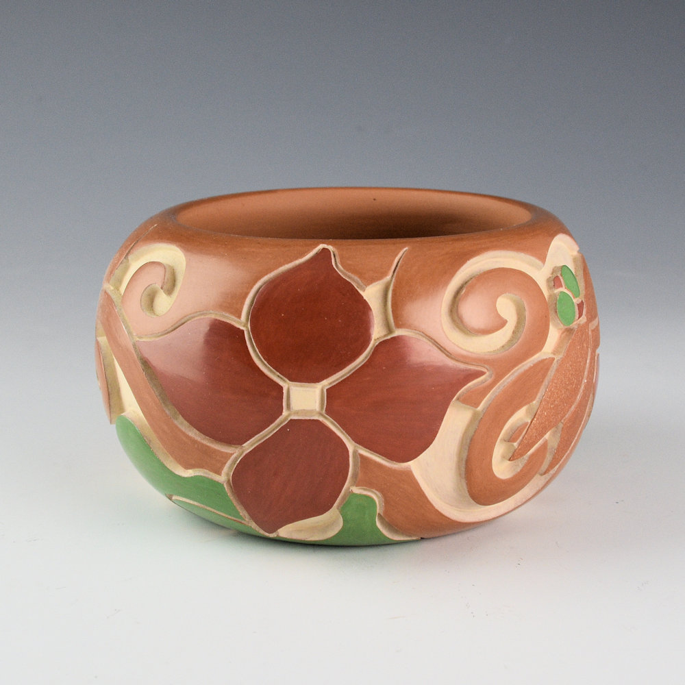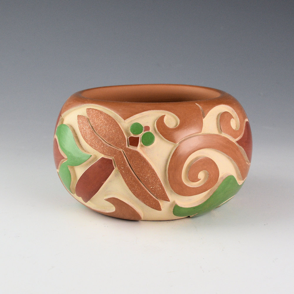 This is a fully carved bowl by Autumn Borts-Medlock. She is known for her often fancifully carved pottery. This bowl has a round shape. It is carved with two dragonflies and flowers. The flowers are polished red and green. The dragonflies are polished red and green with micaceous wings. The rim and base are fully polished tan, the natural color of the clay. It is a creative piece in size, design, color, and complexity! It is signed, “Autumn Borts-Medlock”. It is in excellent condition with no chips, cracks, restoration or repair.