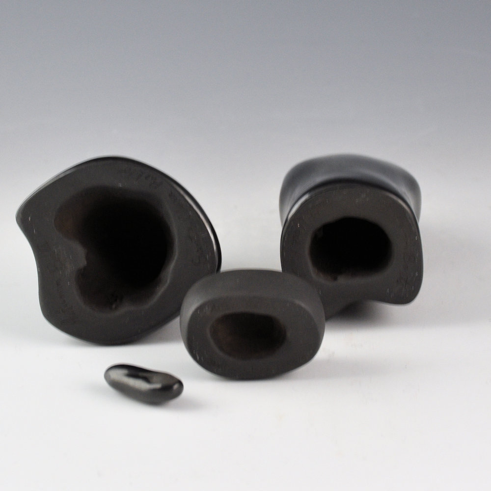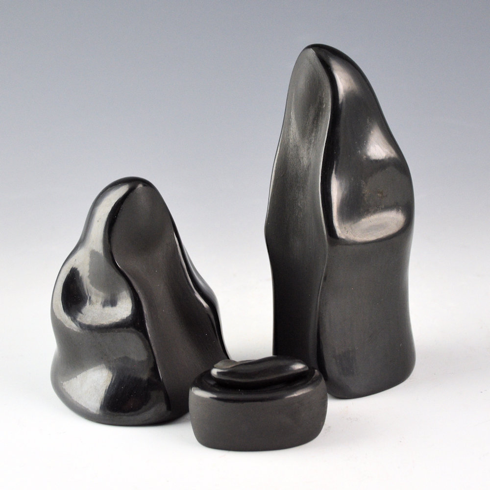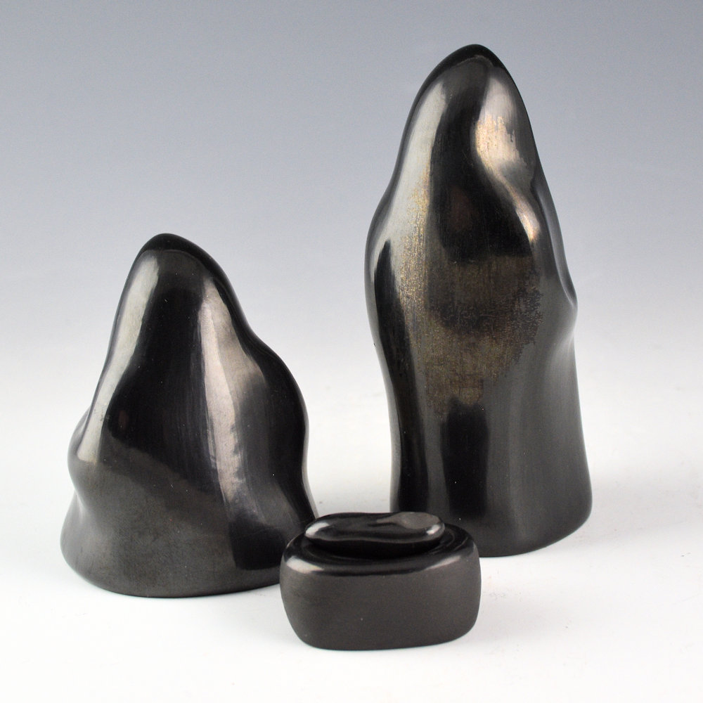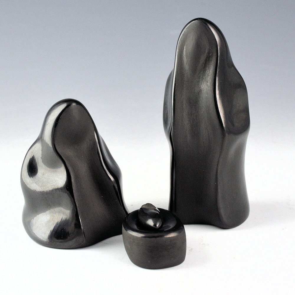 Autumn Borts-Medlock (Santa Clara) is known for her creative carved pottery and figurative work. Her clay parrots have become iconic of her pottery forms. This is one of her famous nativity sets. The figures of Mary and Joseph have polished cloaks and matte bodes. Baby Jesus is polished and sits in a polished manger. It is a charming and creative set! The pieces are signed on the bottom in the clay, “Autumn Borts-Medlock”.