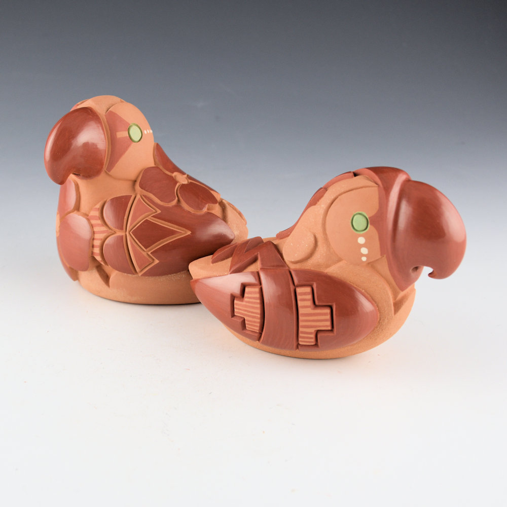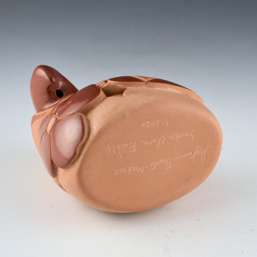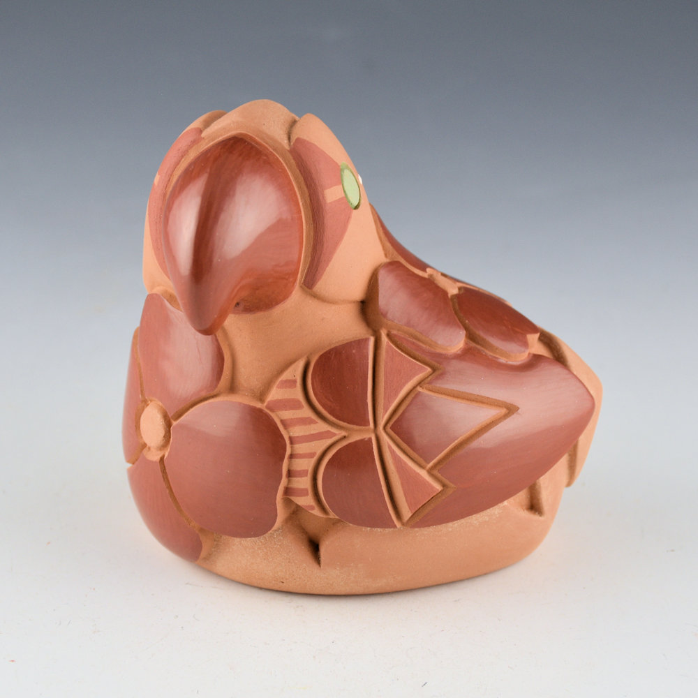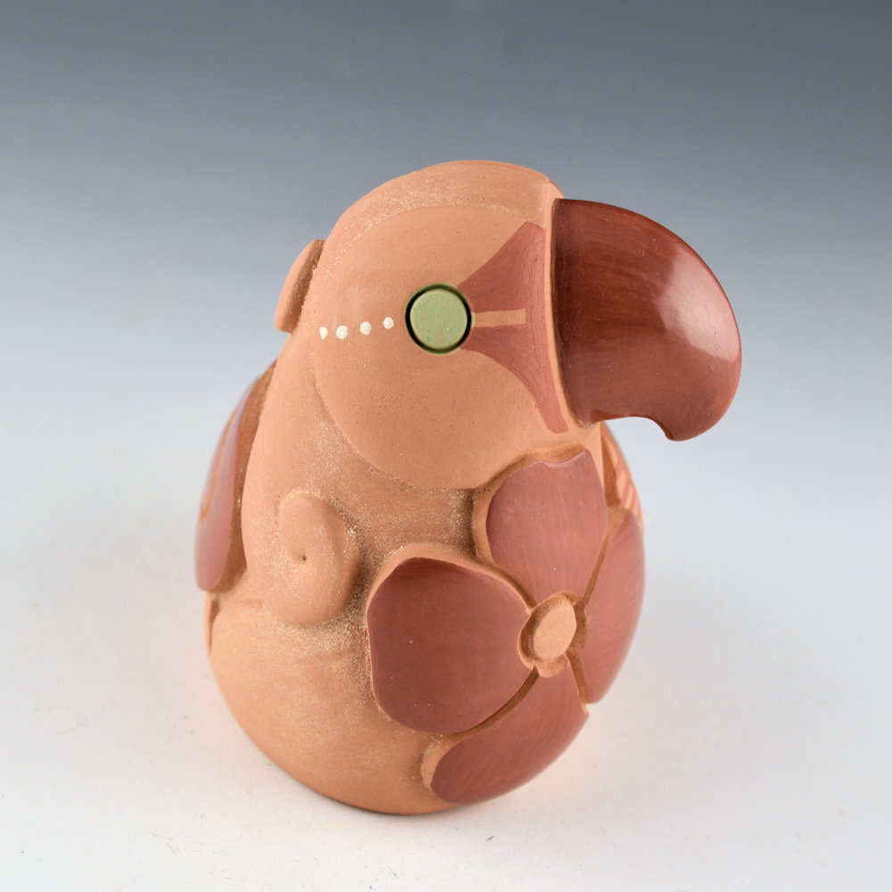 Autumn Borts-Medlock’s effigy parrots have certainly become a signature piece of her pottery. The parrots are coil-built, then carved, and stone-polished. This new parrot is carved with carved wings on the side. You might notice that the wings are carved in the style of a raincloud and there are painted rain lines as well! The back and front of the bird have carved flowers. The head and neck are carved in various levels with swirling clouds. It is a striking use of carving techniques, depth, polished, matte, and micaceous surfaces. The parrot has green slipped eyes and white clay dots extending backward. The lower body of the parrot is slipped with mica. As well, note how she polished the beak of the parrot, which is always the most difficult part of the polishing process, so that the tip doesn’t chip or break. The parrot is complex and creative in color and design. The parrot is signed, “Autumn Borts-Medlock, 2026”.