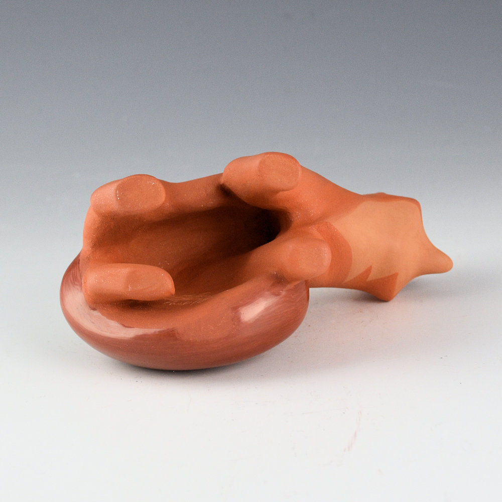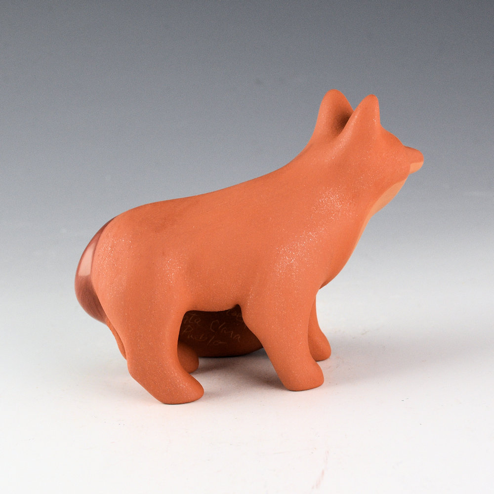 Autumn Borts-Medlock (Santa Clara) is known for her creative carved pottery and figurative work. Her clay parrots have become iconic of her pottery forms. This fox is coil-built and the body is matte while the tail is polished. The front of the fox has a white clay slip and the top of the tail is etched.. In person, there is something charming about the form, but also the flow of the polished and matte surfaces. The tail is stone polished. It is sculpted to create the appearance of a fox. The piece is signed on the bottom in the clay, “Autumn Borts-Medlock, 2025”.