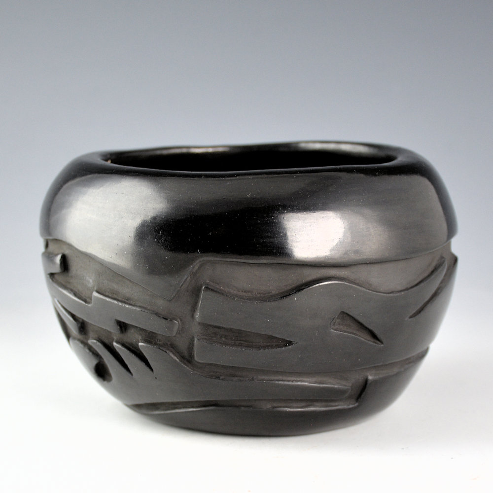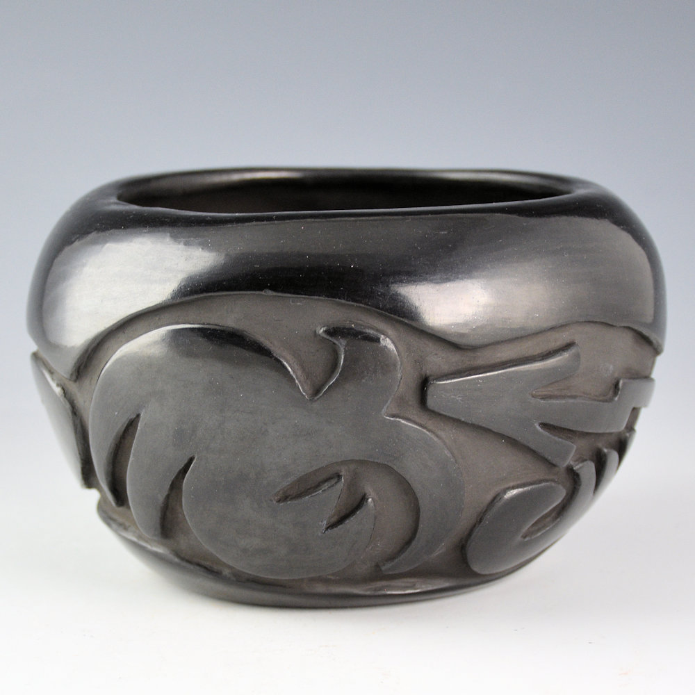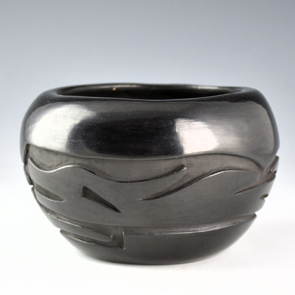 Mary Cain was a daughter of Christina Naranjo and a granddaughter of SaraFina Tafoya. She was known for her classic style of carved and polished Santa Clara pottery. Keith Tanin is a son of Margie Tanin and a nephew of potters Tina Diaz, Linda Cain, Joy Cain, and Billy Cain. He is a grandson of Mary Cain and a great-grandson of Christina Naranjo. This bowl was made by Keith and then carved and polished by Mary. It is carved with an avanyu. It is fully polished and fired a deep black coloration. The piece is signed, “Keith Tanin, Mary Cain”. It is in excellent condition with no chips, cracks, restoration, or repair.