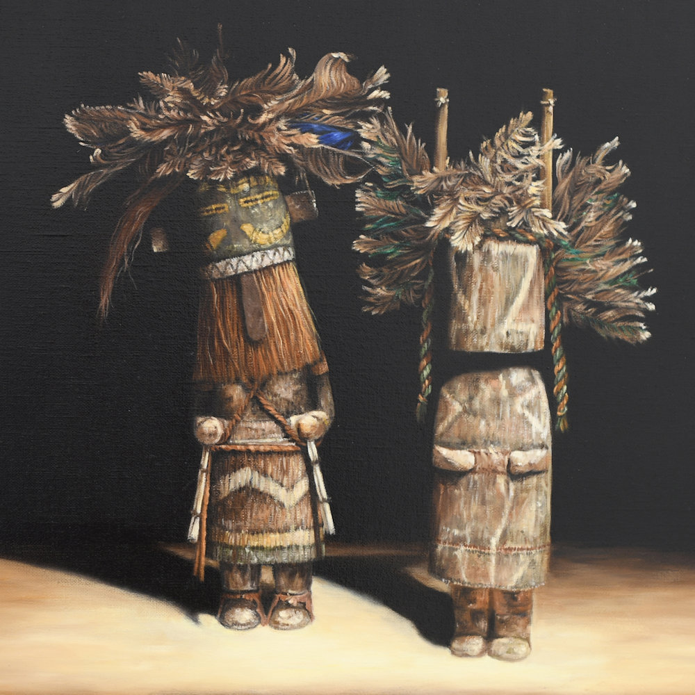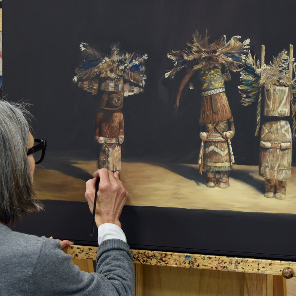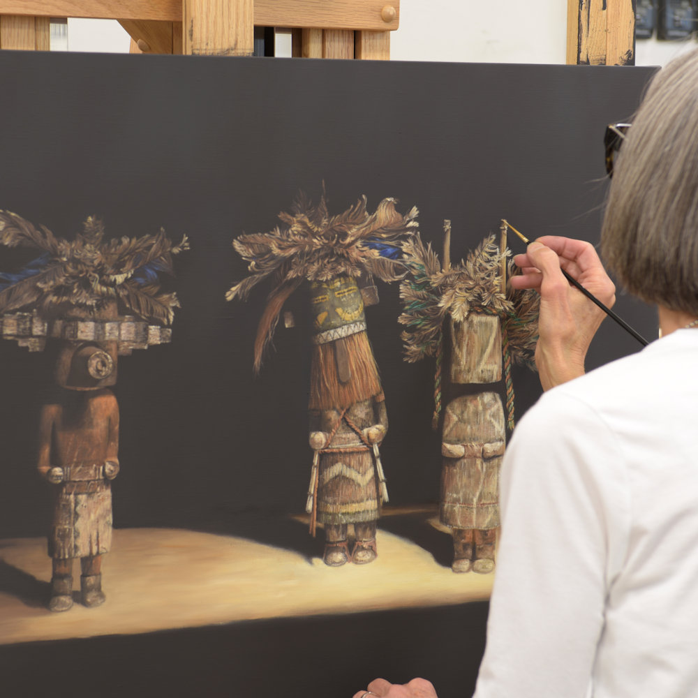 This painting began with an introduction to Tayron Polequaptewa, a member of the Hopi tribe, well known for his artistic integrity and craftsmanship carving traditional old style katsinas. I was so taken by his work and soon collecting one katsina became two and so on…