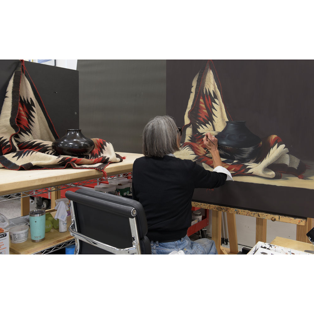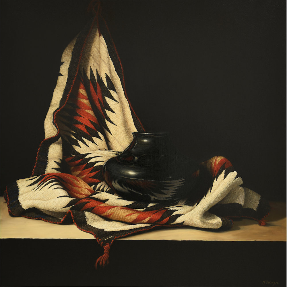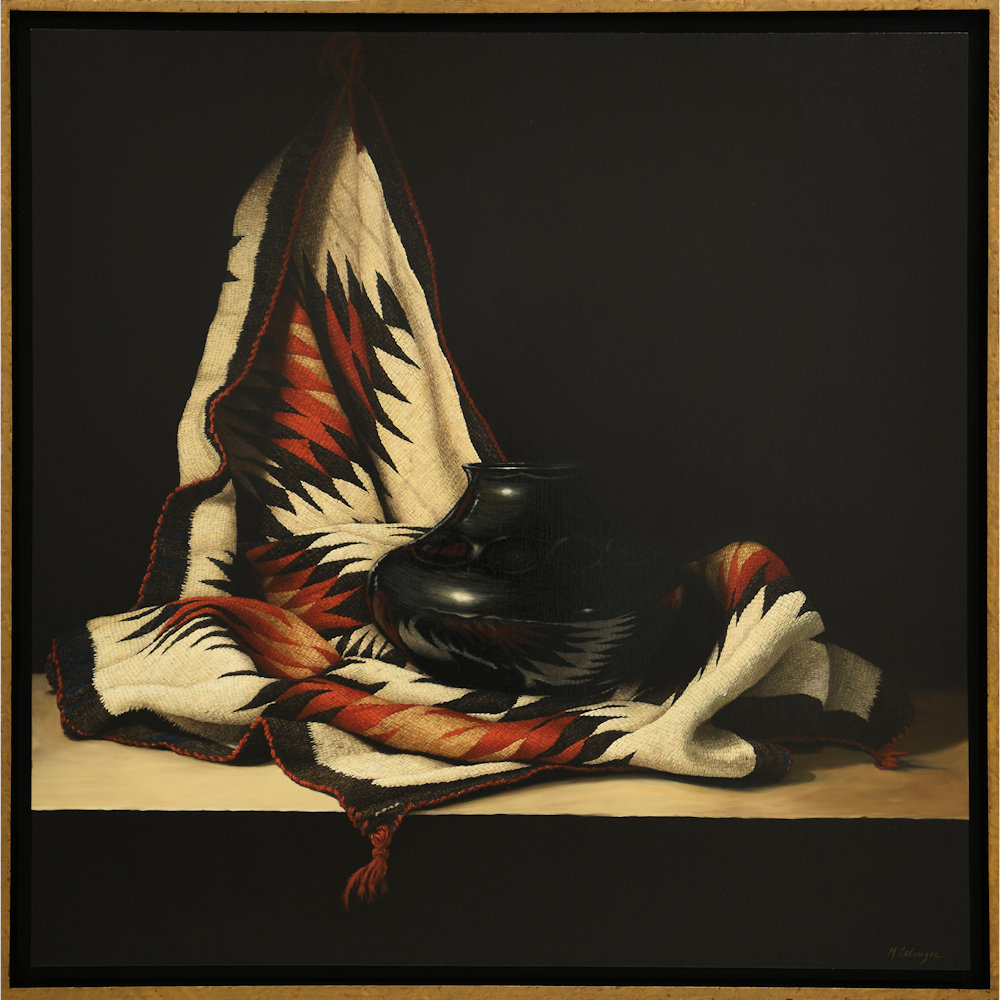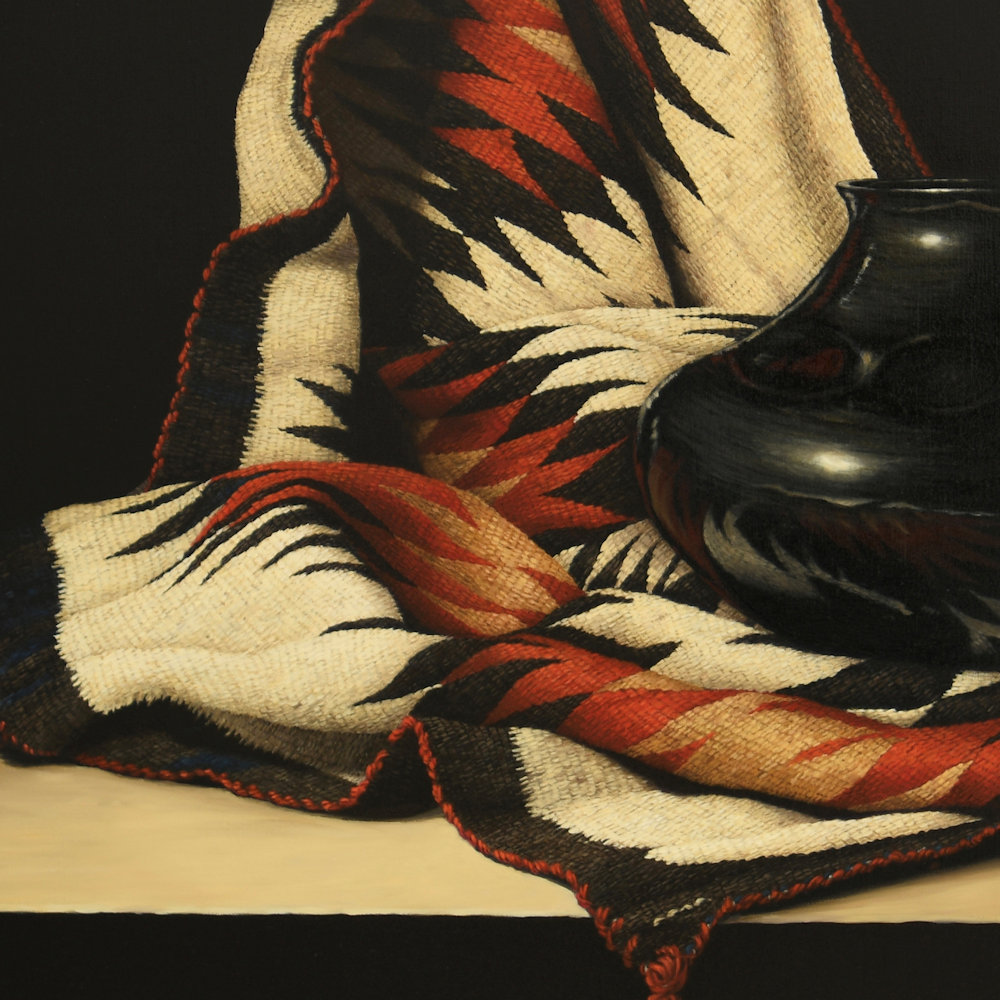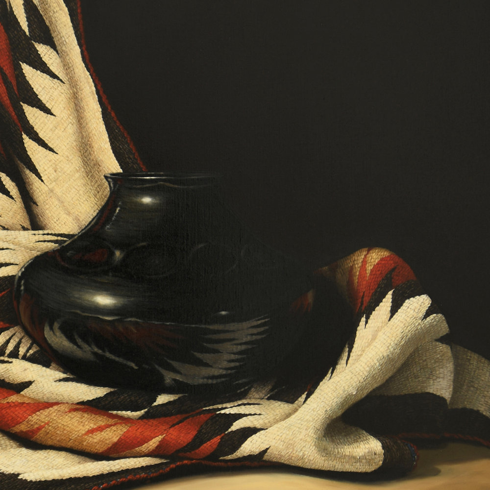 At King Gallery, where my work is represented, there is the most impressive collection of Native American pottery. Every piece is incredible but I am very drawn to the pots and jars that are fired to a black finish. I found this gourd jar there by artist Sharon Naranjo-Garcia and fell in love with it for its graceful form and stone polished glass-like finish. I decided this beautiful piece of art should be captured as the main focus of a painting and I knew the polished finish would be a very interesting challenge. That proved true. Getting the black color just right took some experimentation and capturing the reflection of the blanket really brought it to life.