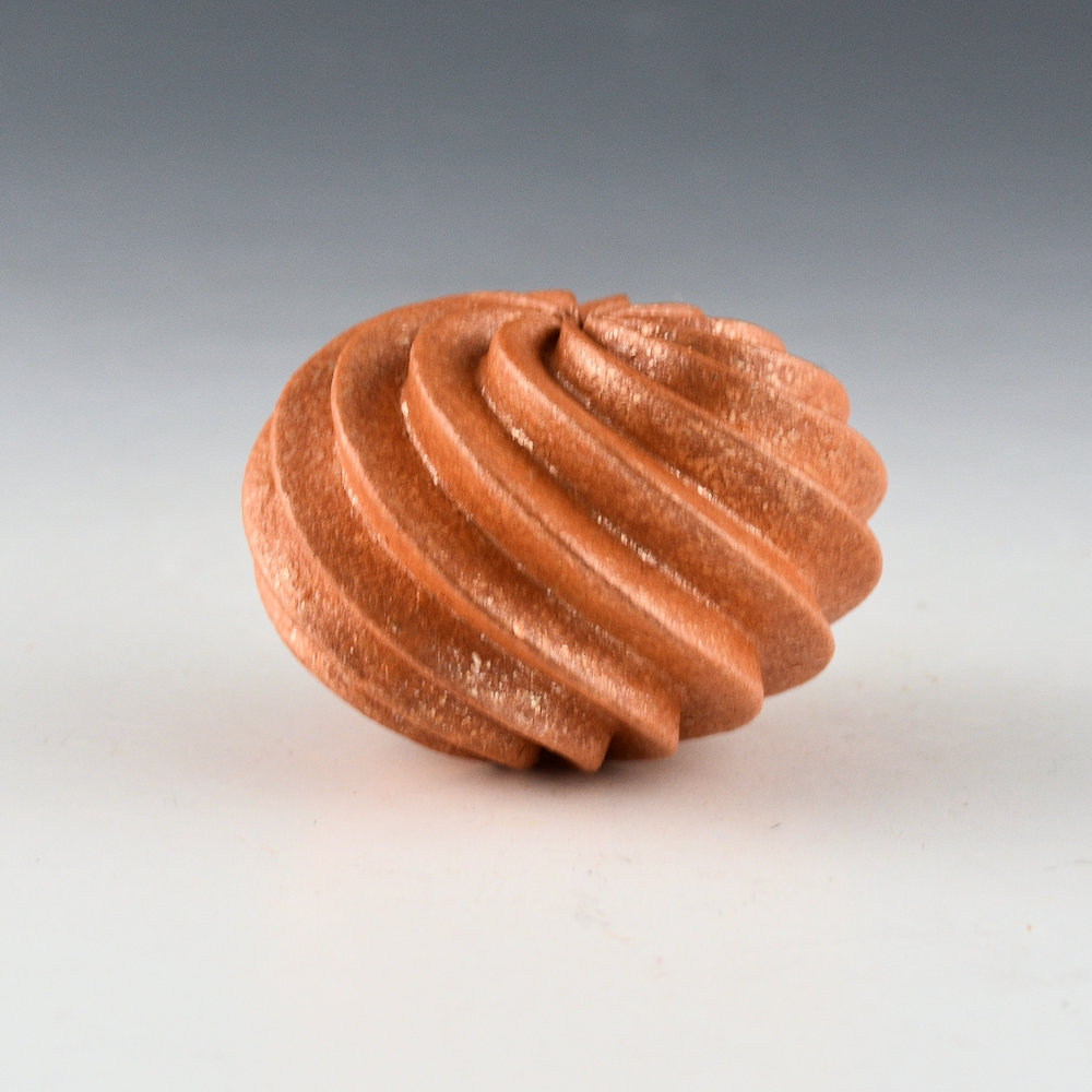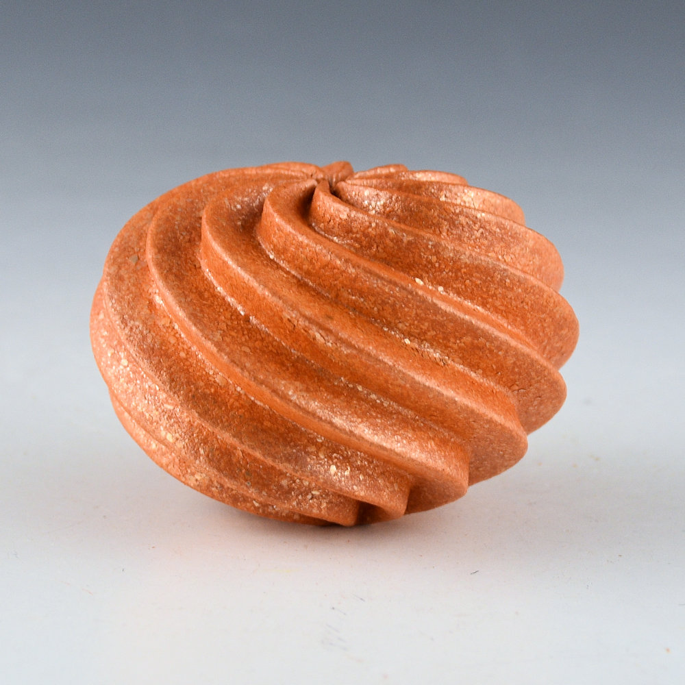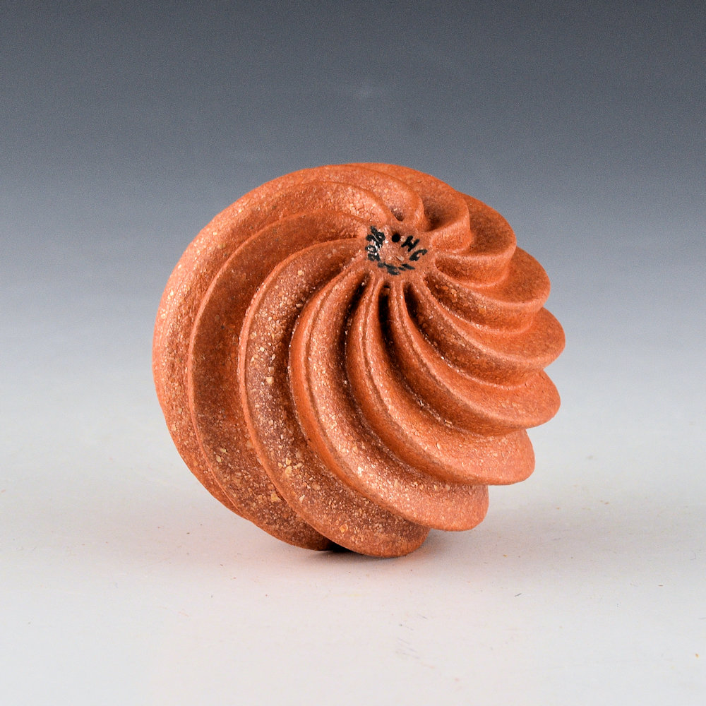 Hubert Candelario is one of the few potters working at San Felipe Pueblo. This new piece is one of his small melon bowls with eleven carved ribs. They each have a sharp edge and swirl from the rim to the base. They are slipped with micaceous clay, which gives the piece its color and sparkle. Did you know that Hubert will apply up to eight coats of mica to get an even tonality to his pottery! This seedpod is signed, “H C 2026” on the bottom.