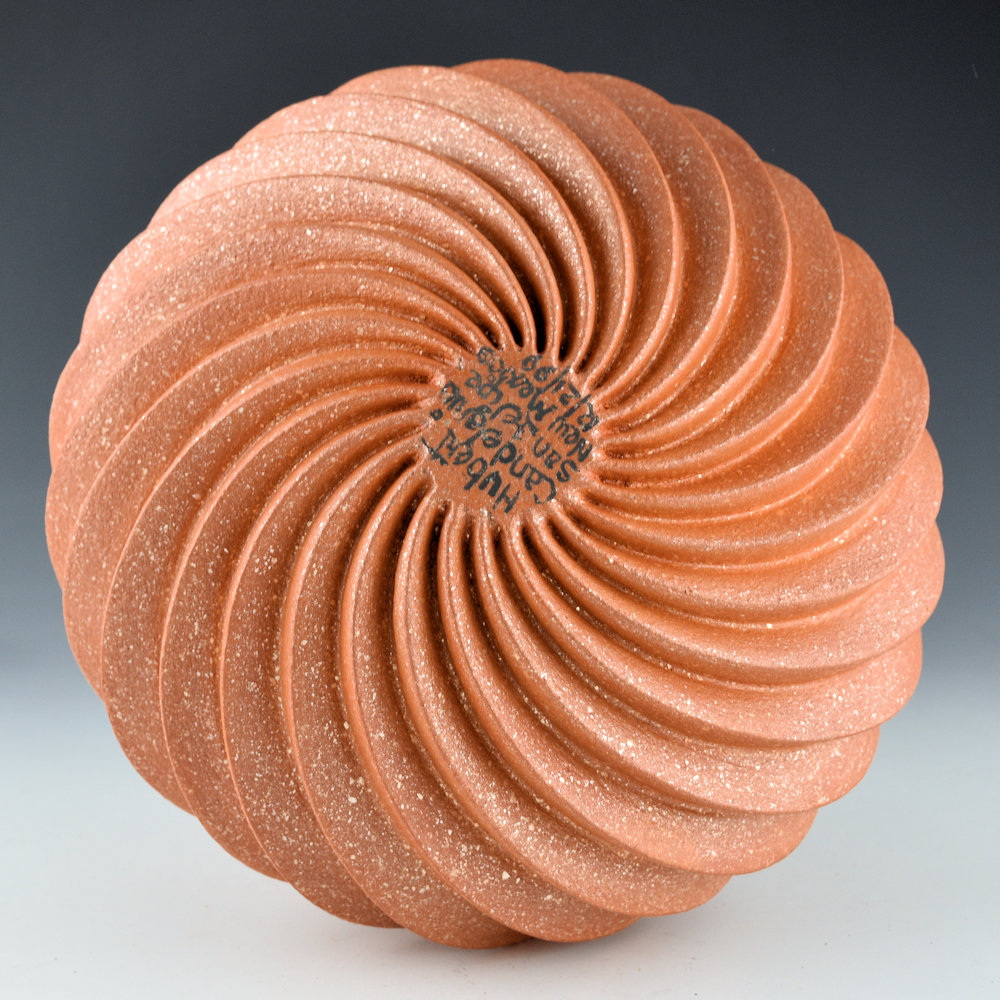 Hubert Candelario is one of the few potters working at San Felipe Pueblo. This is one of his melon classic melon bowls with 24 ribs. Each rib is carved into the clay and has a sharp edge. Each one starts very narrowly at the neck and gets larger at the shoulder and narrows to the base. There is a beautiful symmetry that he is able to create with these pieces. The sharp edge creates a dramatic appearance on this piece. Each rib is slipped with a micaceous clay, which gives them their coloration and sparkle. Hubert applies five or more layers of micaceous clay to create an even tonality to the surface. The piece is signed on the bottom in the clay, “Hubert Candelario”. It is in excellent condition with no chips, cracks, restoration, or repair.