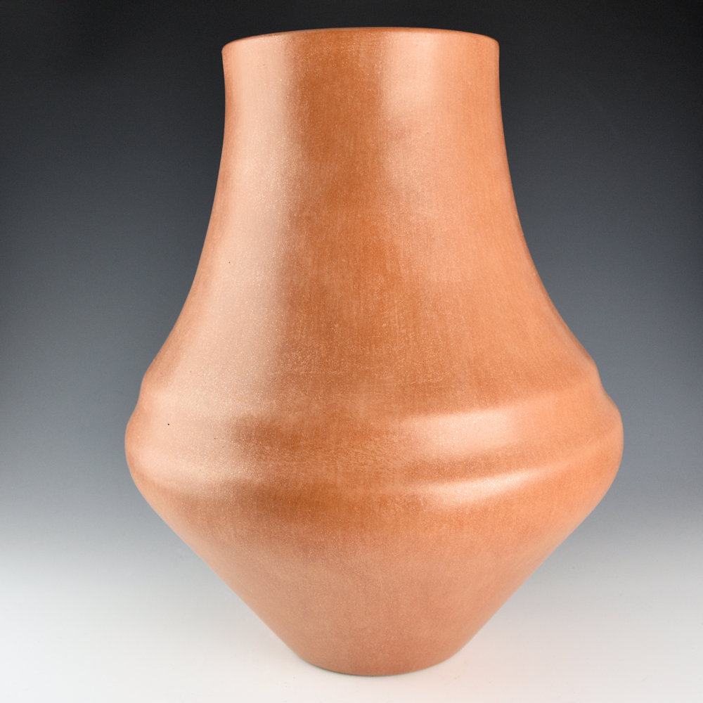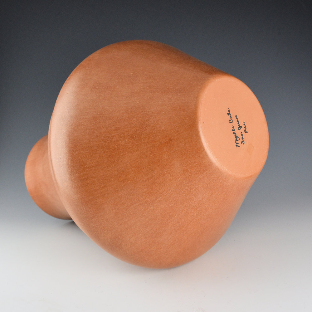 Myrtle Cata was born in San Felipe Pueblo and, when she married, moved to Ohkay Owingeh. She learned to make pottery from noted Santa Clara potter Tina Garcia. Myrtle has been making pottery since 1985 and works primarily in micaceous clay. This is an exceptional large water jar. It has a wide double shoulder, with an elongated neck. It is made with clay from Ohkay Owingeh but slipped on the surface with mica. The shape and color are elegant! It is in excellent condition with no chips, cracks, restoration, or repair. It is signed, “Myrtle Cata” on the bottom. While Myrtle no longer makes pottery, her work is a classic for Ohkay Owingeh pottery.