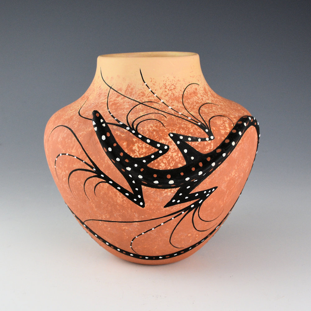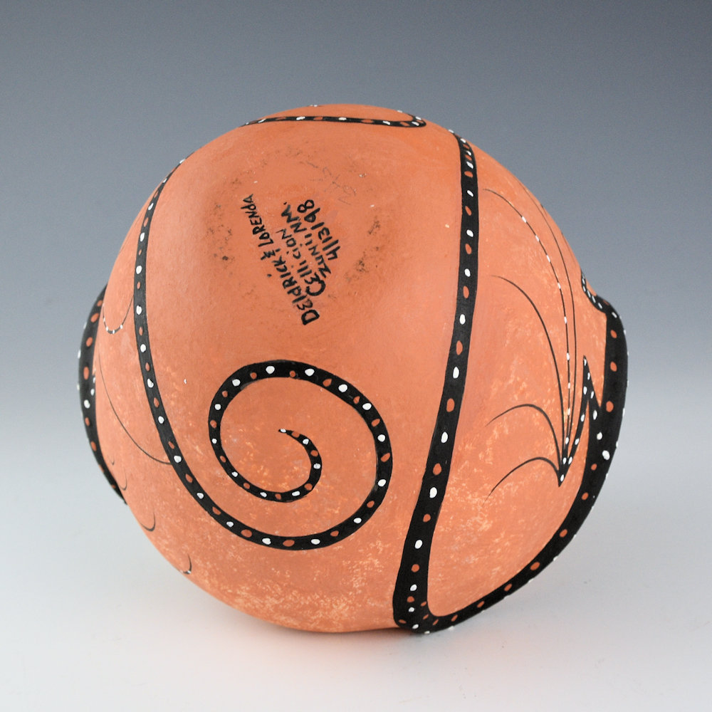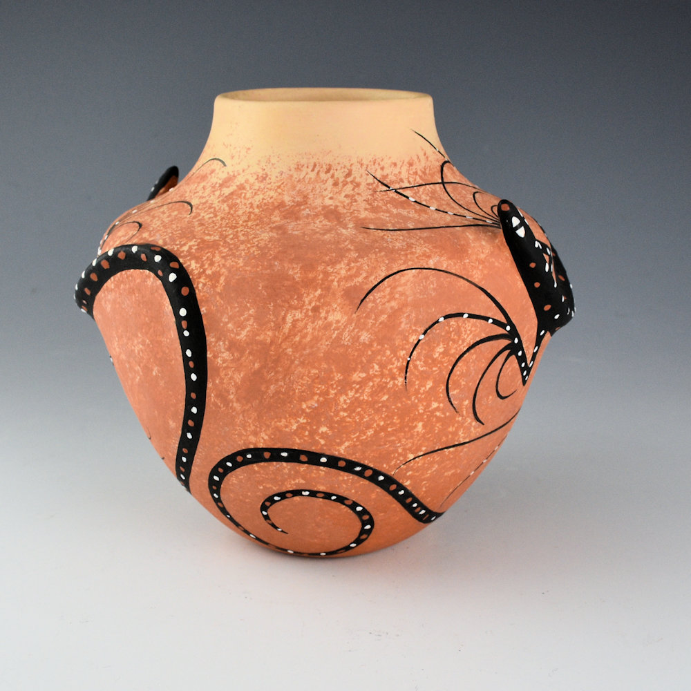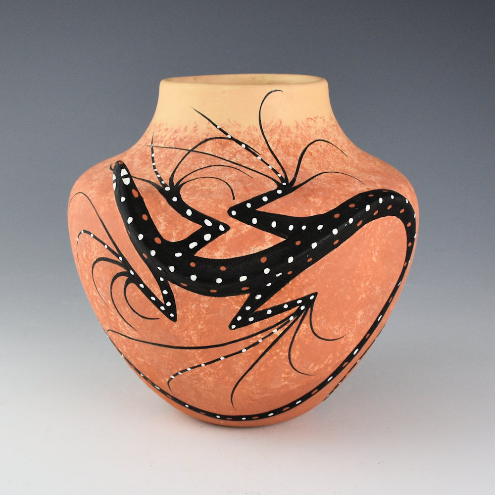 Deldrick and Lorenda Cellicion are known for their polychrome Zuni pottery. Each piece is coil-built. This jar has a round shoulder and a short neck. There are two lizards in relief on the shoulder of the jar. They are black and highlighted with white and red clay creating a texture on the dots. Below the shoulder, there is a speckled appearance from the red clay, as if the lizards were in the sand. The jar is signed, “Deldrick and Lorenda Cellicion”. It is in excellent condition with no chips, cracks, restoration, or repair.