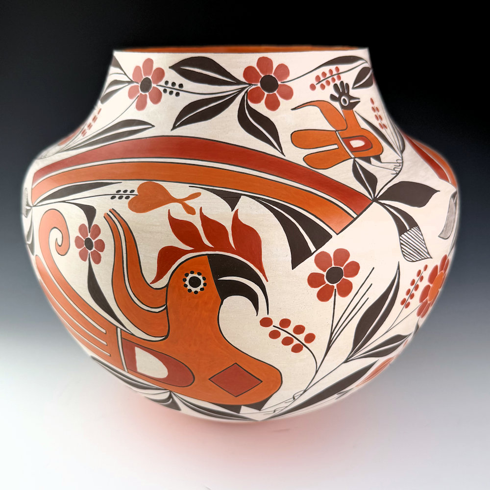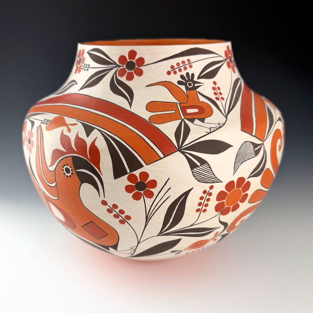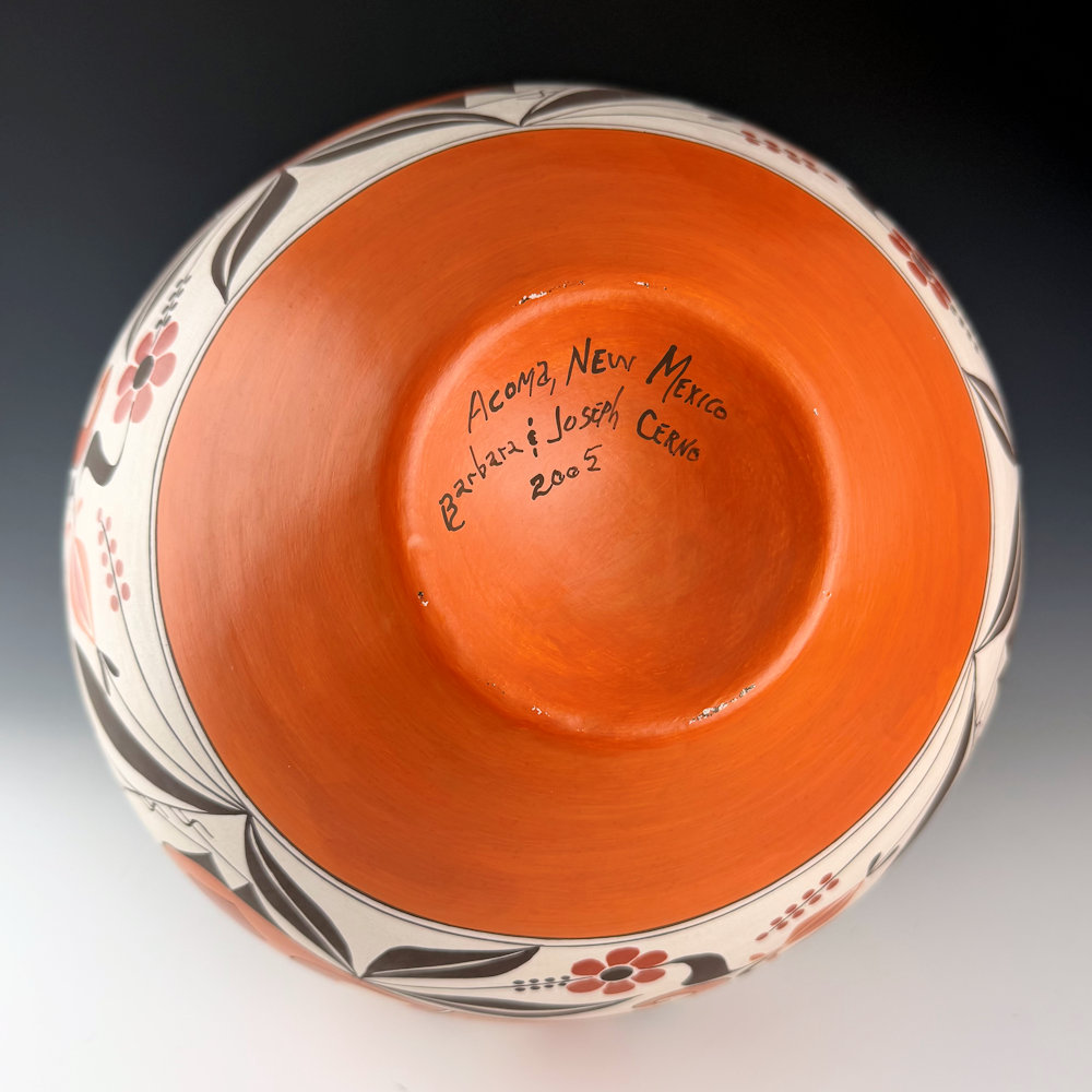 Joseph Cerno is known for his large coil-built vessels.  He also makes pieces with his wife, Barbara.  The jar is coil-built, and it is a classic water jar or “olla” shape with a high shoulder and a short, sloping neck.  The design is a striking variation of historic Acoma pottery with three large Acoma parrots and flowers, under two-colored double rainbows.   Along the neck are three more Acoma birds with more flowers.  All the various colors are from natural clay slips, and the black is bee-weed. The jar is one of the more complex patterns that flow across the surface of the piece.  The bottom is slipped red and has an indented bottom, which again harkens back to the Acoma pottery of the late 1800s. The jar is signed on the bottom “Barbara & Joseph Cerno”.  It is from 2005, and it is in excellent condition with no chips, cracks, restoration, or repair.  It is certainly a wonderful contemporary Acoma vessel with a dramatic use of revivalist designs and techniques.