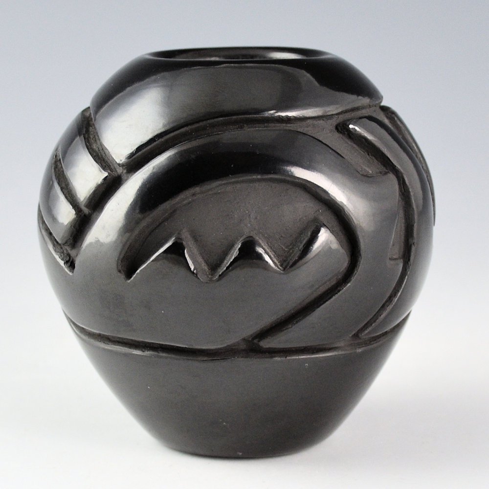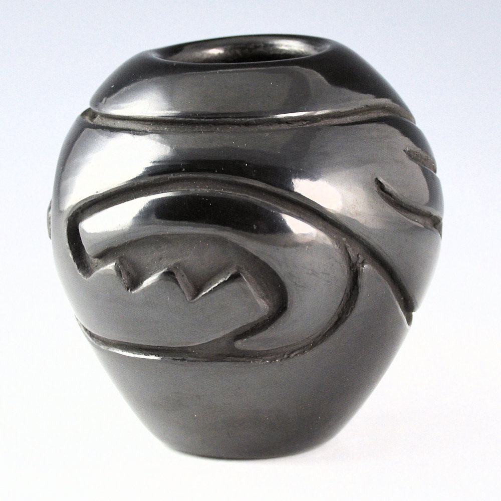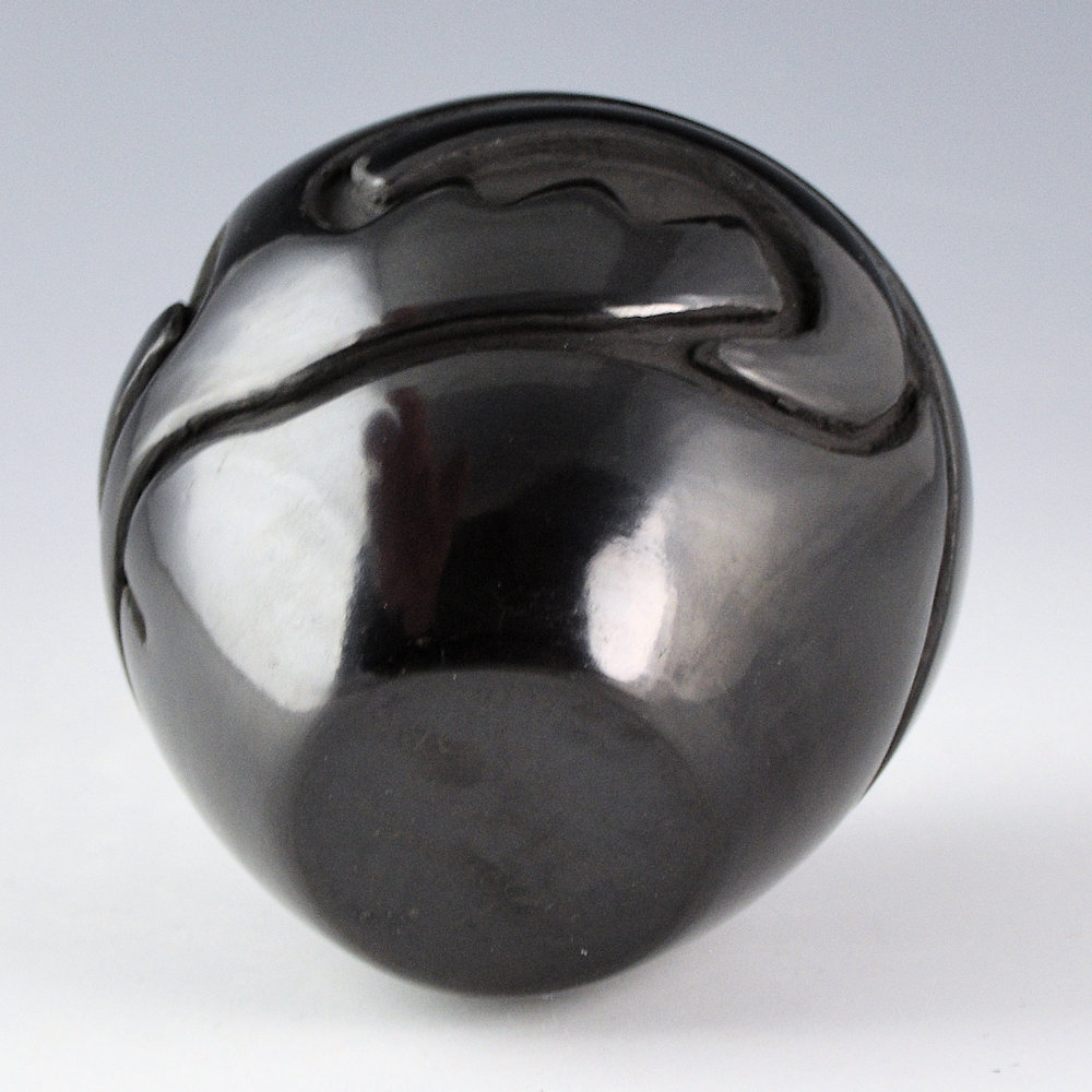 Denise Chavarria is a daughter of noted potter Stella Chavarria and a granddaughter of Teresita Naranjo. She is known for her contemporary pottery. This jar is fully carved with traditional cloud, rain and a river design. The carving is fluid and much of the design on this piece is reminiscent of the pottery of her grandmother, Teresita. It is fully polished and fired a deep black. It is signed on the bottom in the clay, “Denise Chavarria”.