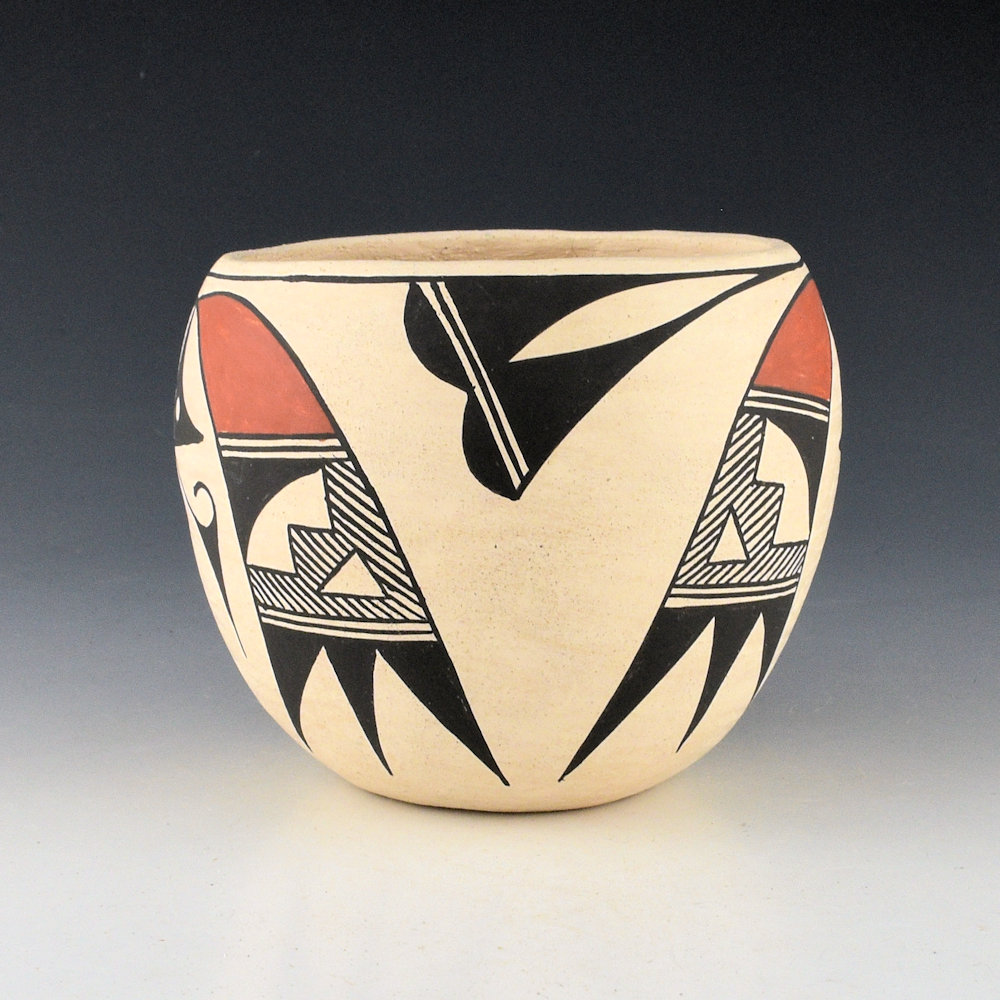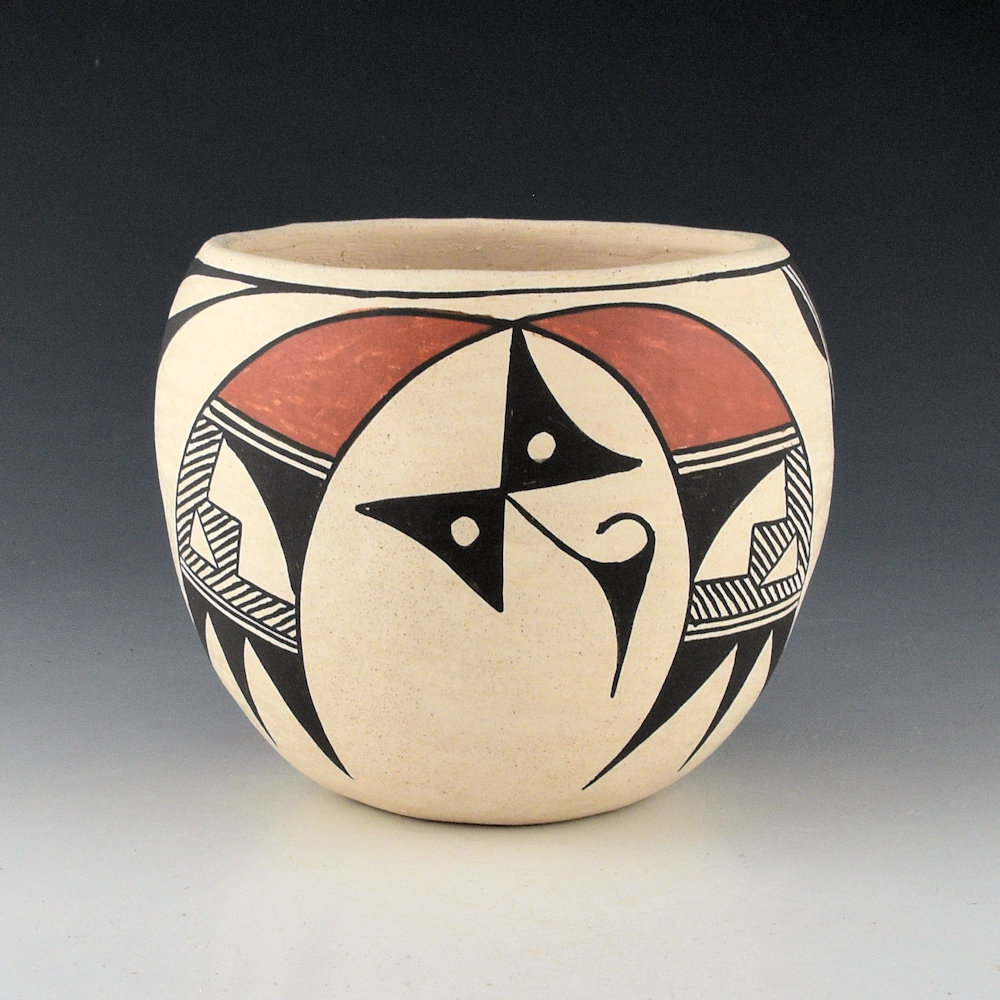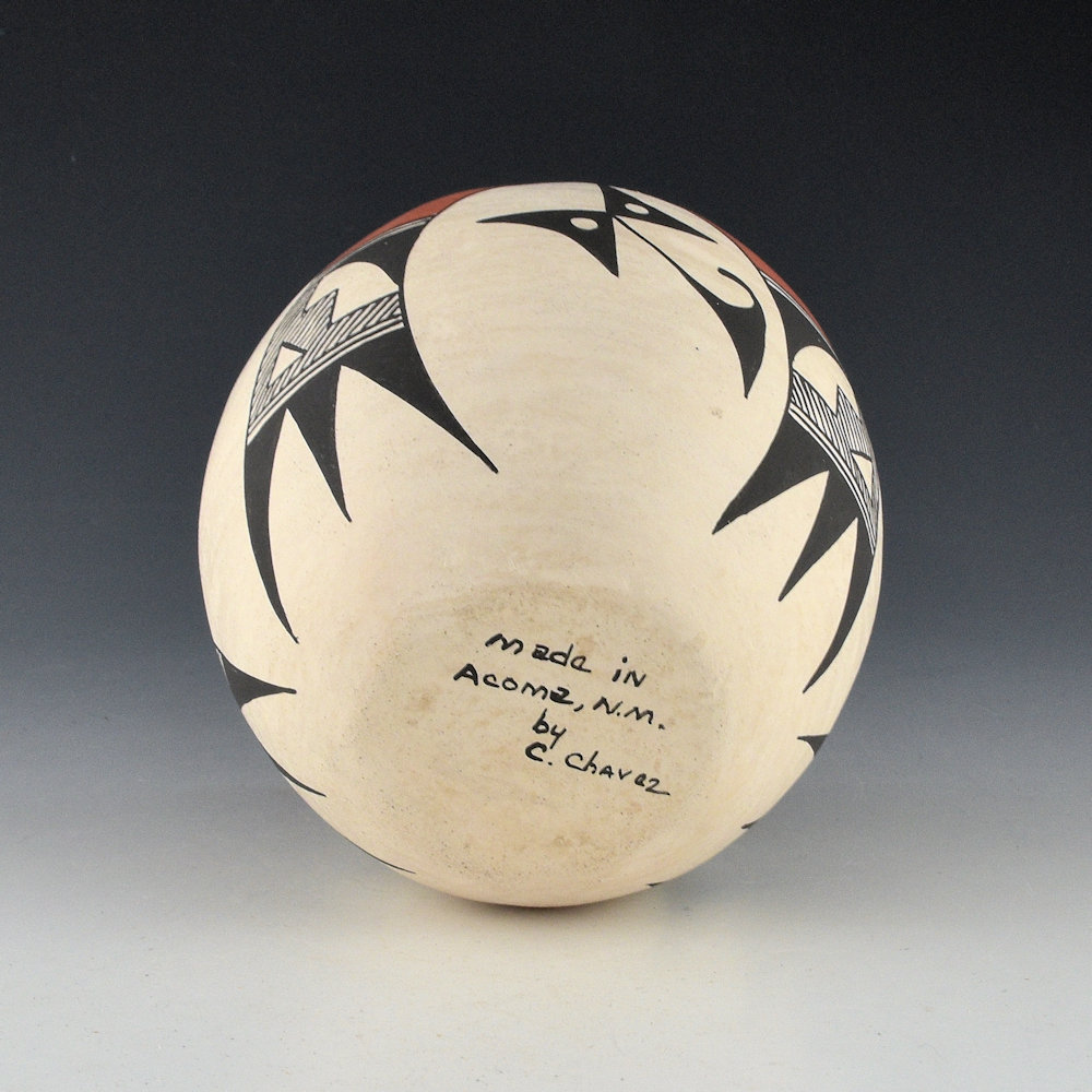 Clara Chavez (1922-1984) was a daughter of noted Acoma potter Mary Histia. This jar is coil-built from native clay, and it is painted with bee-weed (black) and clay slips. The bowl has two Acoma birds on each side with red painted heads. Between them is an old-style butterfly. The bowl traditionally fired so it has some color variation on the surface. It is signed, “C. Chavez”. It is in very good condition with no chips, cracks, restoration, or repair.