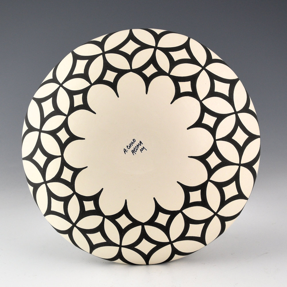Alicia Kelsey Chino (b. 1979) is a daughter of noted potter Darla Davis and a granddaughter of Rachel JWhite. She learned to make pottery from her mother. She is known for her traditional style designs. This seedpot is coil-built. The piece has a complex fine-line design in the center on the top. Extending outward are geometric designs that are a series of interlocking stars. The design is complex and visually striking. It is signed on the bottom, “A. Chino”.