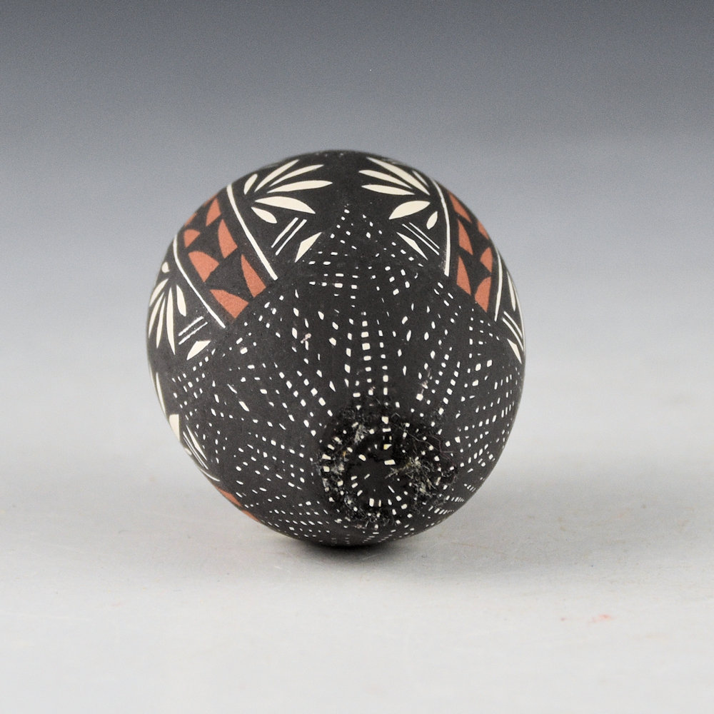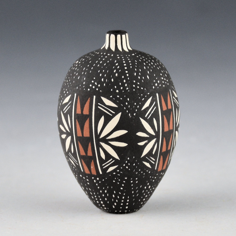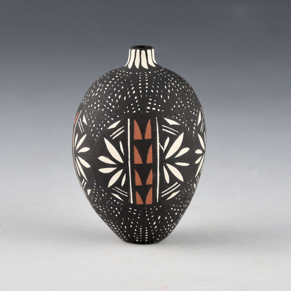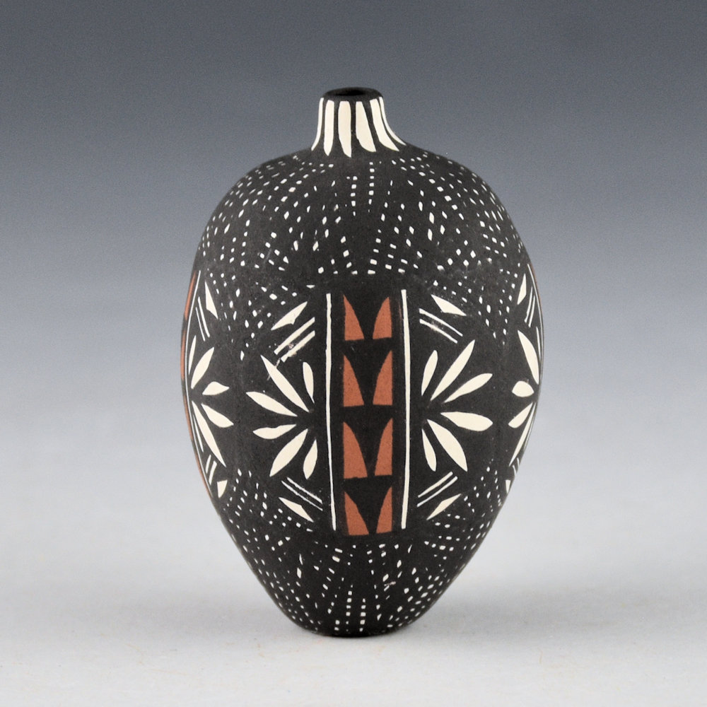 Brian Chino was a son of noted potter Edna Chino and a brother of Jay Vallo and Corrine Chino. He began making pottery in 1988. This is one of his classic miniatures. The jar is fully painted with very thin lines to create an interlocking star pattern on the top and bottom. Around the center are plant designs. The neck has a TINY feather pattern. This piece is signed, “B. C.” on the bottom. It is in excellent condition with no chips, cracks, restoration, or repair.